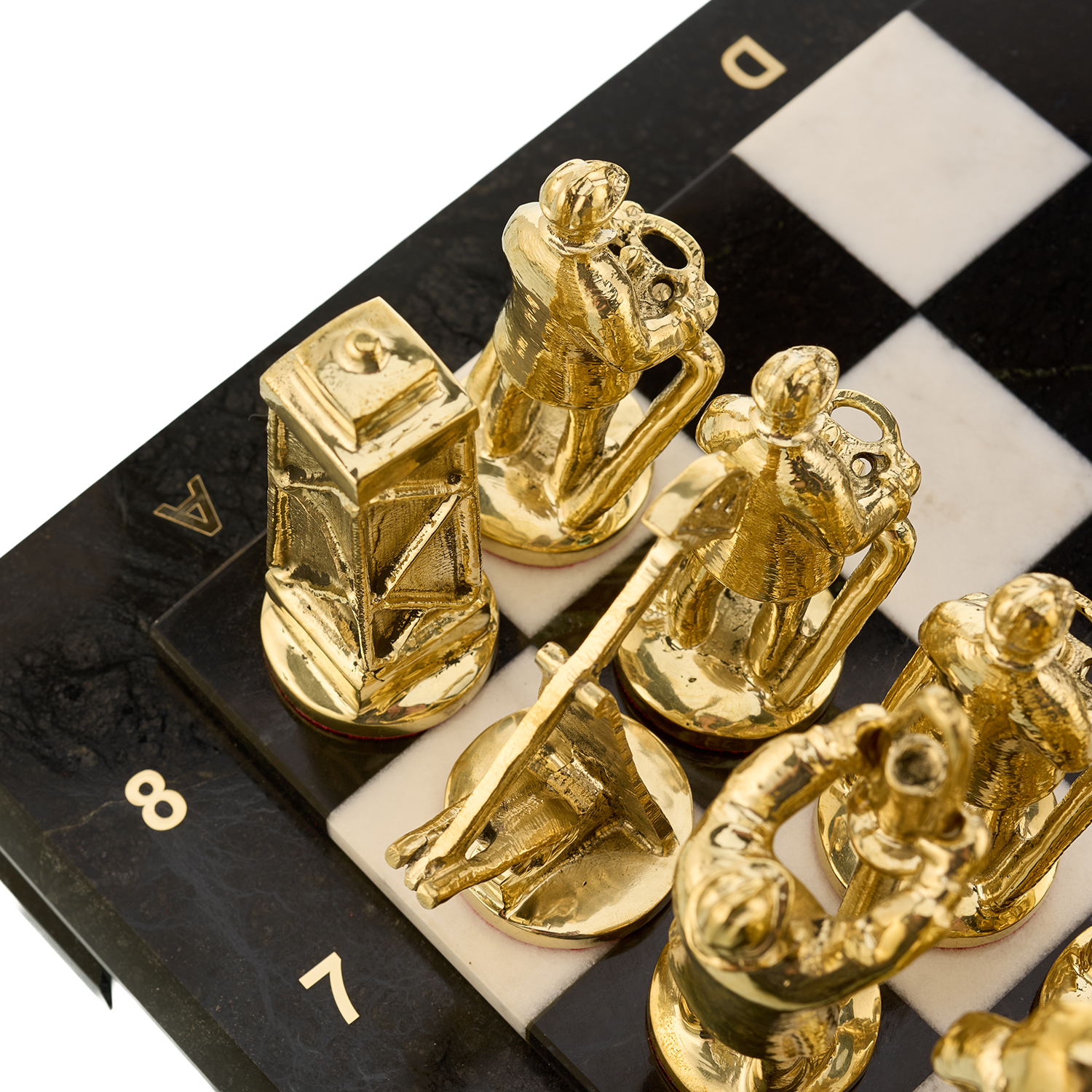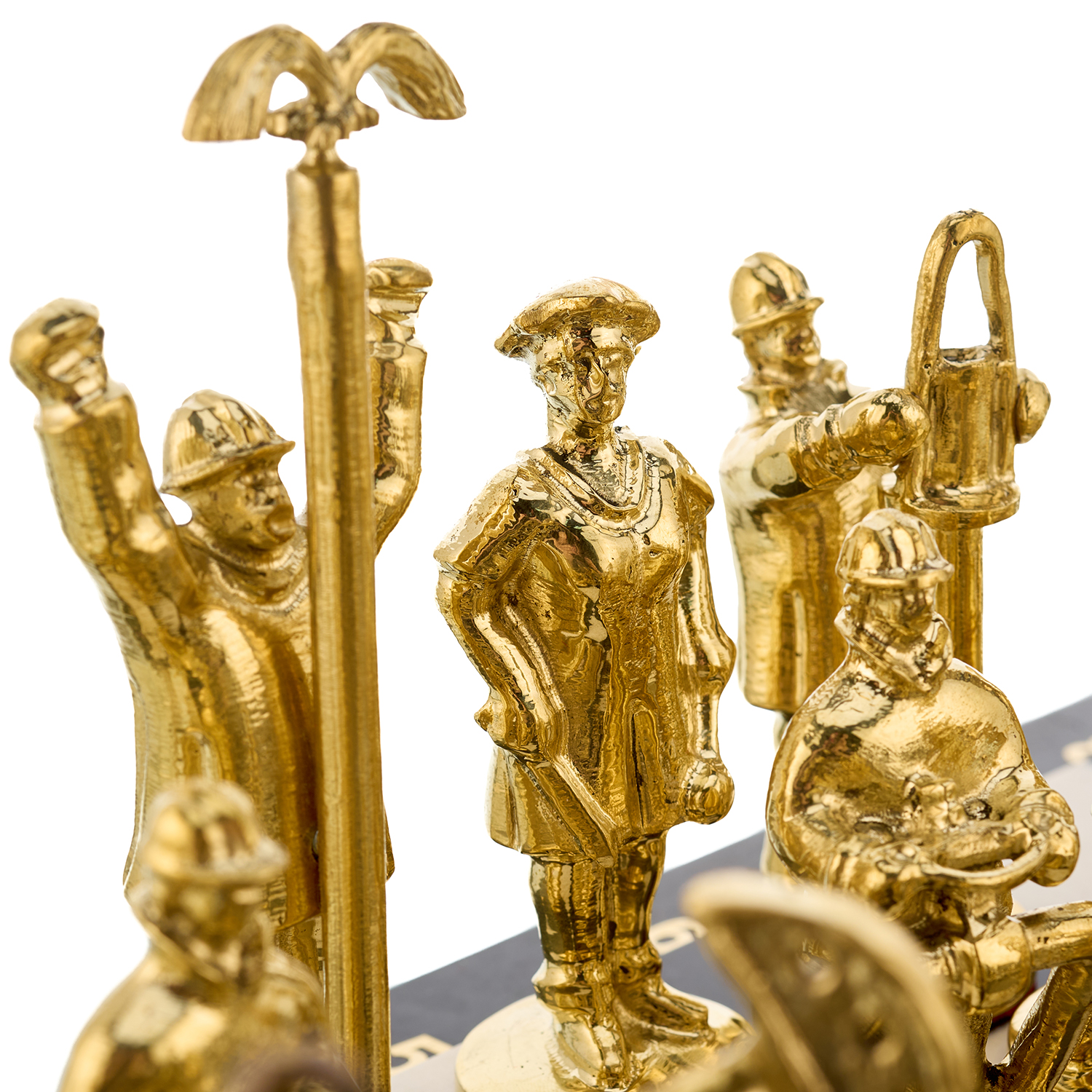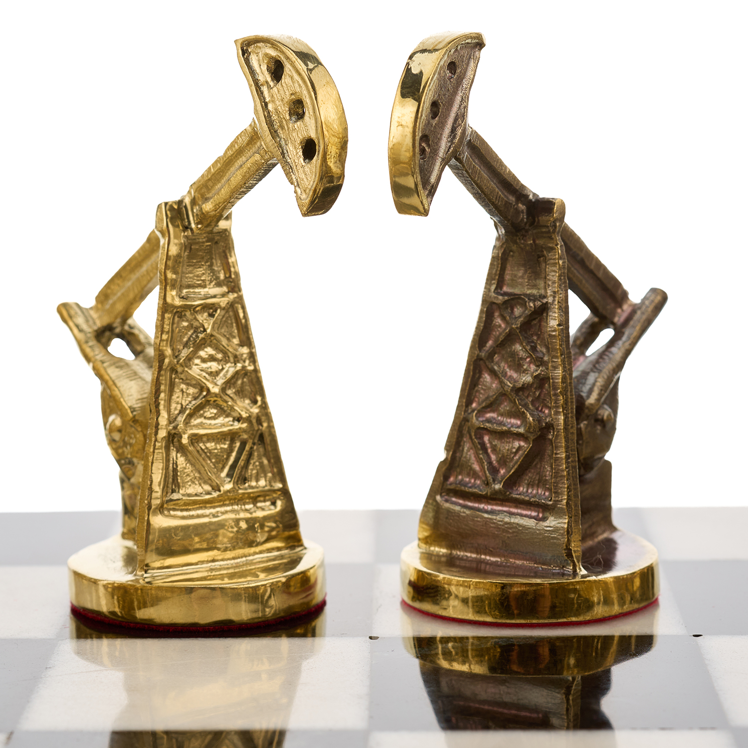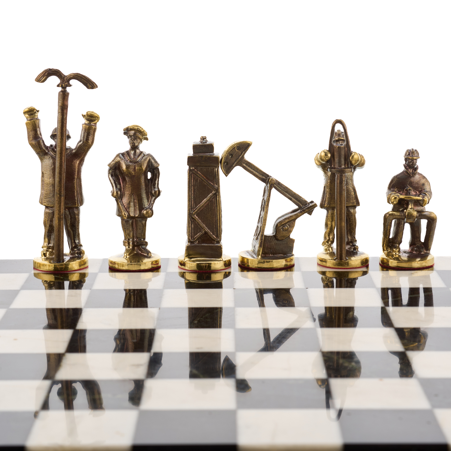 Шахматы из камня с бронзовыми фигурами "Нефтяники".Материалы: бронза, змеевик.