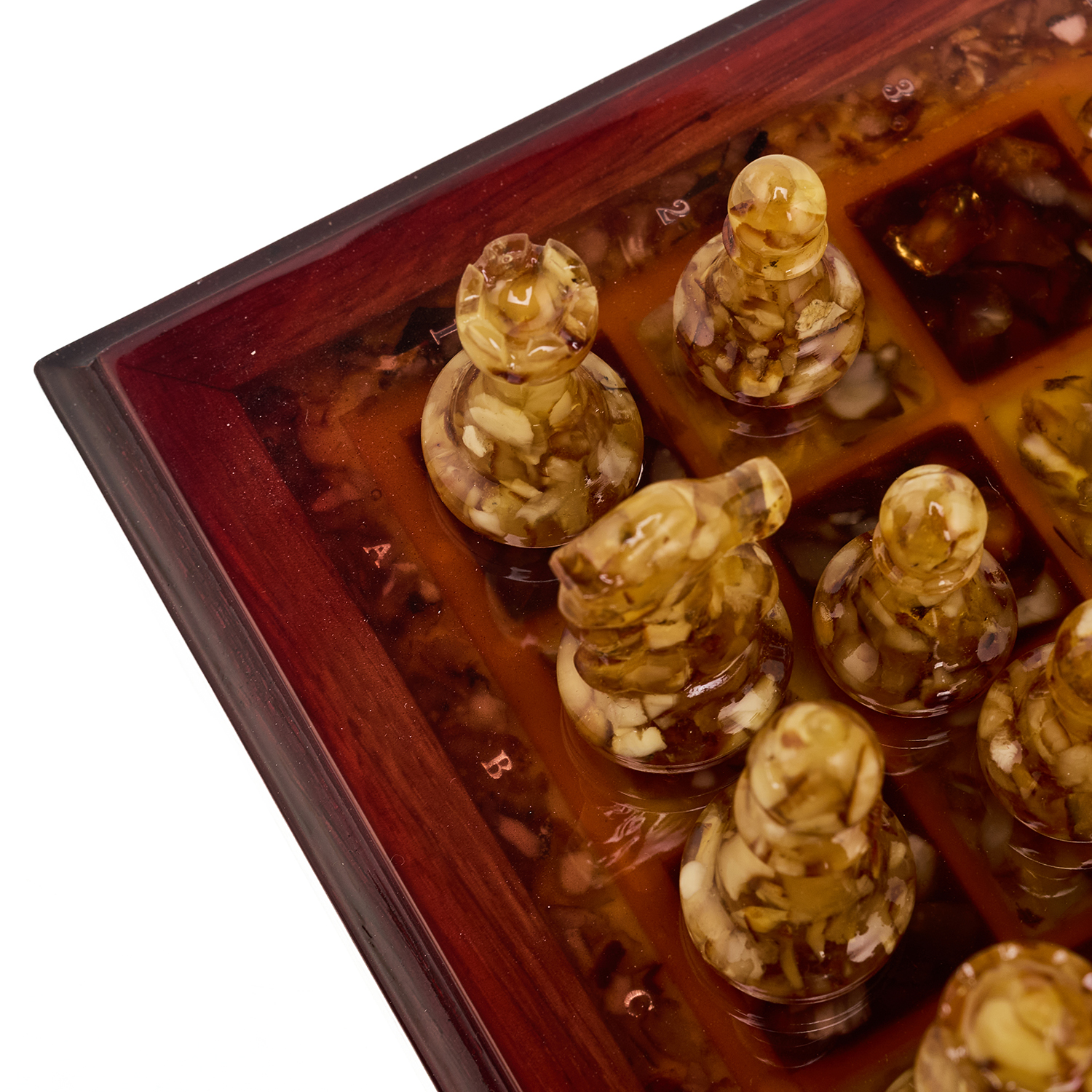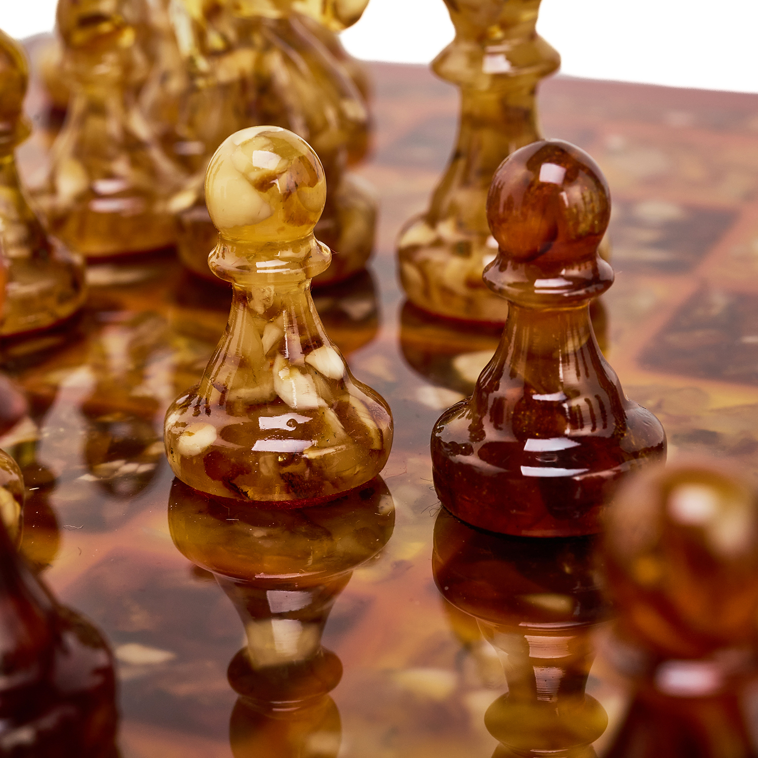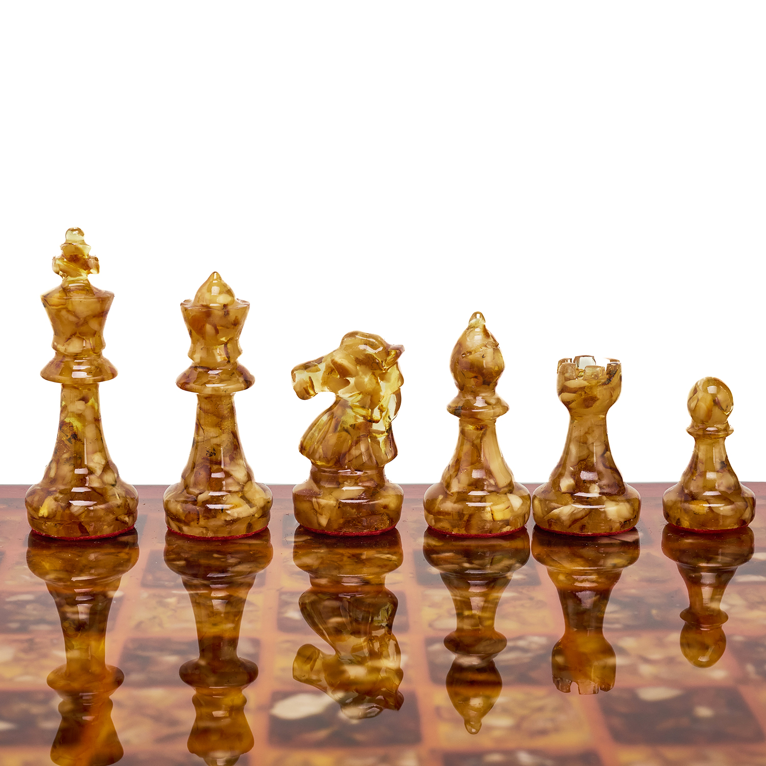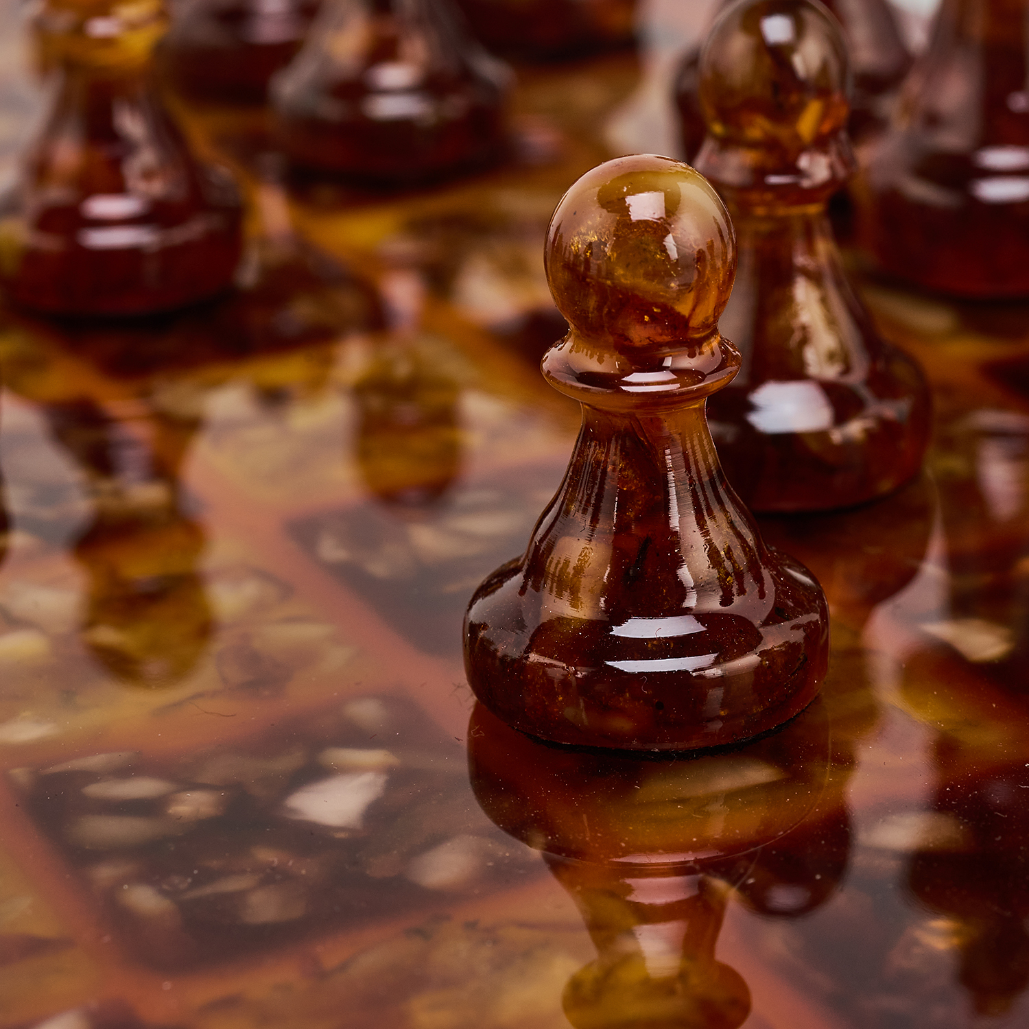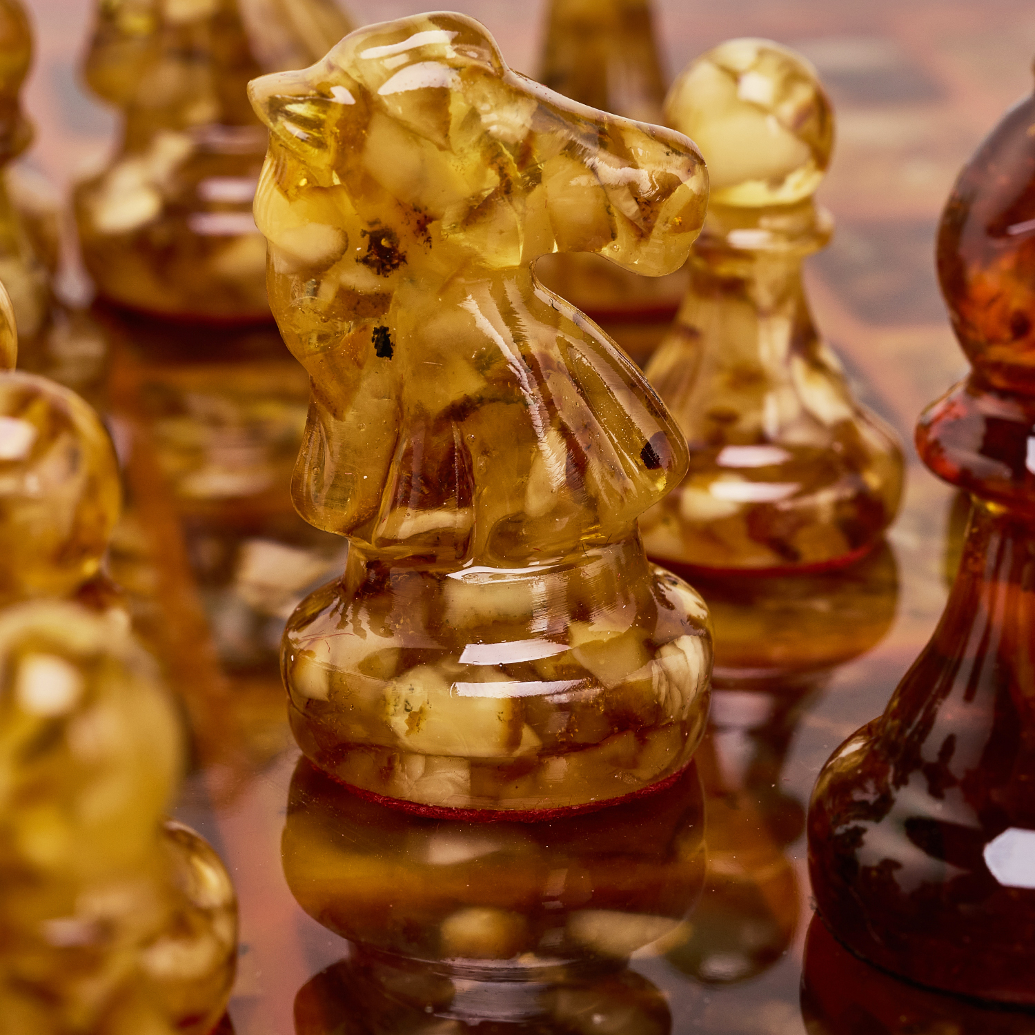 Шахматы с янтарными фигурами.Материалы: янтарь, полиэфирная смола.