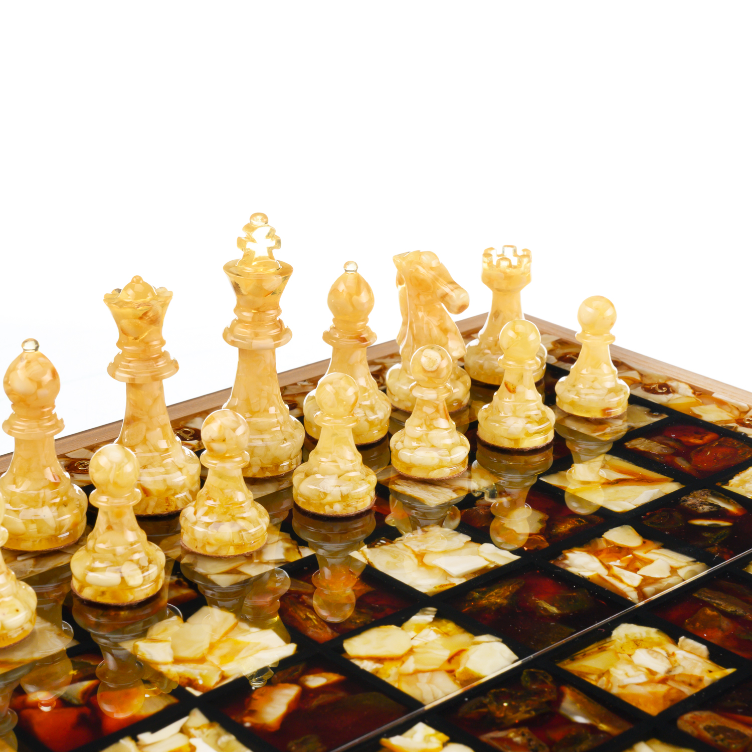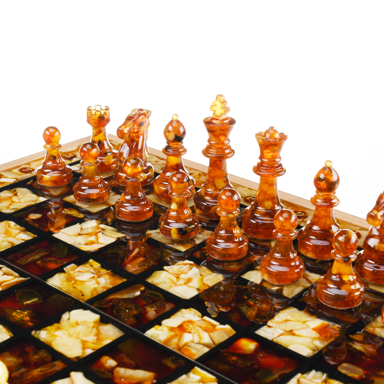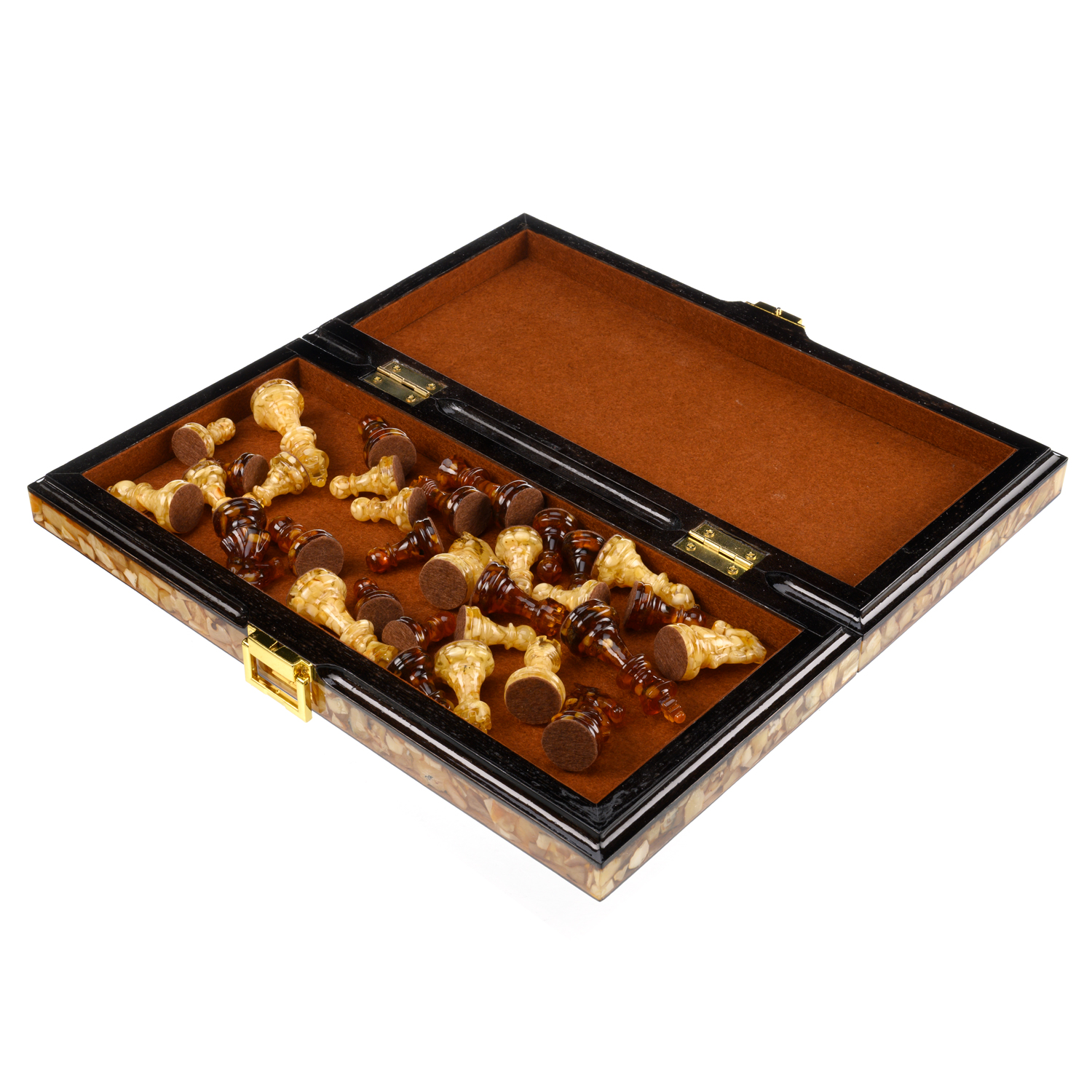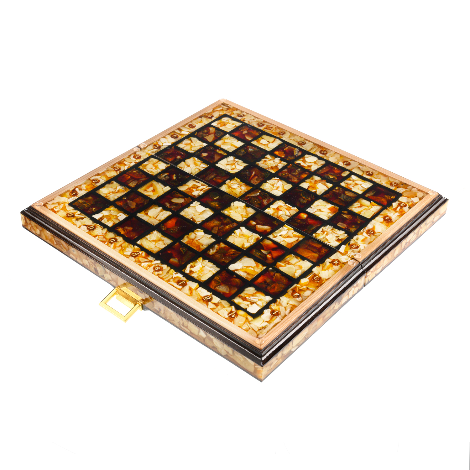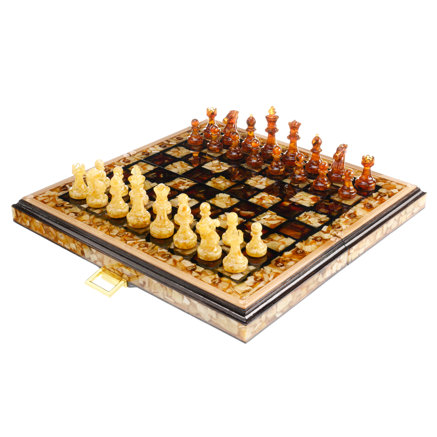 Шахматы складные с инкрустацией и фигурами из янтаря 34х34 см