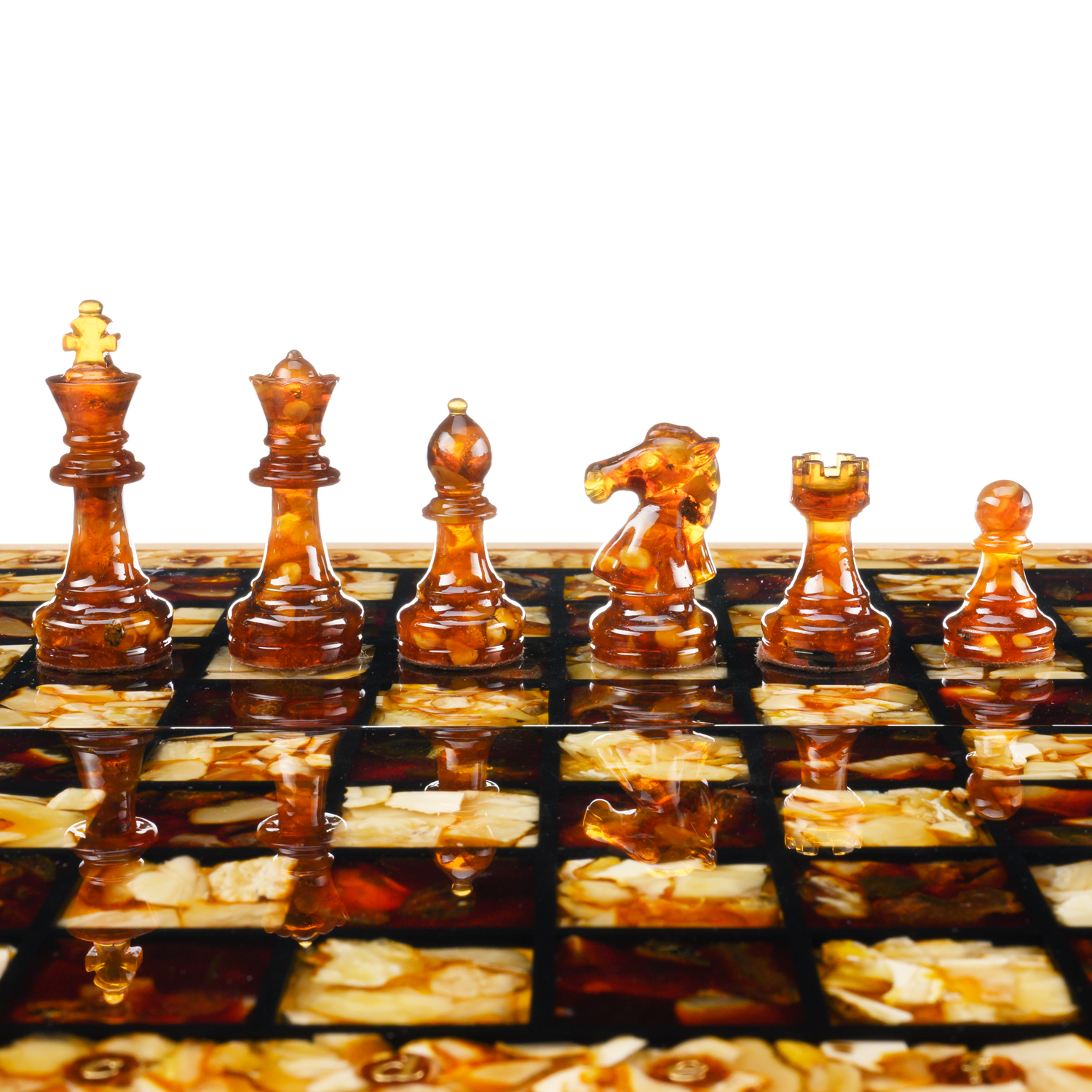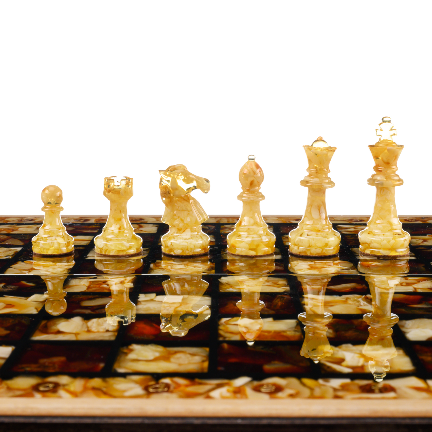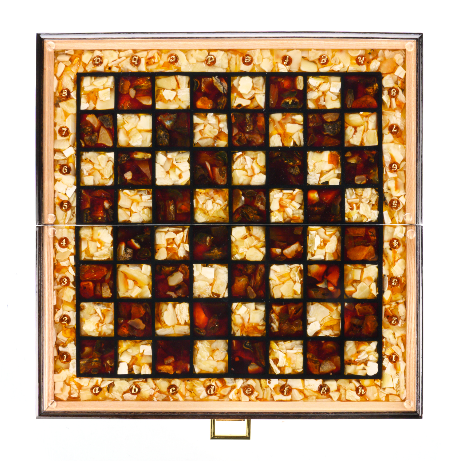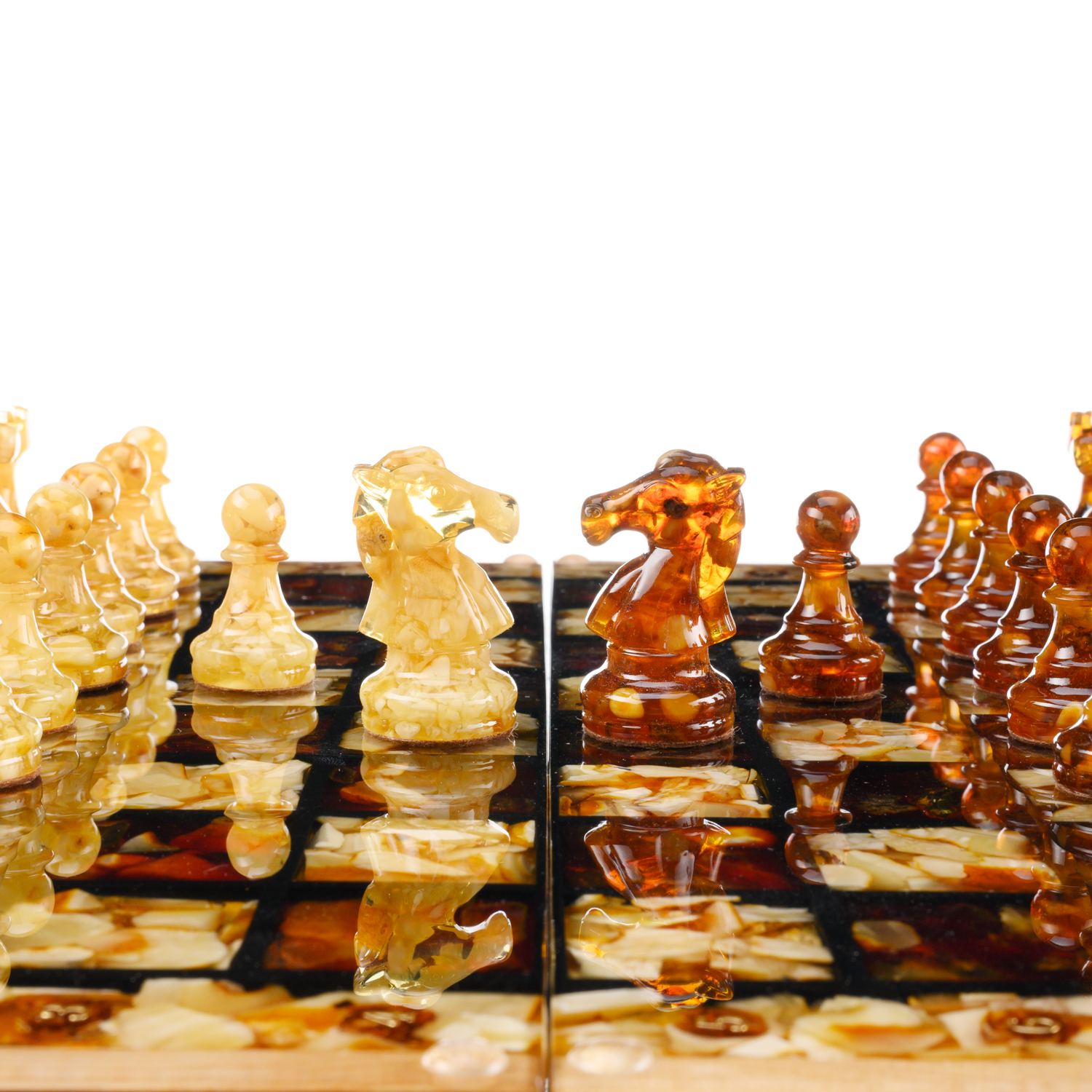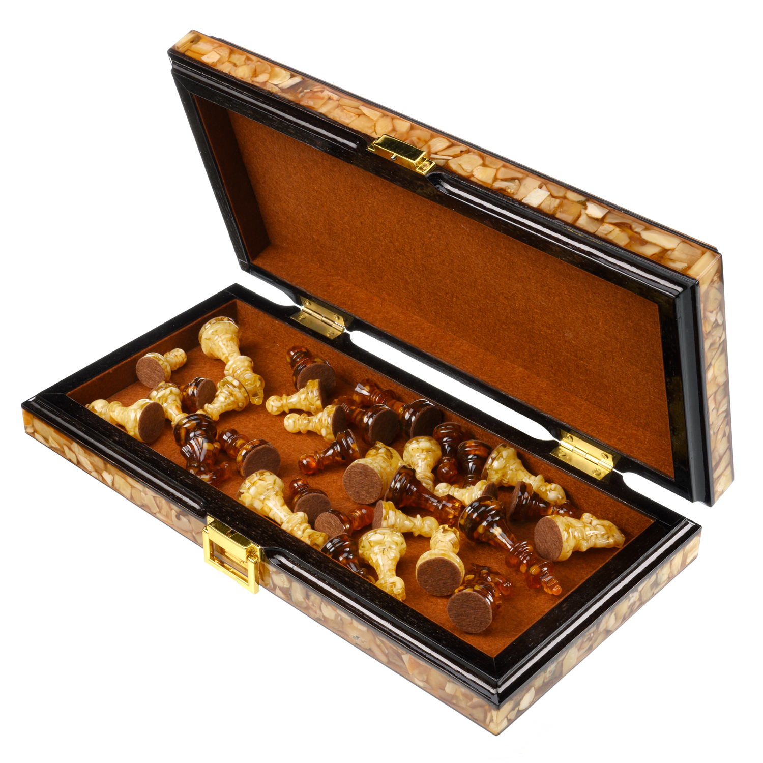 Шахматы складные с инкрустацией и фигурами из янтаря 34х34 см