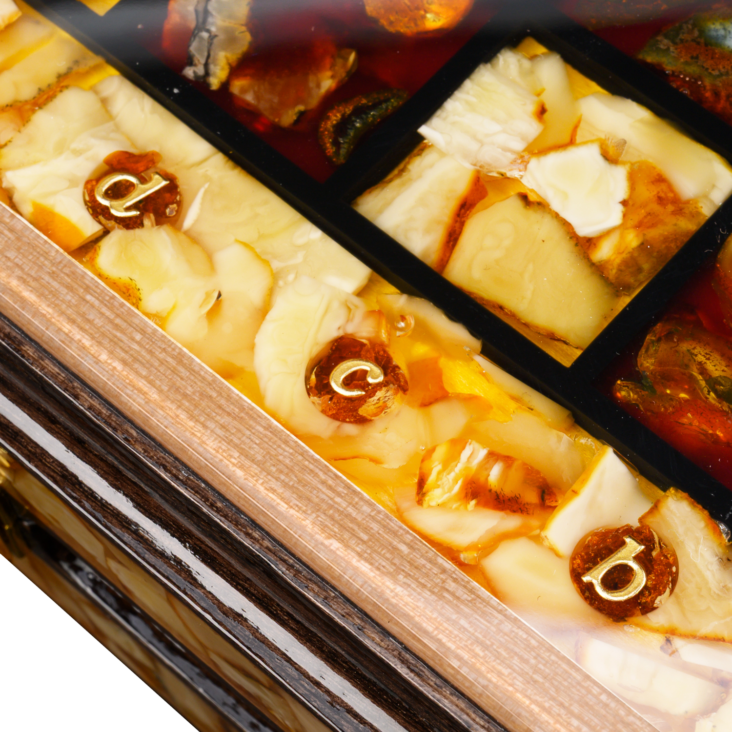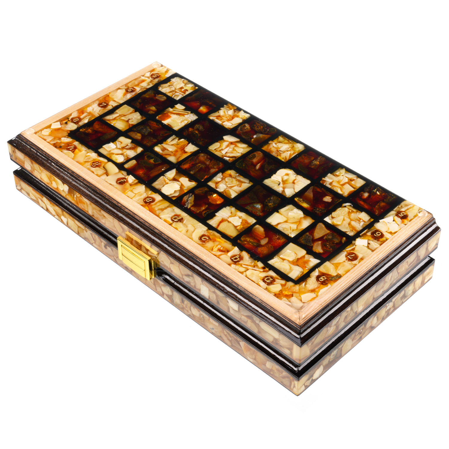 Шахматы складные с инкрустацией и фигурами из янтаря.Материалы: дерево, янтарь, полиэфирная смола.