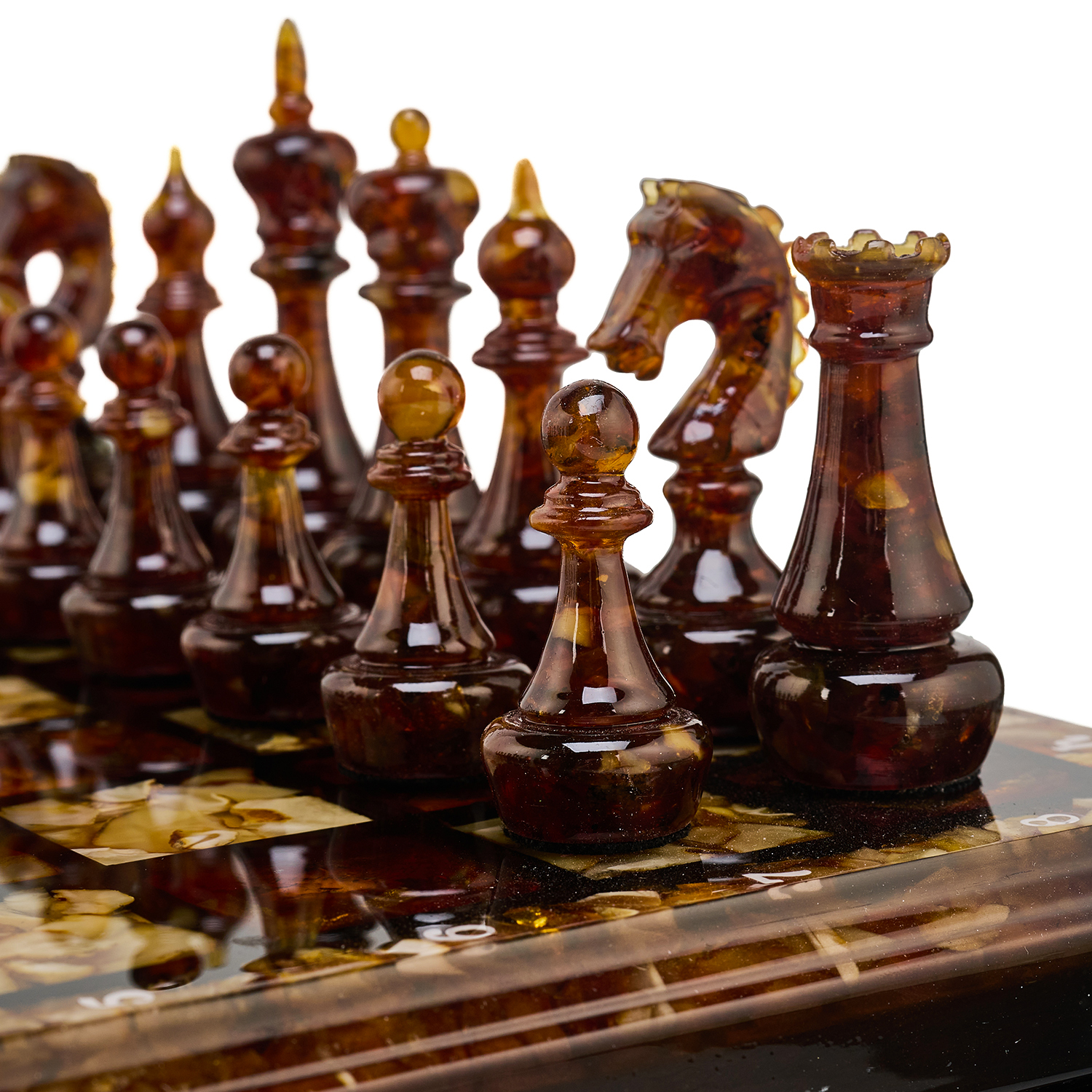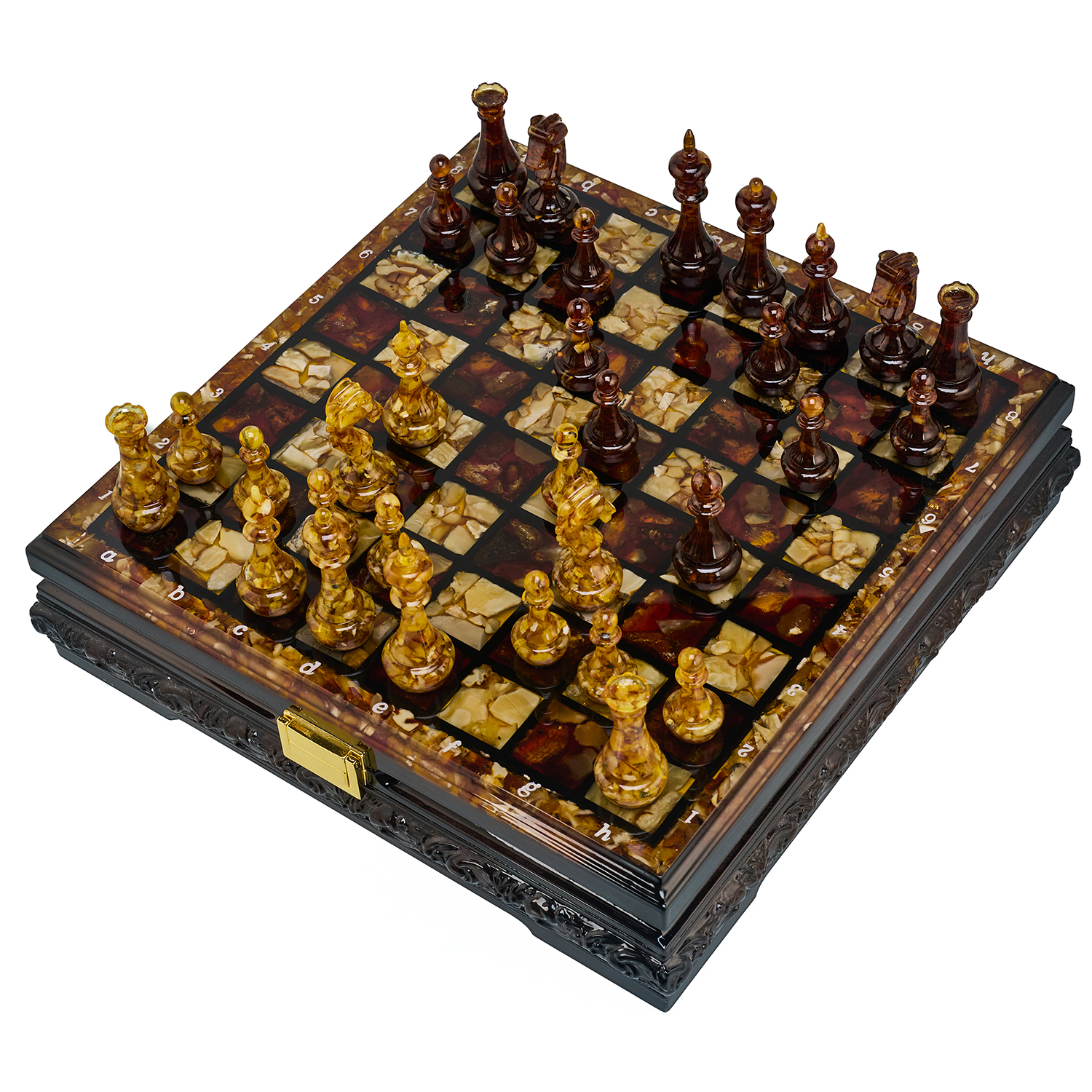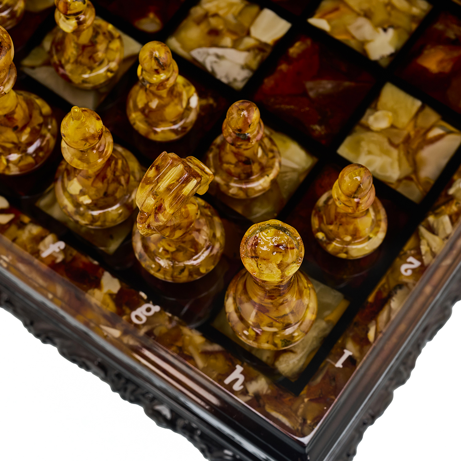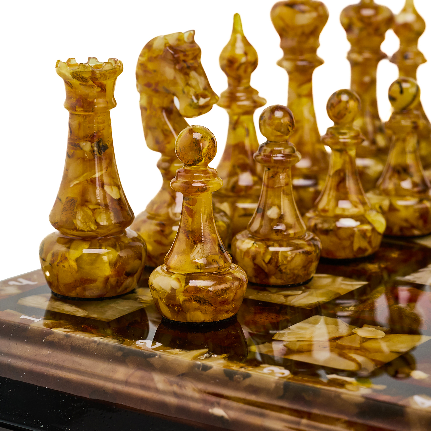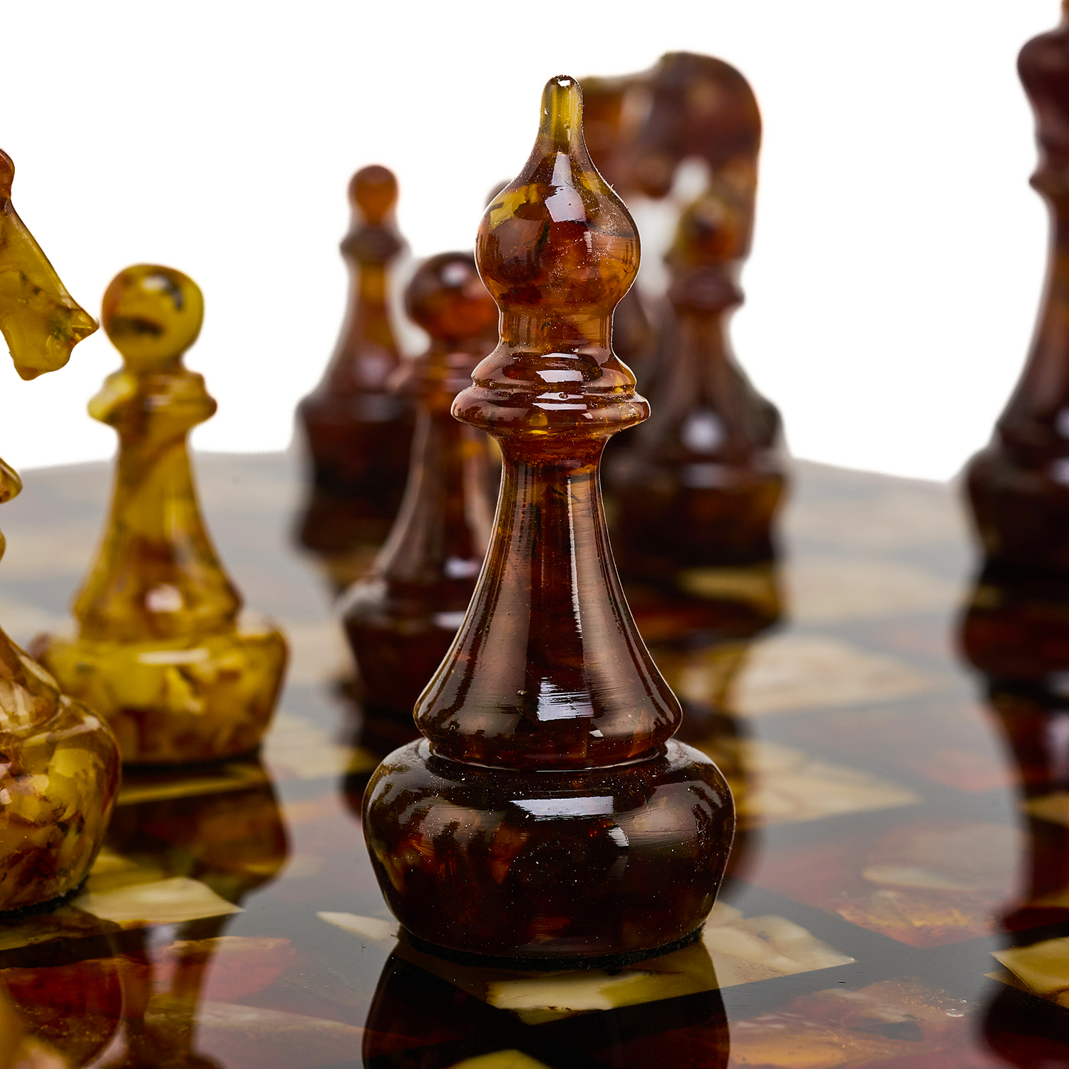 Шахматы с инкрустацией и фигурами из янтаря 30х30 см
