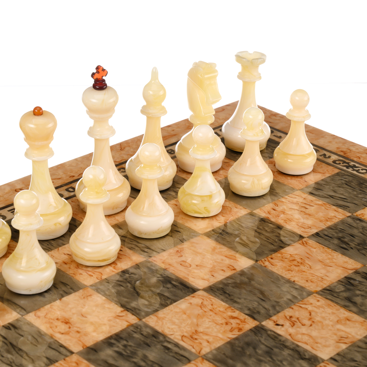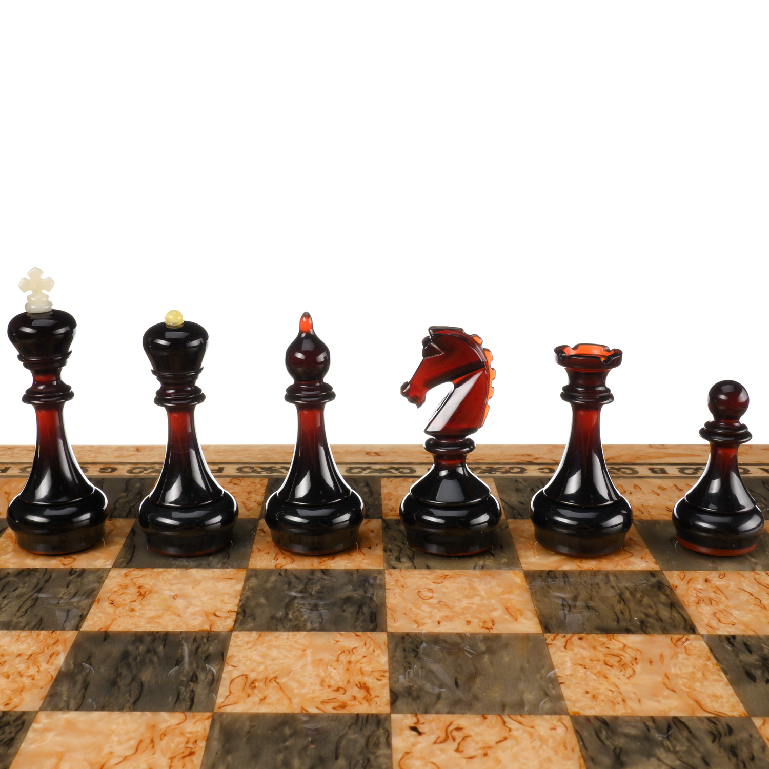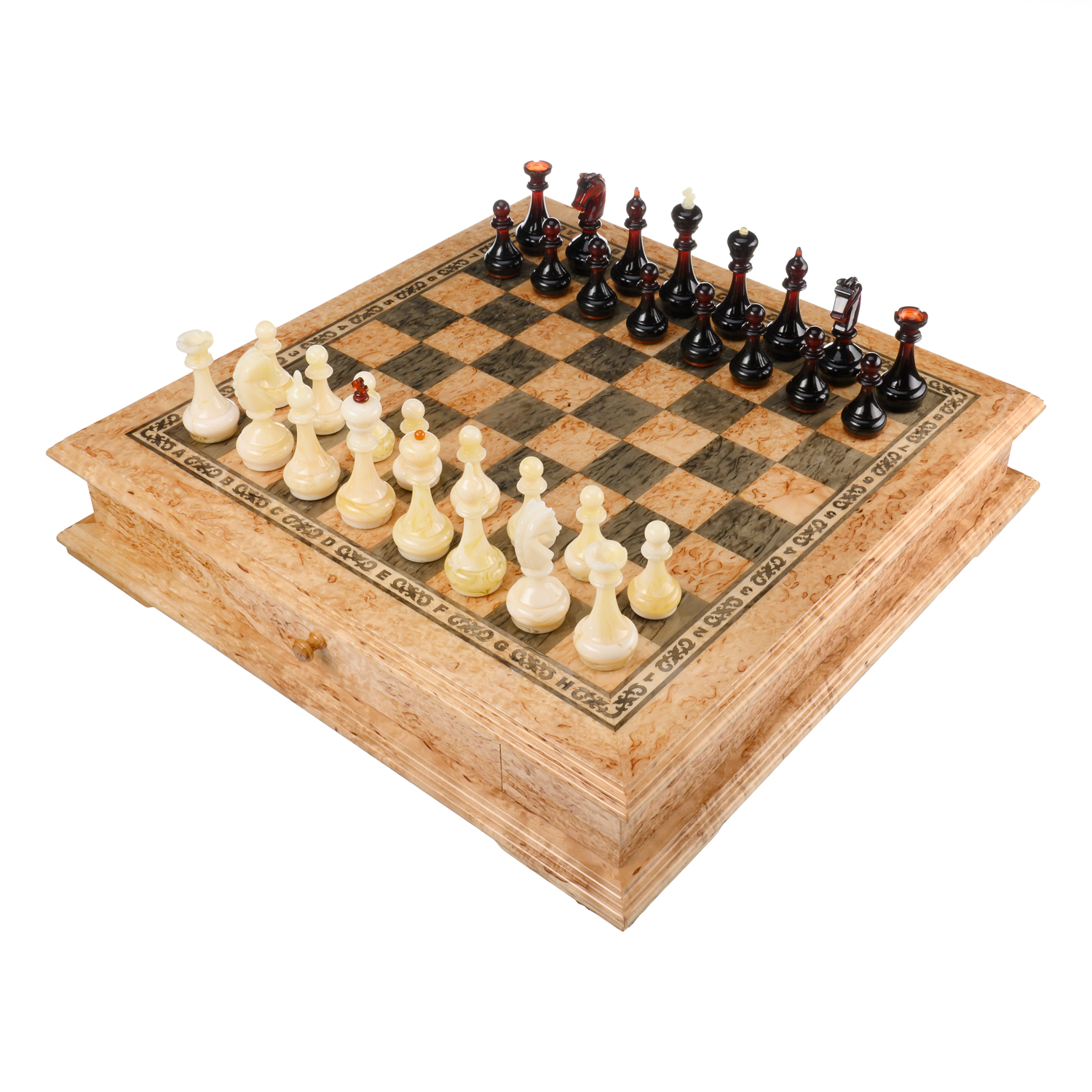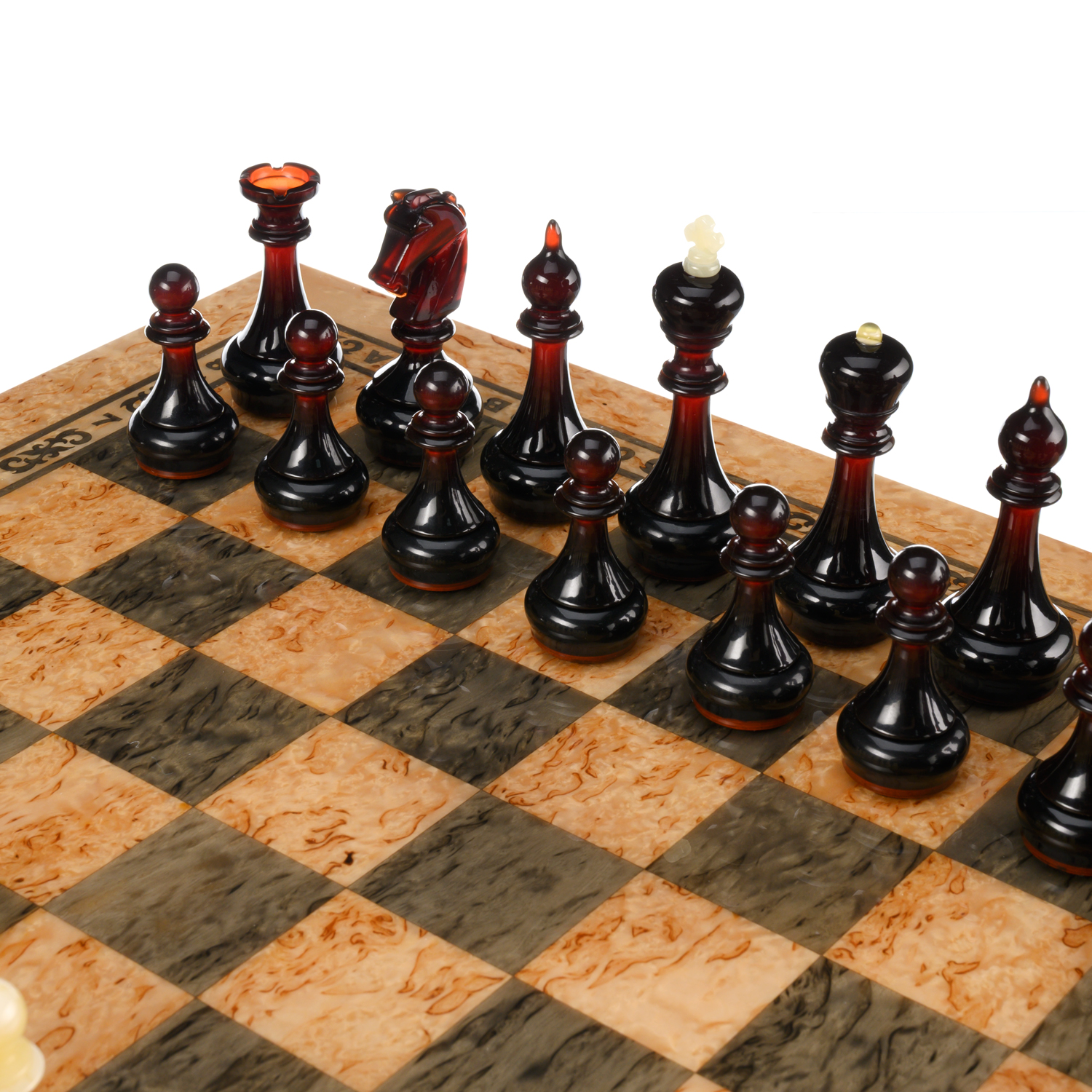Шахматы из карельской березы с янтарными фигурами 47х47 см