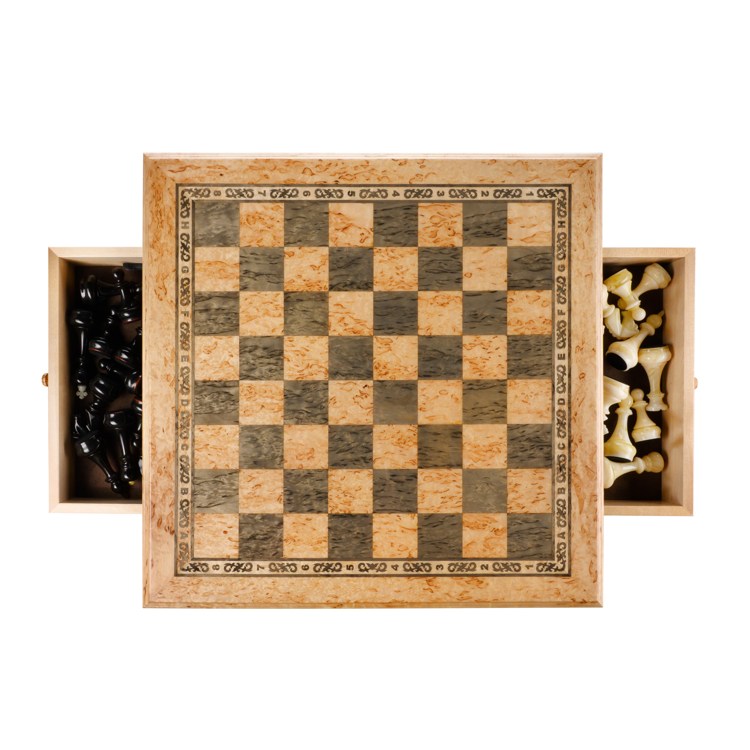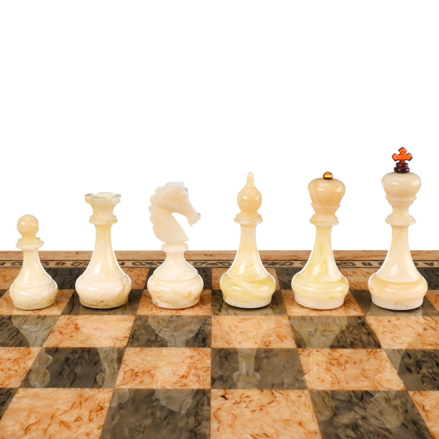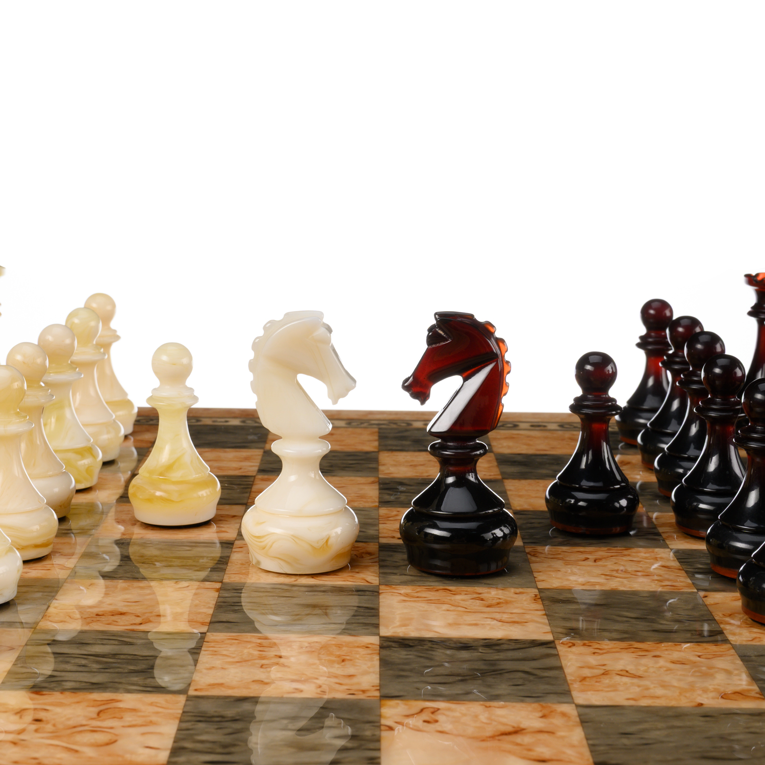 Шахматы из карельской березы с янтарными фигурами 47х47 см