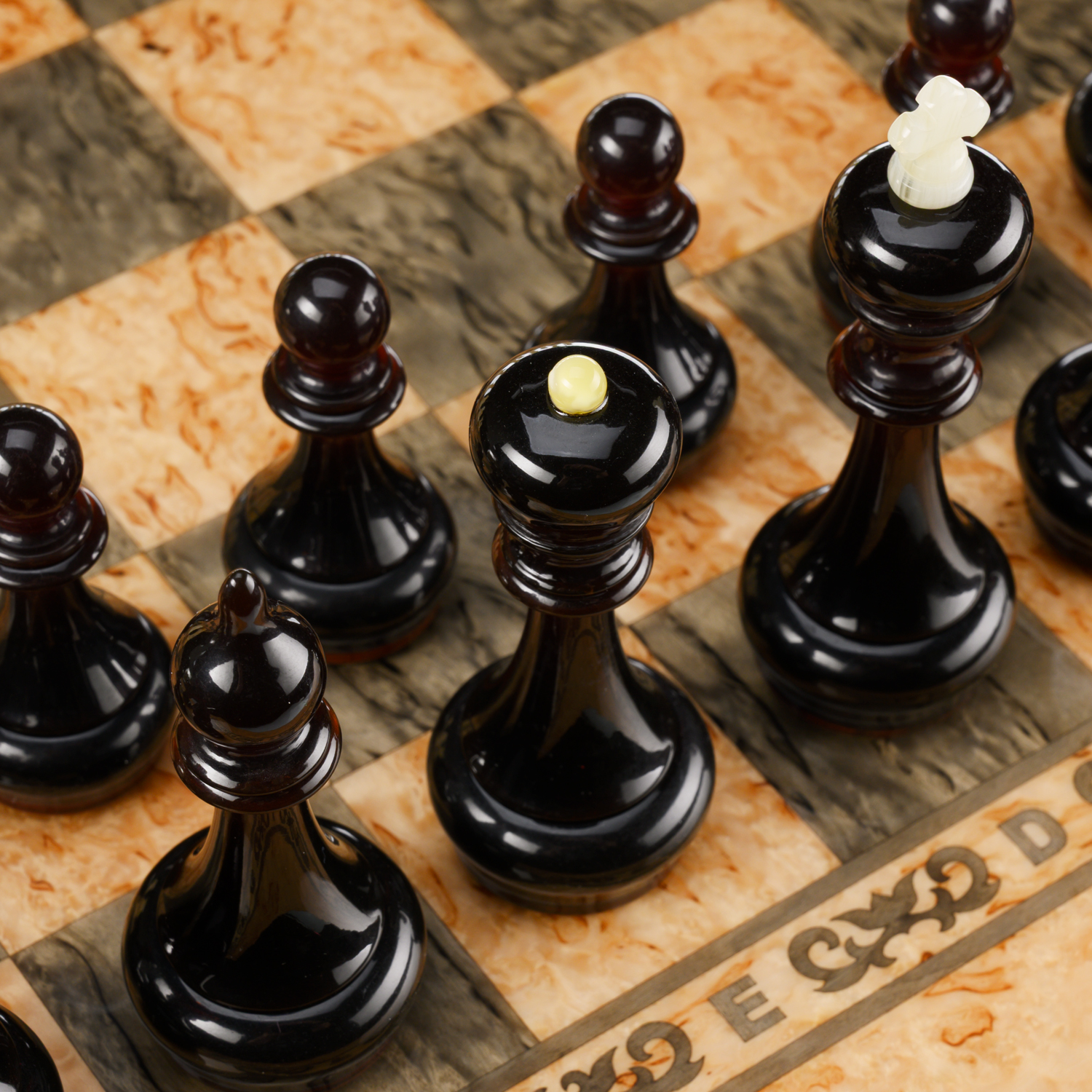 Шахматы из карельской березы с янтарными фигурами.Материалы: карельская береза, янтарь.