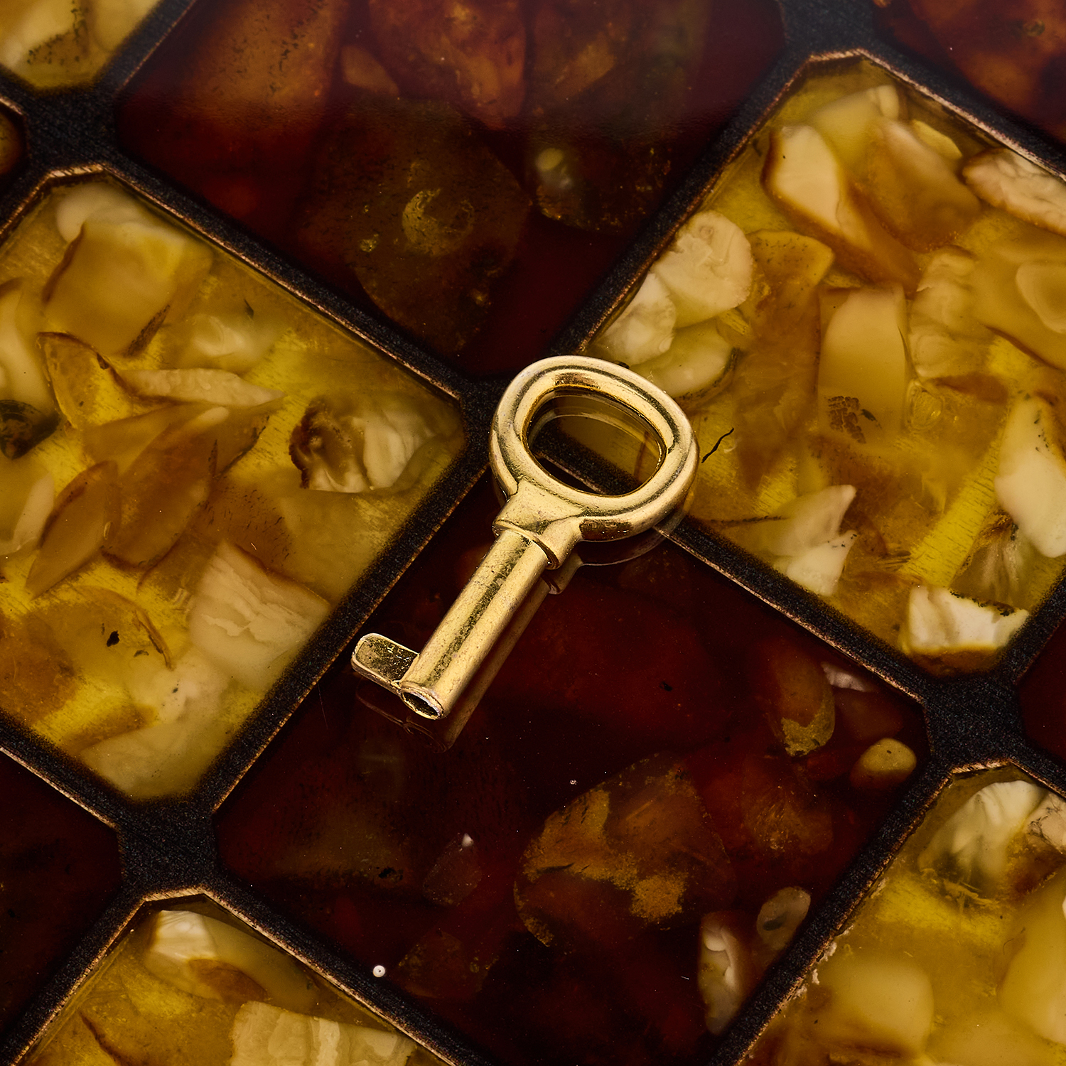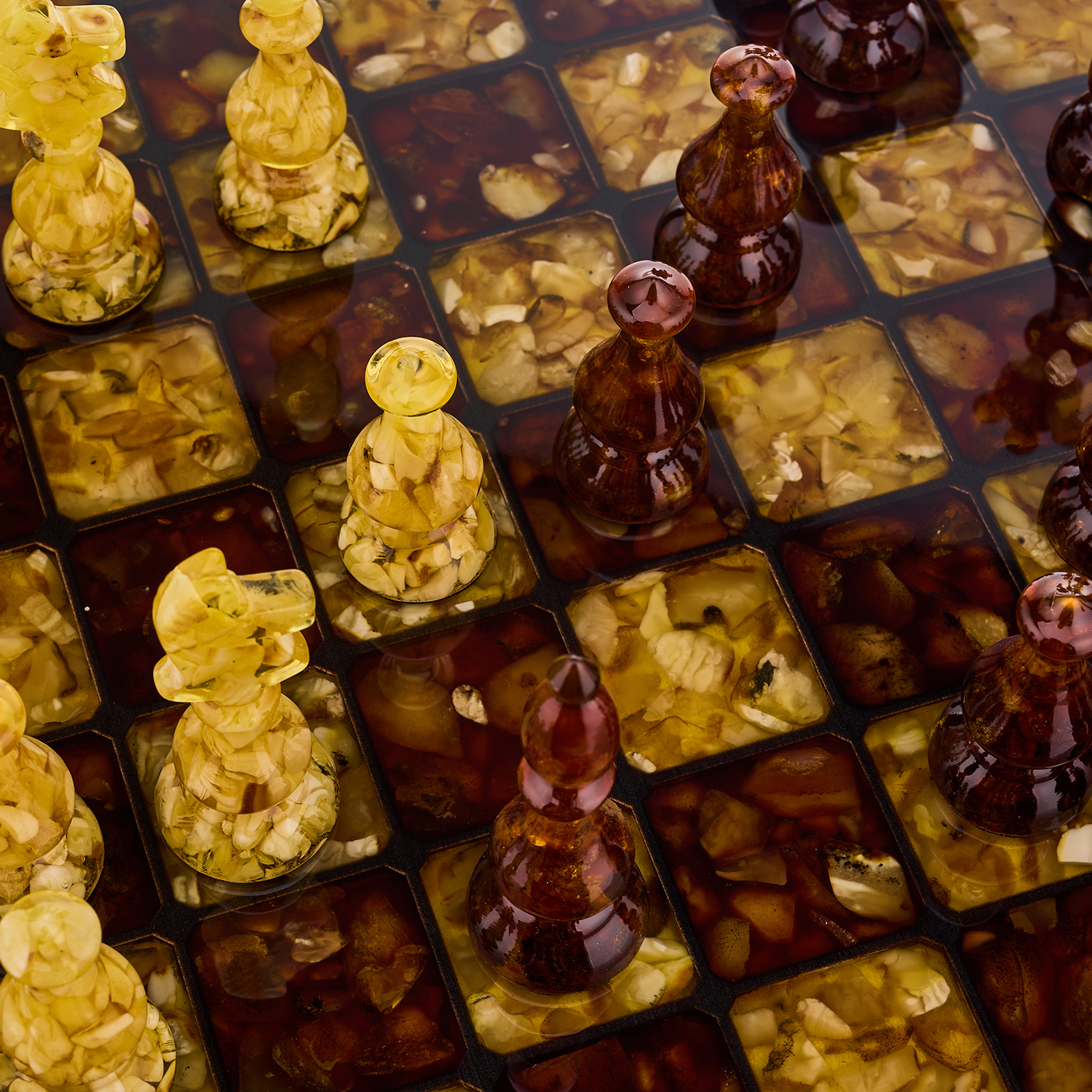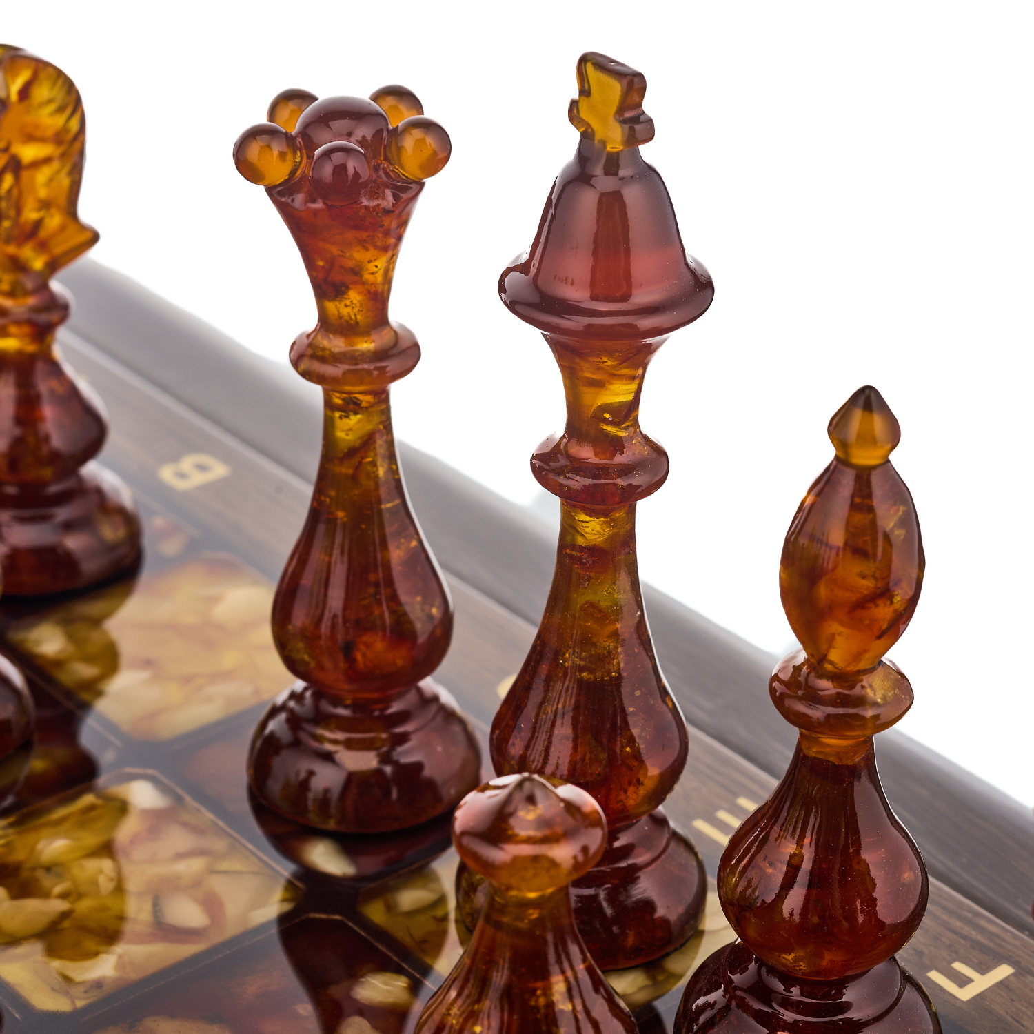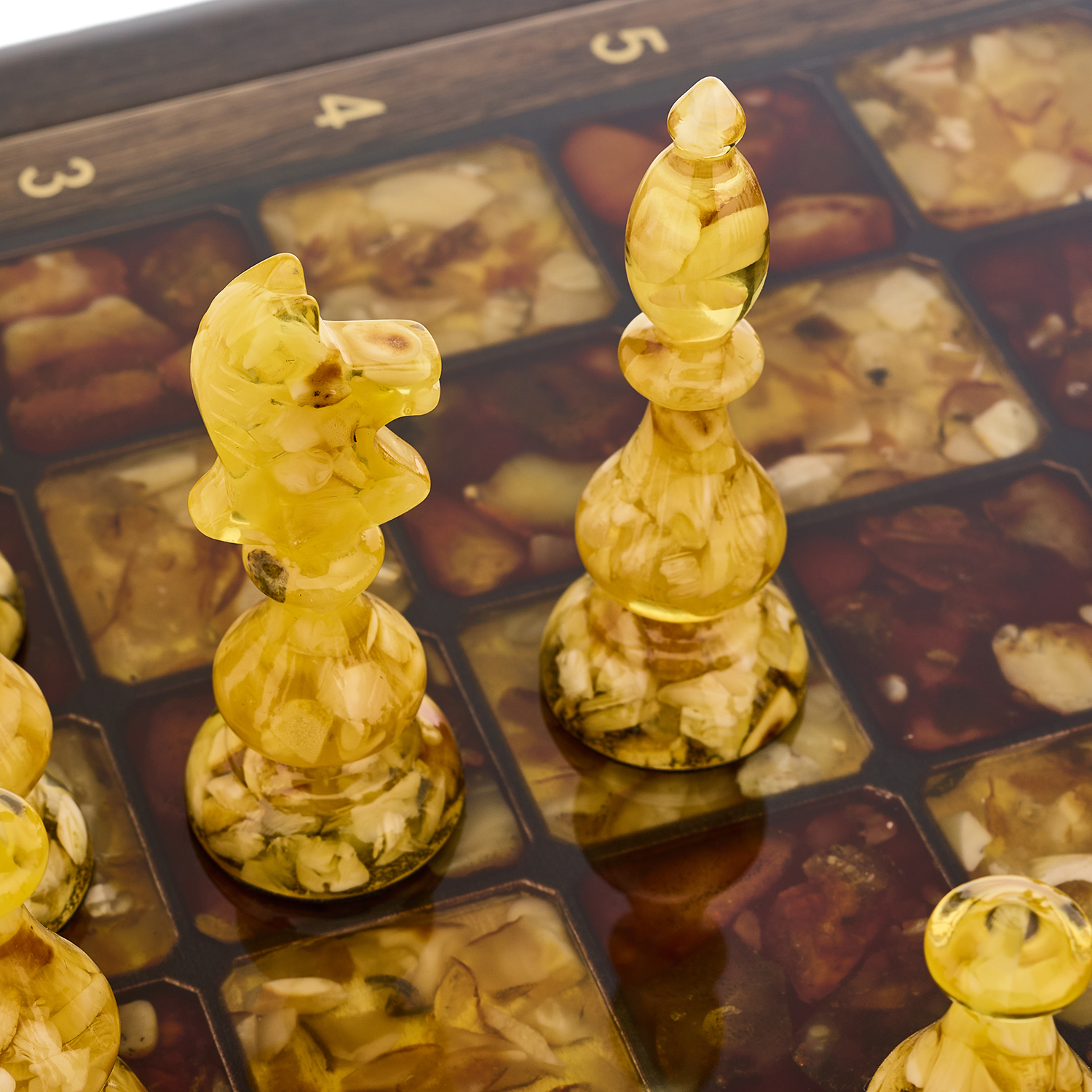 Шахматы из мореного дуба с янтарными фигурами 45х45 см
