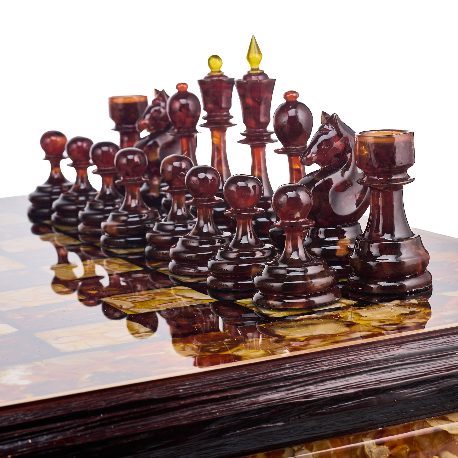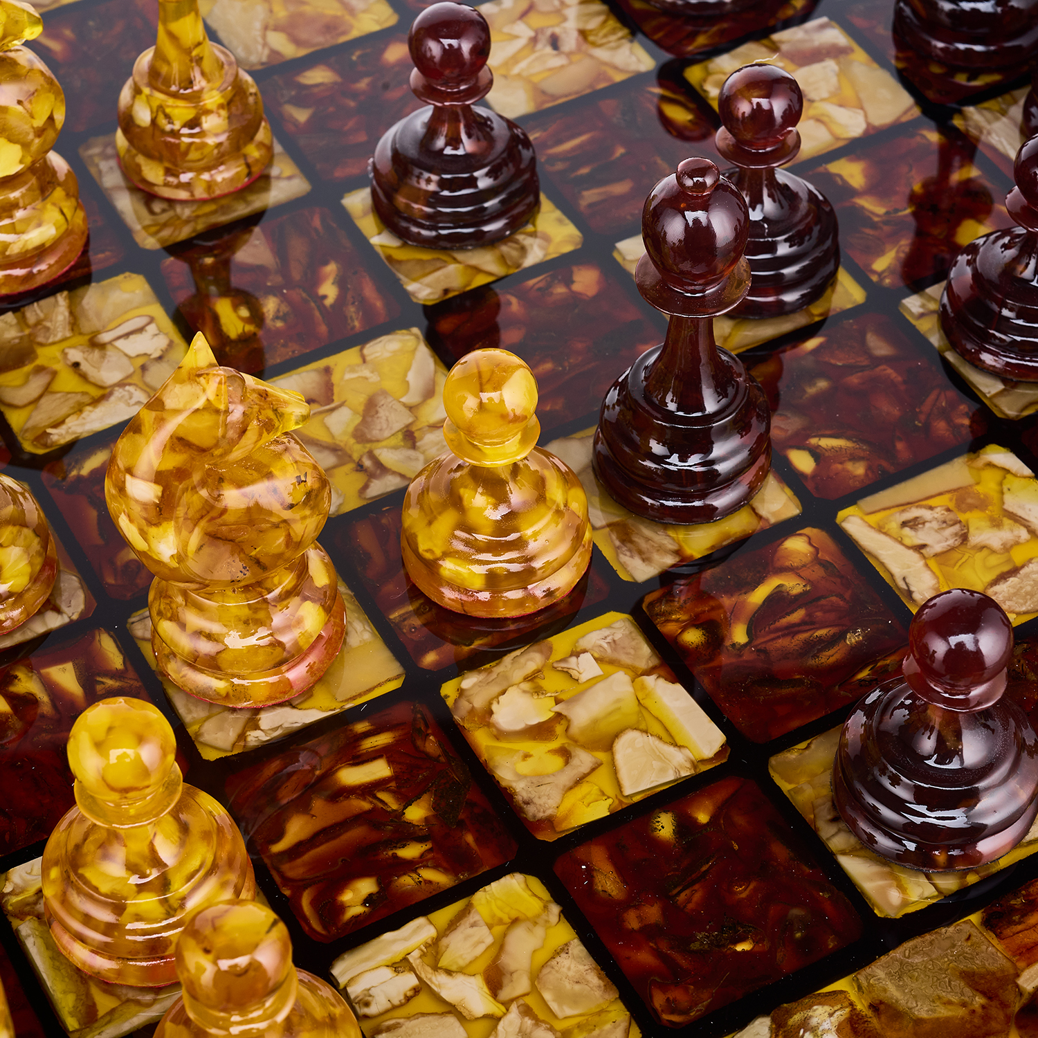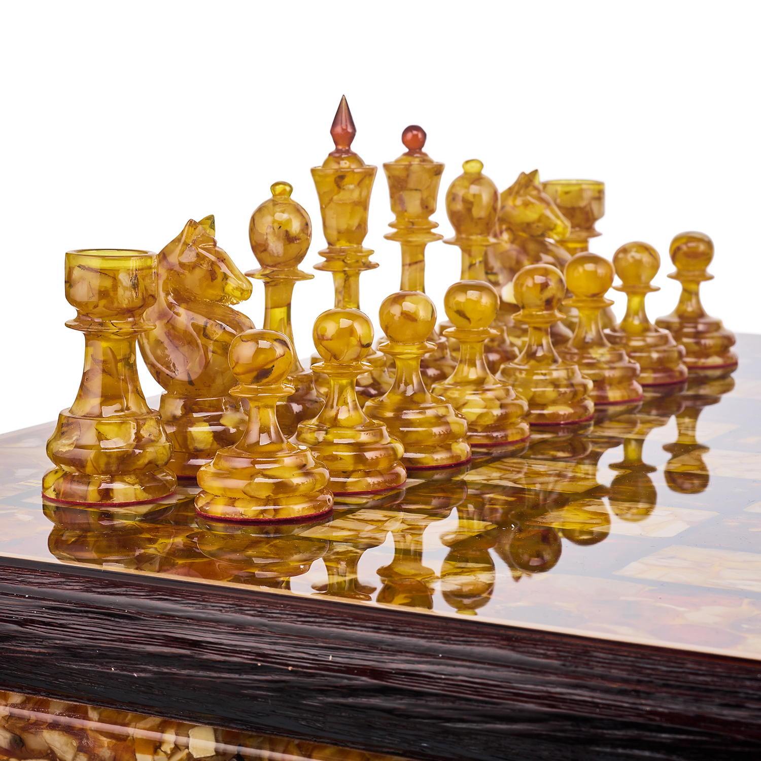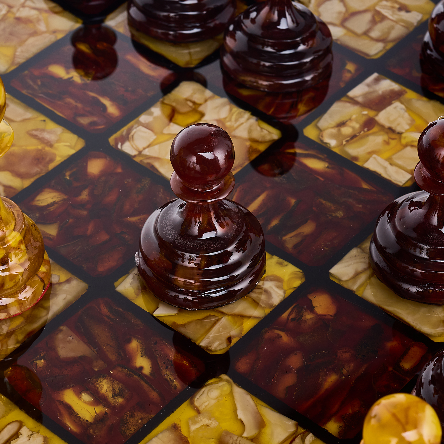 Шахматы с инкрустацией и фигурами из янтаря 60х60 см