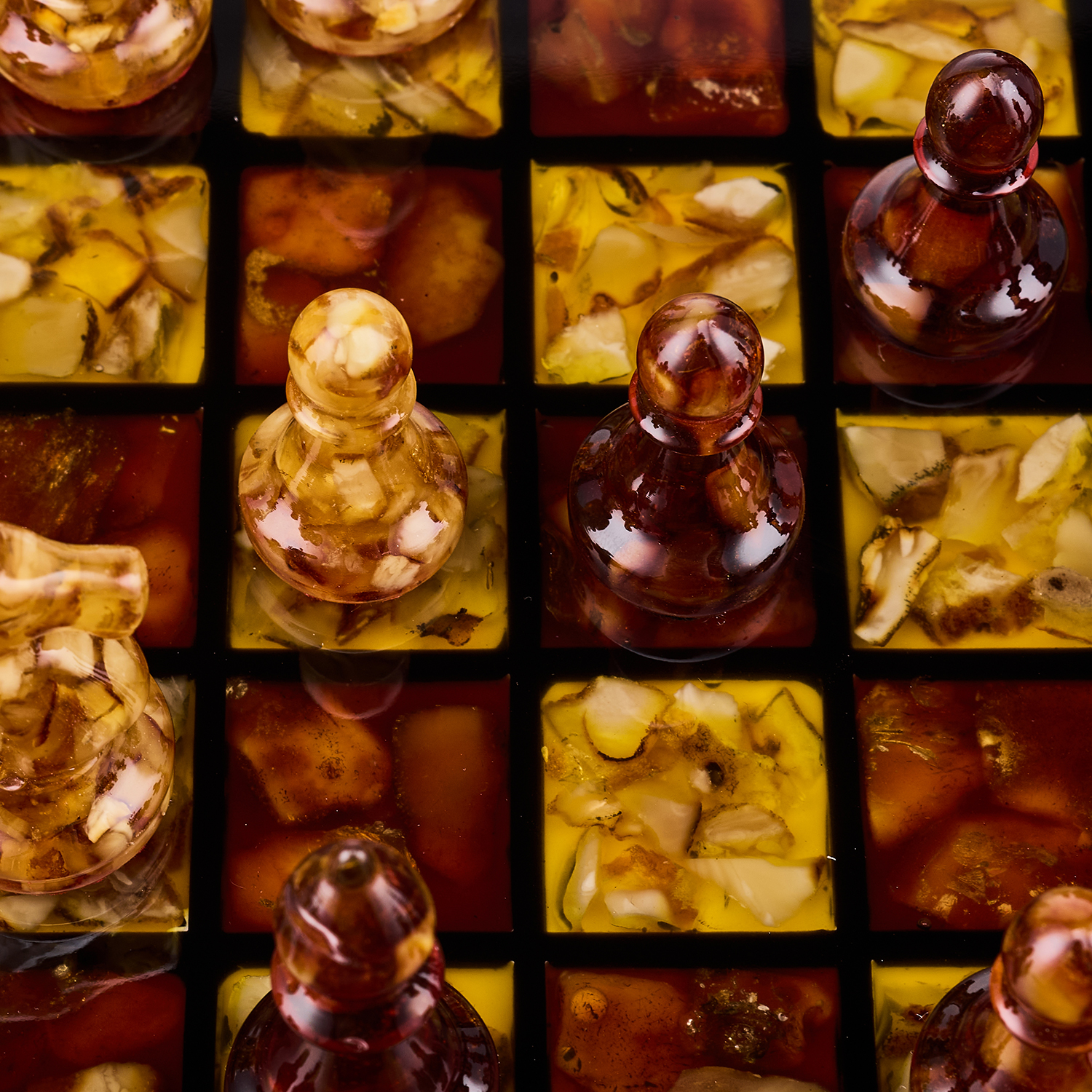 Шахматы с инкрустацией и фигурами из янтаря.Материалы: дерево, янтарь, полиэфирная смола.