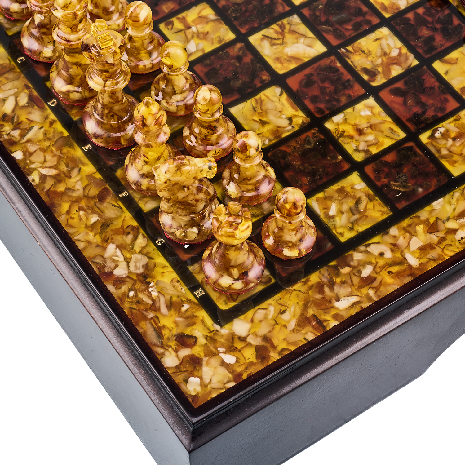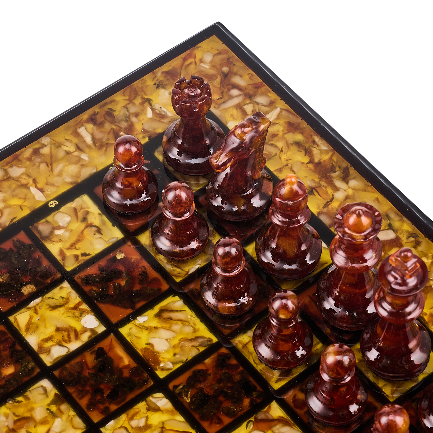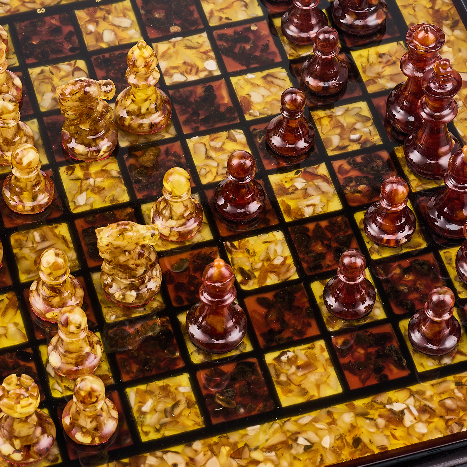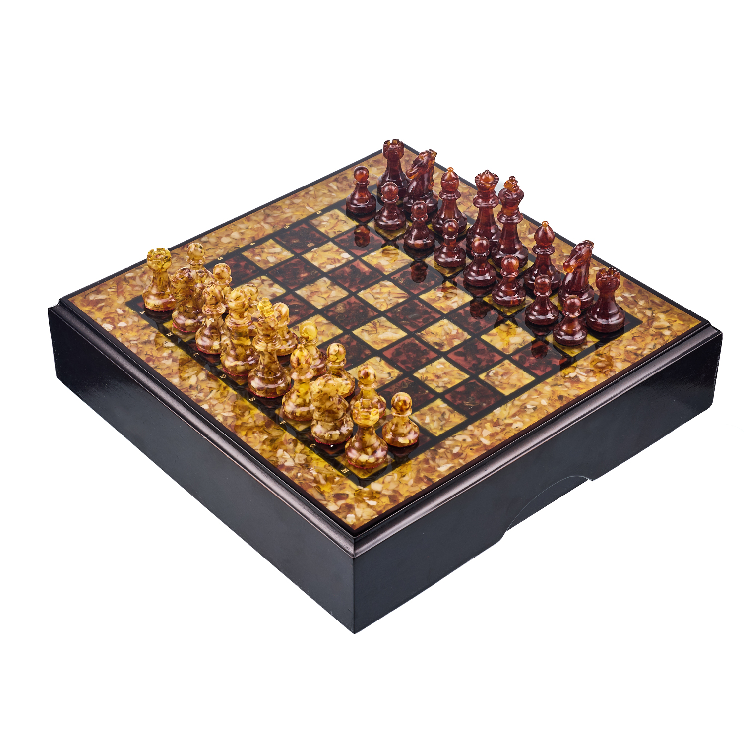 Шахматы с инкрустацией и фигурами из янтаря 30х30 см