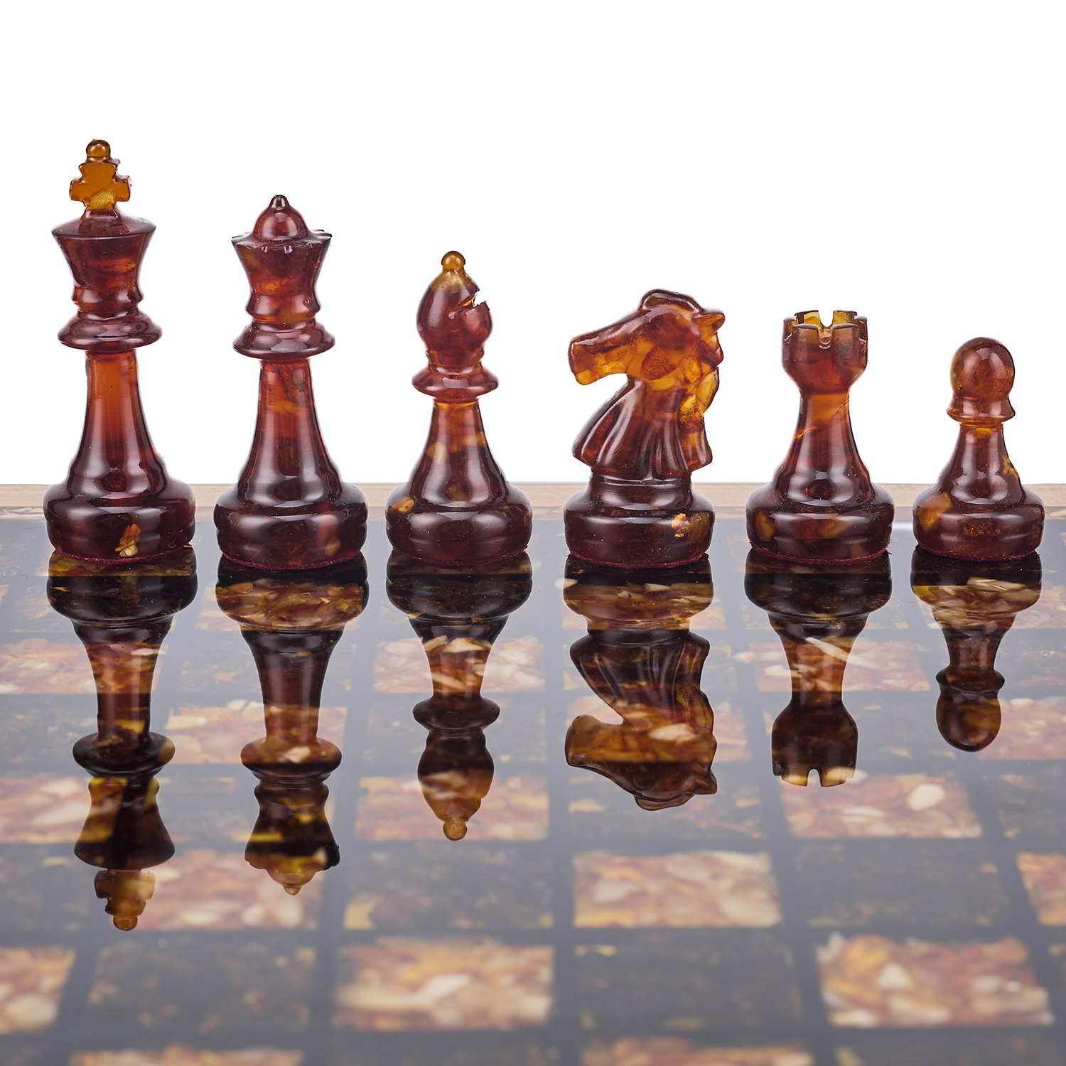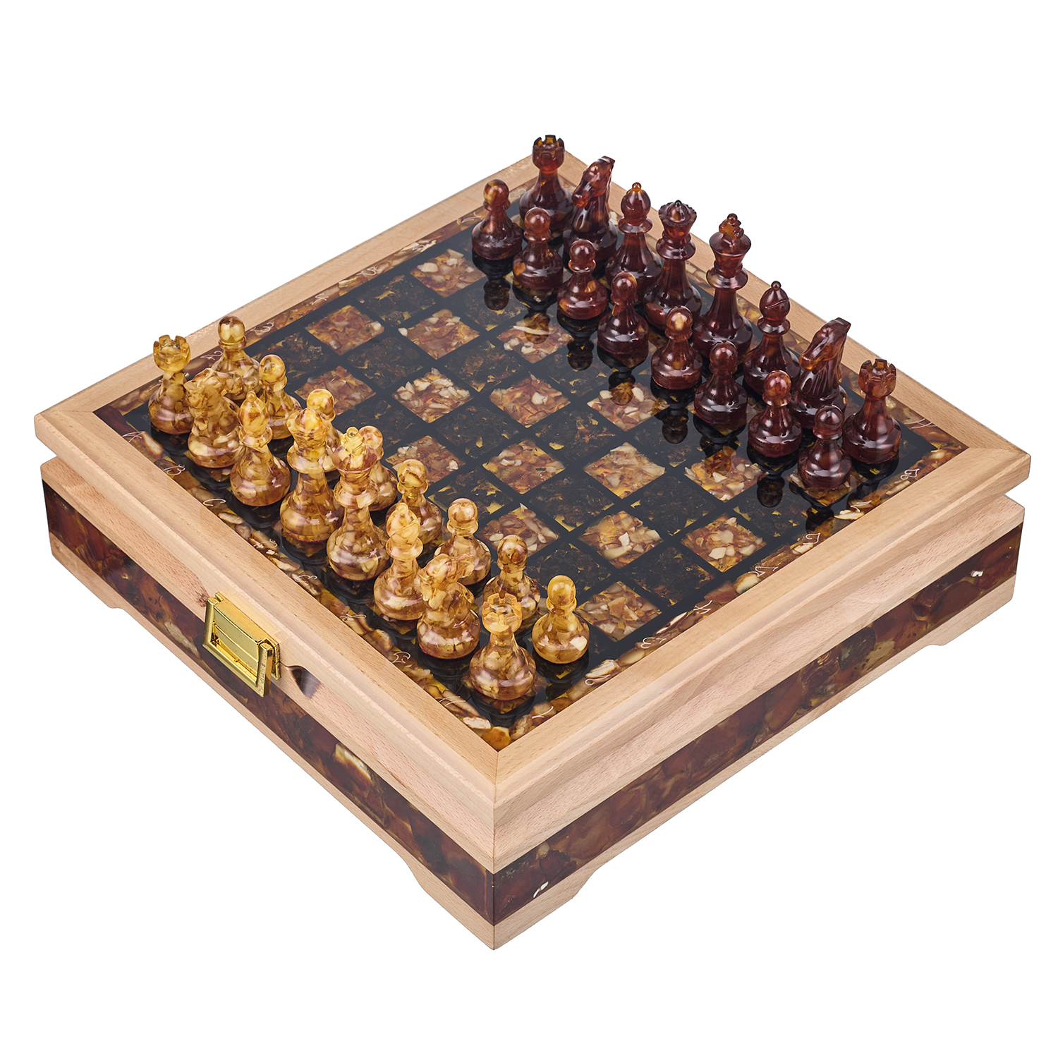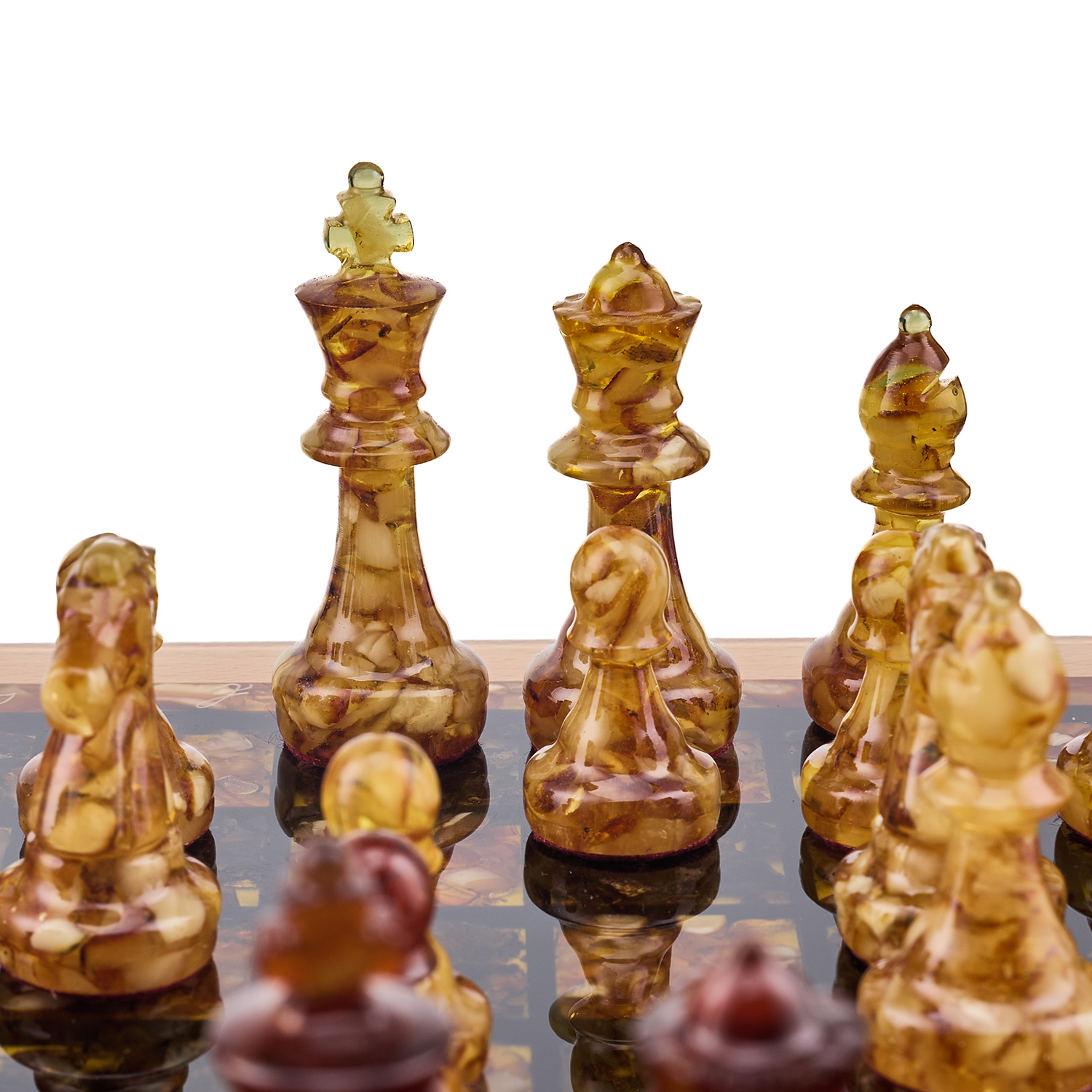 Шахматы с инкрустацией и фигурами из янтаря 28х28 см