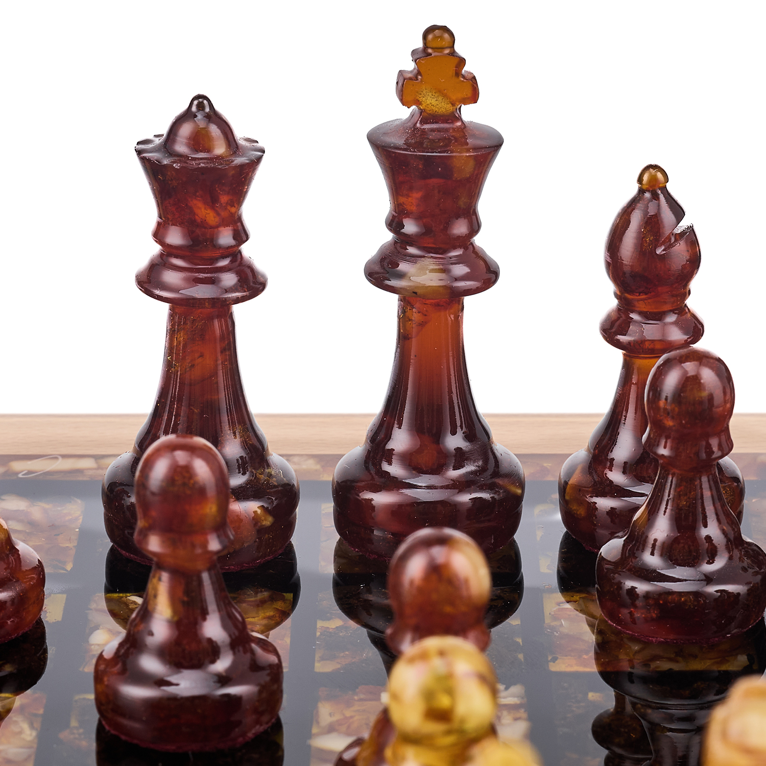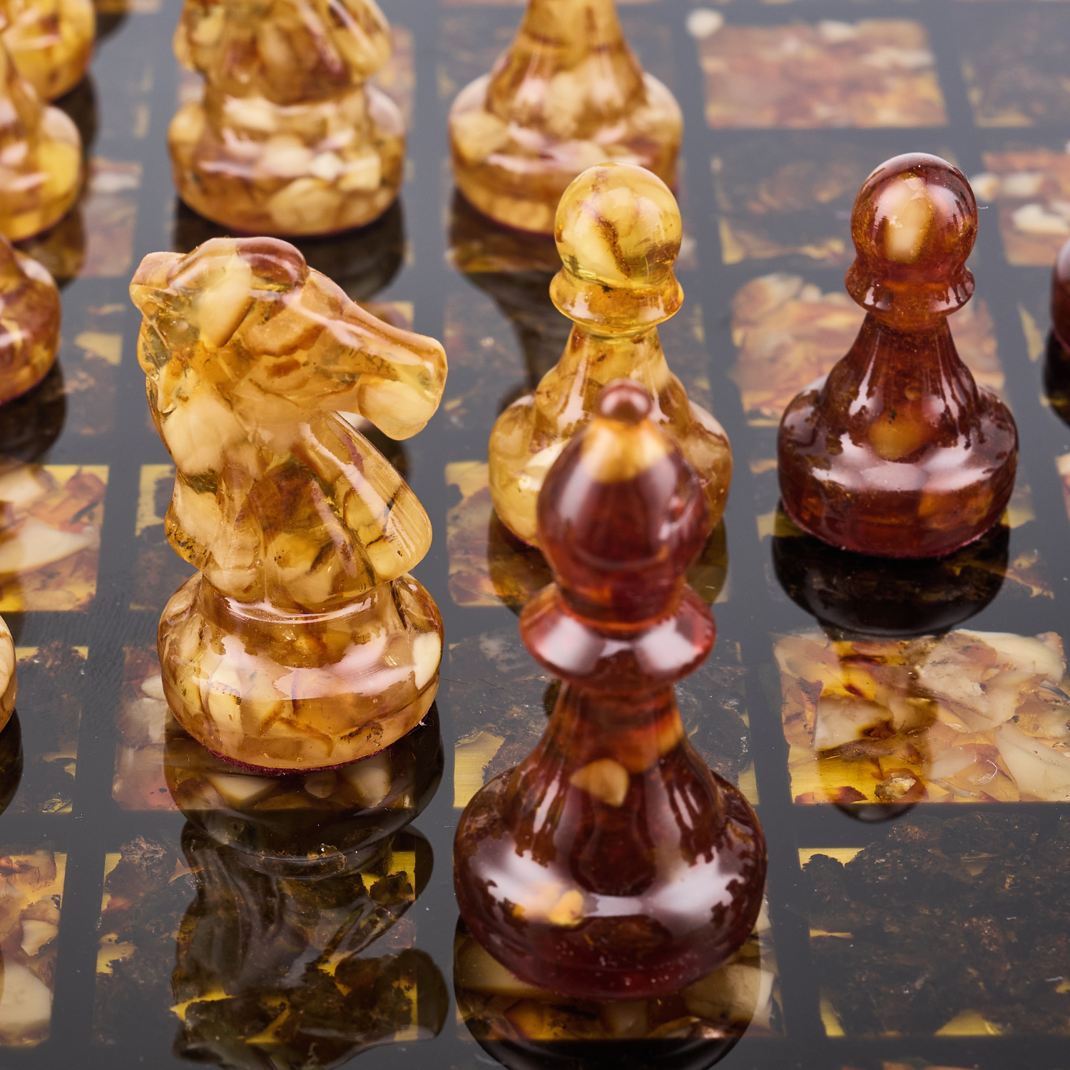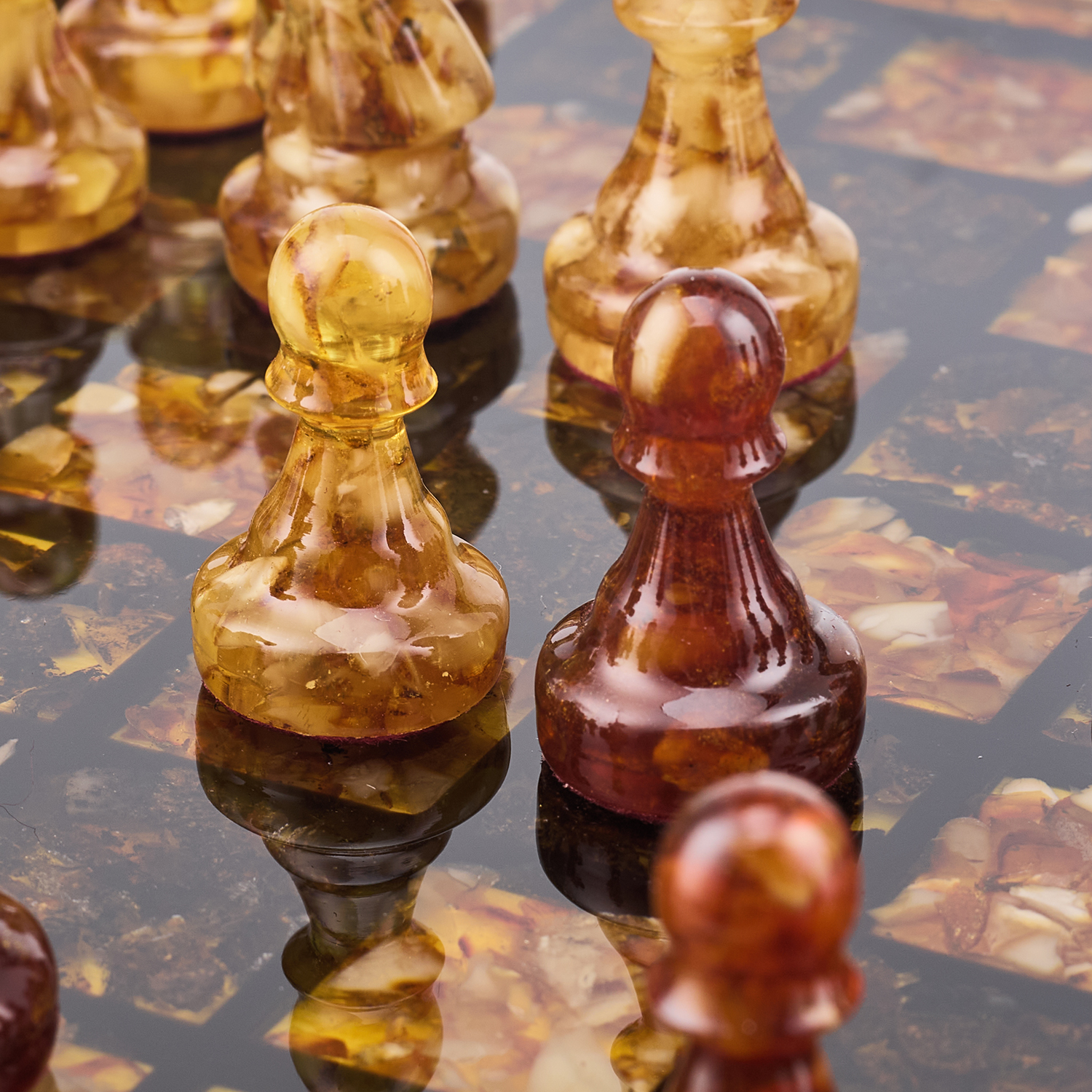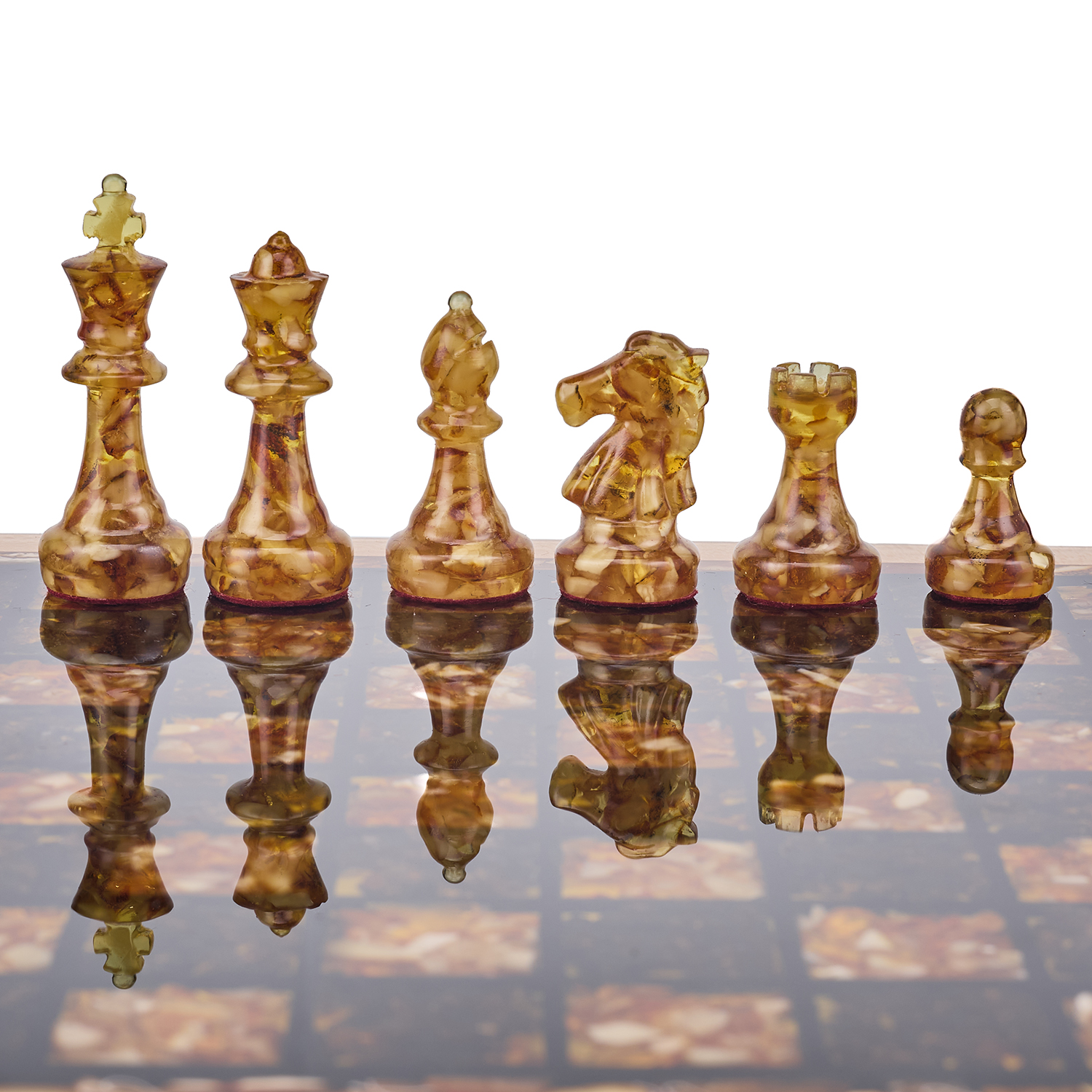 Шахматы с инкрустацией и фигурами из янтаря 28х28 см