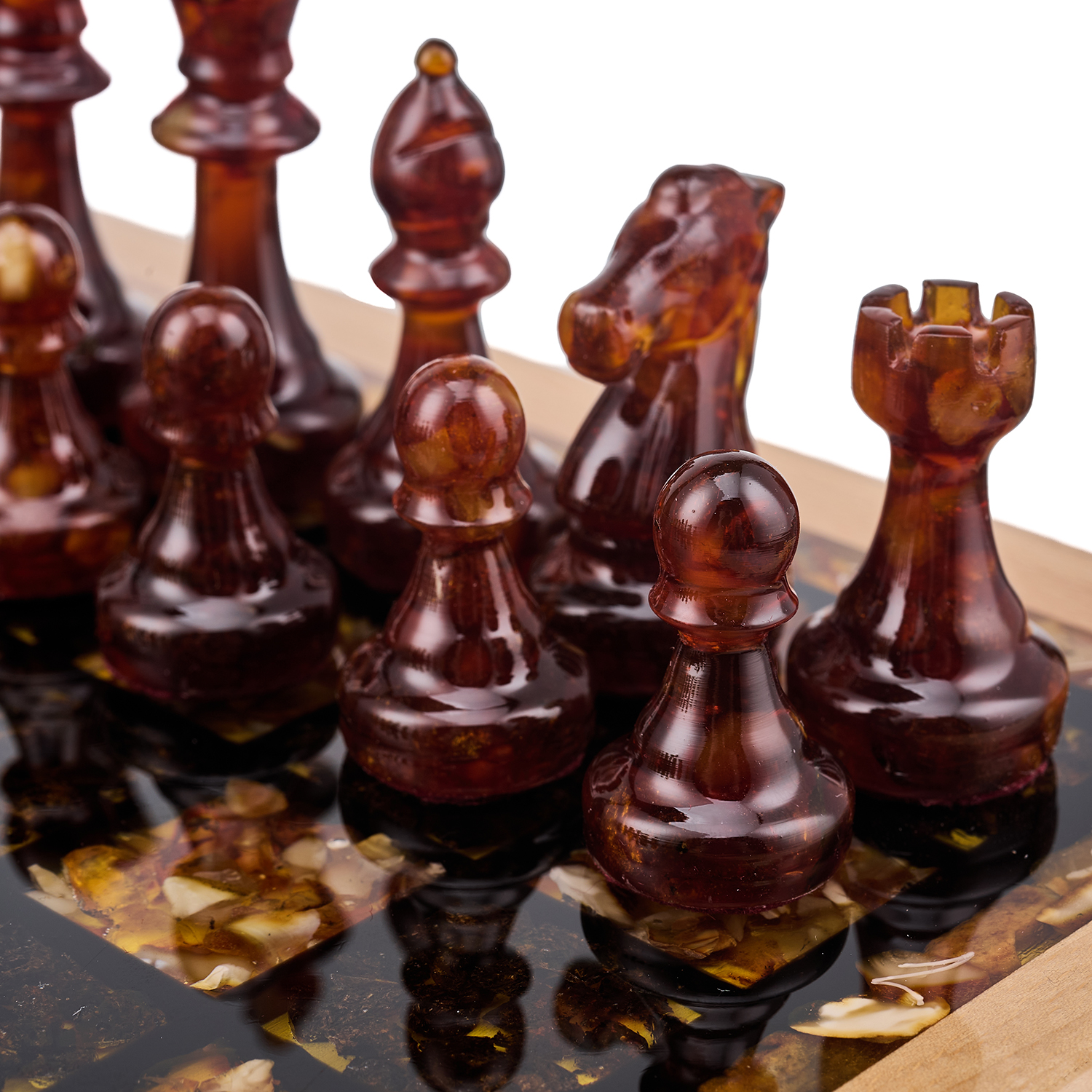 Шахматы с инкрустацией и фигурами из янтаря.Материалы: дуб, ясень, янтарь, полиэфирная смола.