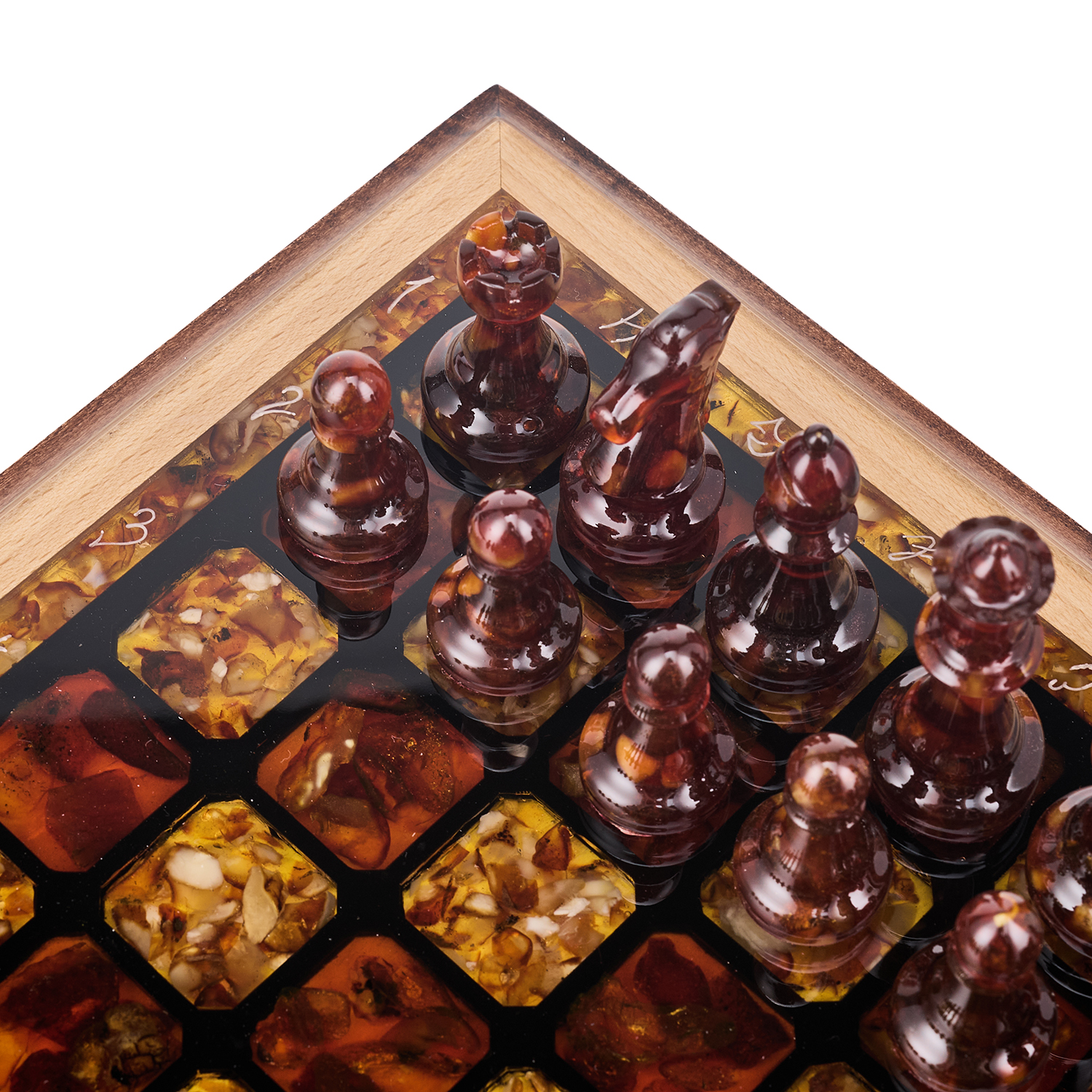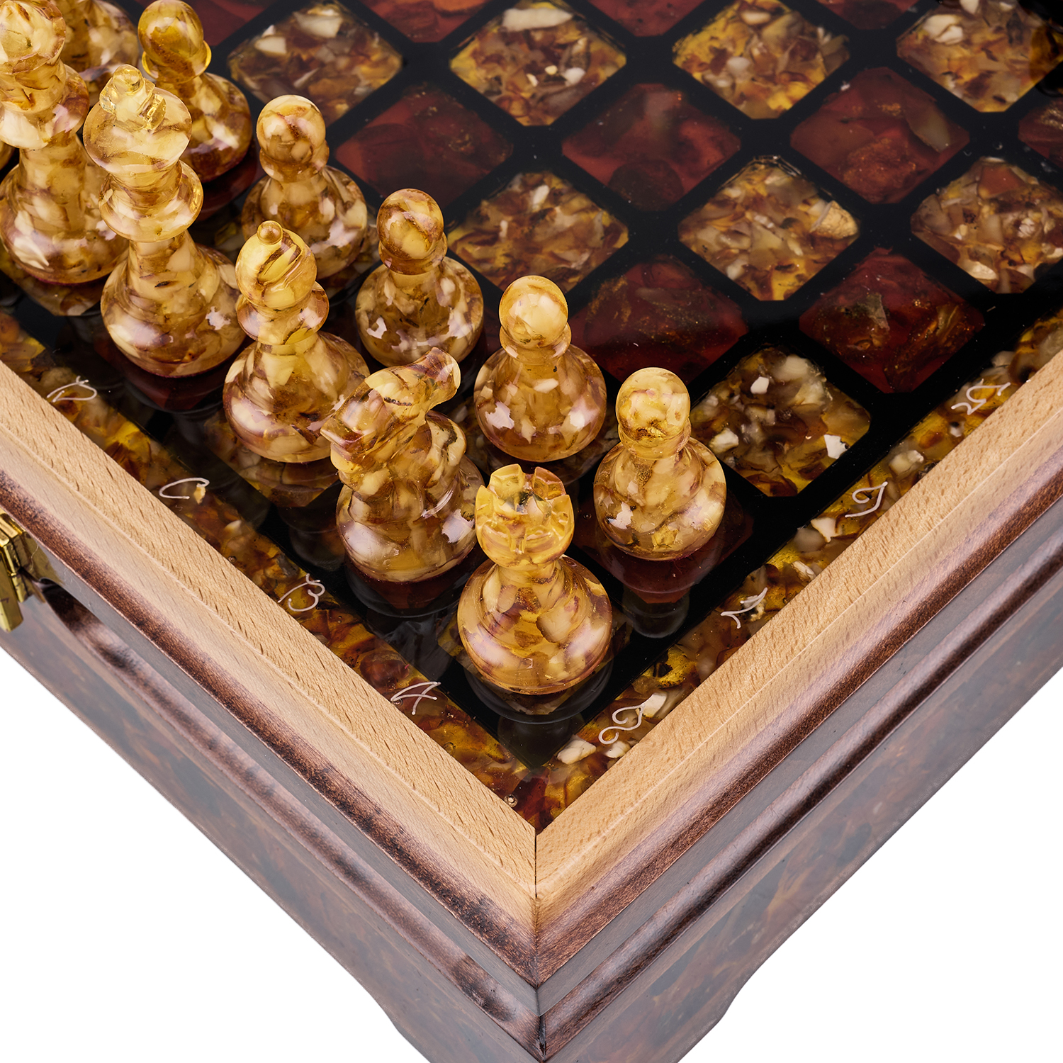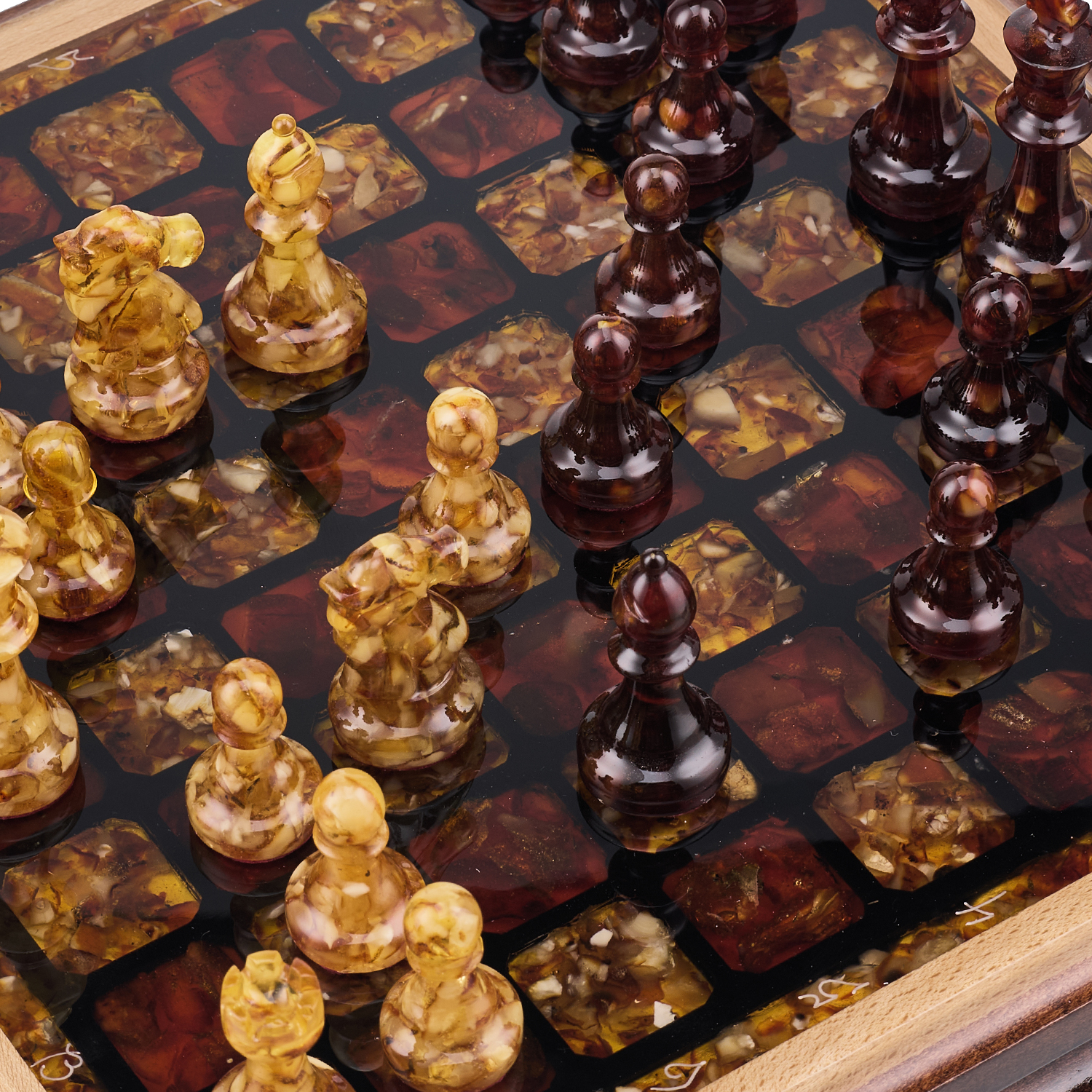Шахматы с инкрустацией и фигурами из янтаря 28х28 см