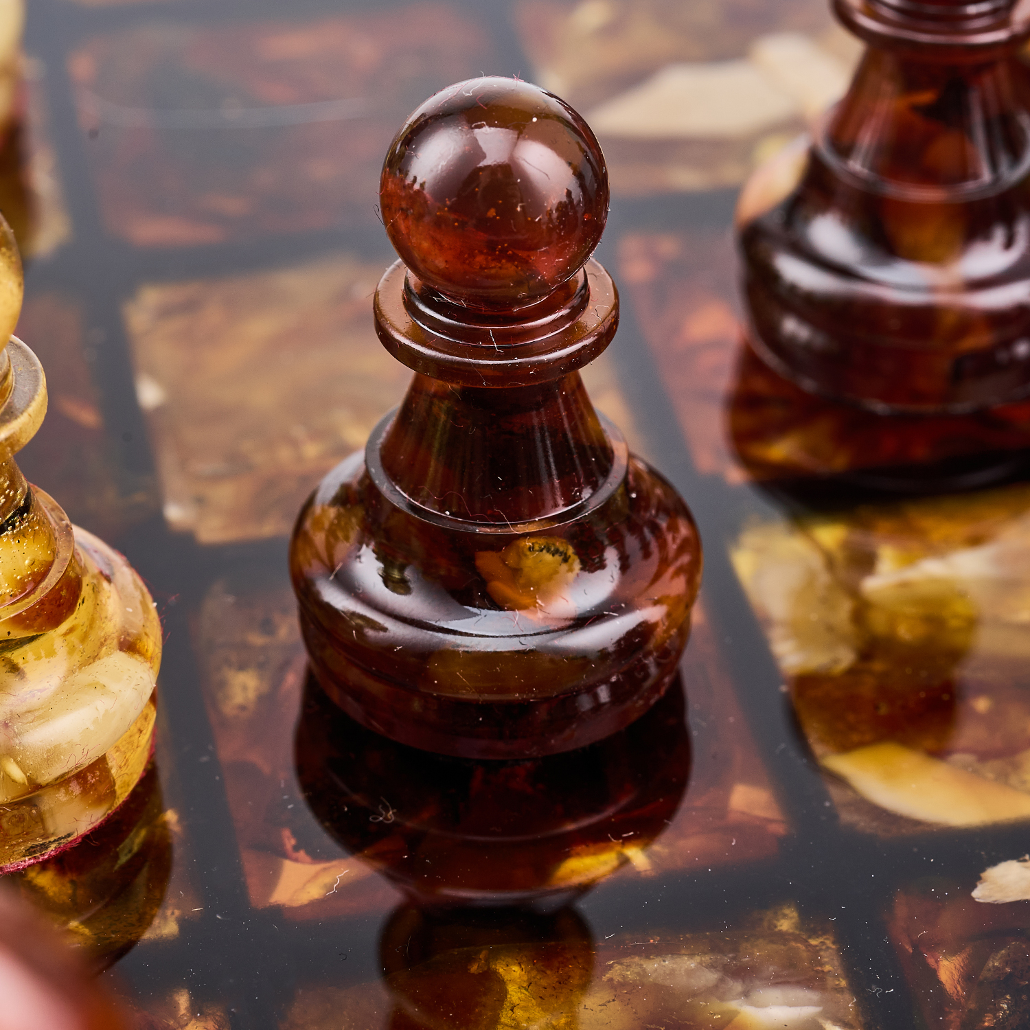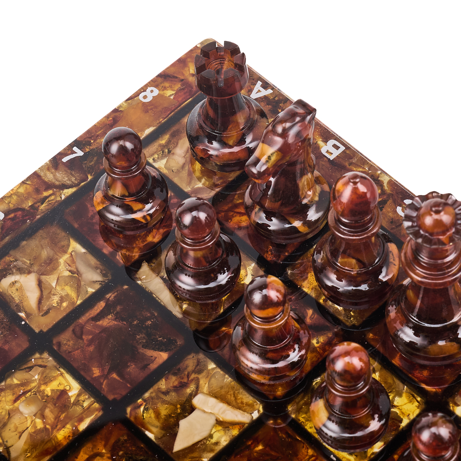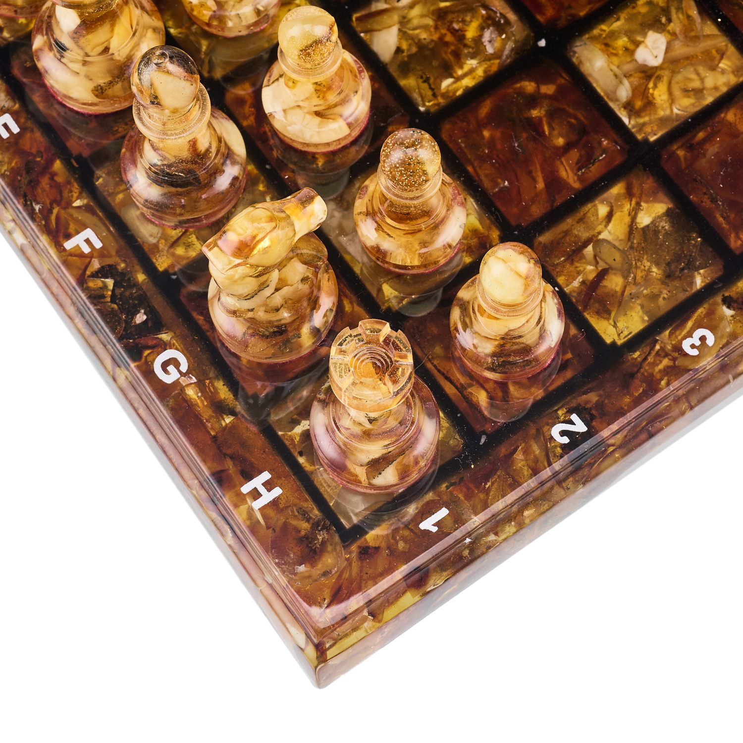 Шахматы с янтарными фигурами.Материалы: янтарь, полиэфирная смола.