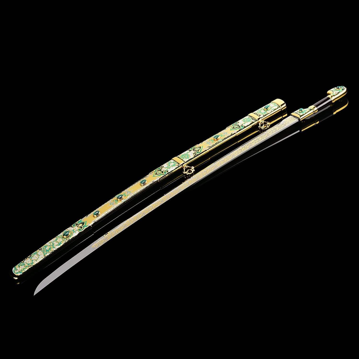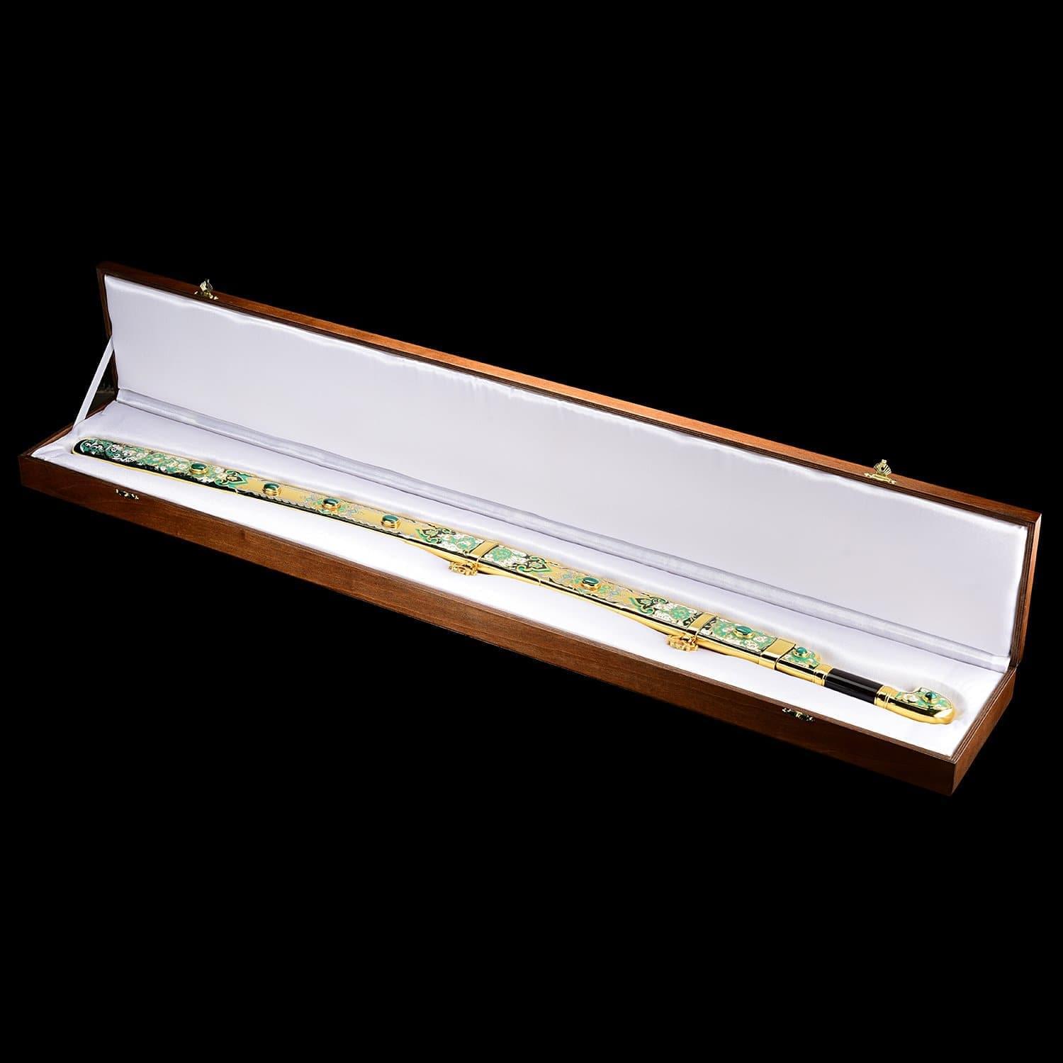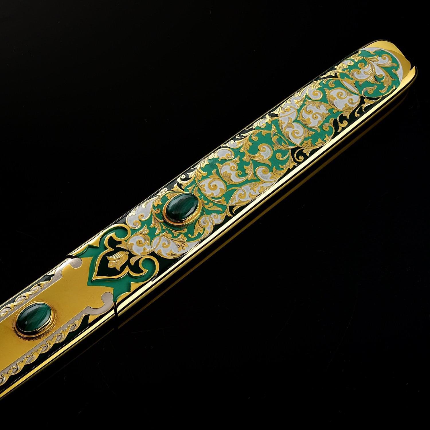 «Шашка должна быть легкой, как перо, острой, как бритва, и гибкой, как лоза», - гласит черкесская пословица. В России шашка долго оставалась одним из основных видов оружия на Кавказе. Оружейный завод в уральском городке Златоуст был основан в начале 19 века по указу русского императора и самодержца Александра I. С русскими оружейниками делились опытом их немецкие коллеги, мастера оружейного дела, научившие русских мастеров гравировать сталь по особой технологии. Тогда же зародился особый вид народного промысла Златоустовская гравюра на металле. Рукоять шашки состоит из частей, отлитых из латуни, украшенных гравировкой. Ножны оформлены методом литья и декорированы растительным орнаментом, расписанным разноцветной эмалью. Корпус ножен, как и навершие с гардой рукояти, украшен малахитом в виде кабошонов. Самоцвет является природным минералом, который издавна известен целебными и магическими свойствами. Шашка уложена в стильную подарочную упаковку из дерева. Материал: сталь, латунь, эмаль, никель хром, золото 999,9, малахит. Размеры: общая длина - 99 см. длина клинка - 81 см. ширина клинка - 3,1 см. Техника исполнения: токарные работы, рисовка кистью, гравировка иглой по лаку, травление, гравировка резцом, полировка, никелирование, золочение. В изделии использовались традиционные методы обработки и украшения Златоустовской гравюры на металле. .