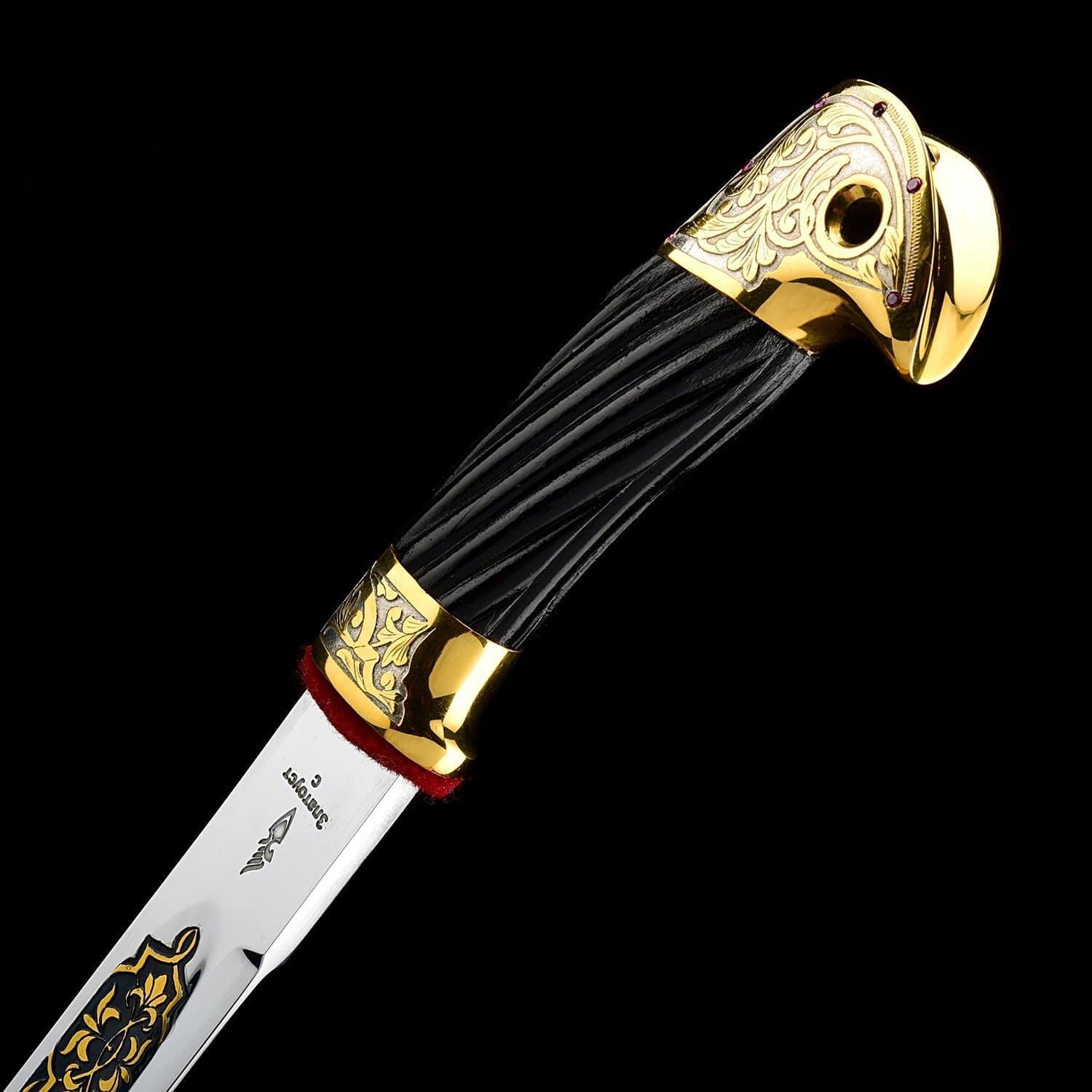 Настоящую казачью шашку создали оружейники из уральского Златоуста. Оружие изготовлено по старинному методу, освоенному еще в дореволюционной России, во времена правления императора Александра I. Традиция украшать холодное оружие зародилась в глубокой древности на Востоке. В Европе эта традиция существовала с XII века. К концу XVIII века вид художественно-прикладного искусства пришел в упадок, чему способствовал переход от ручного производства оружия к массовому фабричному. Одним из самых известных в мире оружейных центров был г. Золинген в Германии. Производство оружия там возникло уже в XIII веке. У золингенских мастеров была своя отличительная особенность: они наносили клеймо на каждое оружие, отмечали свое имя и ставили надпись «Сделано в Золингене». Из украшений оружейники предпочитали орнамент или символические узоры, - они наносились методом гравировки поверх позолоты на орудие. Именно золингенские мастера в свое время и прибыли в Златоуст, чтобы передать русским специалистам навыки по позолоте и вытравке клинков: это была семья Шафов, отец и три сына. Шашка Казачья Златоуст. Оригинальная ручная работа мастеров Златоуста. Техника исполнения: ковка, слесарная обработка, никелирование, гравировка, золочение, травление, синение, подрезка по металлу. Материал: сталь 8ХФ, твердость клинка 25 HRC по Роквеллу, латунь, береза, кожа, фианиты, золочение, никелирование, синение. Размеры: общая длина 94 см. длина клинка 80 см. ширина клинка 3 см. В изделии использовались традиционные методы обработки и украшения Златоустовской гравюры на металле. ....Извините, товар отсутствует