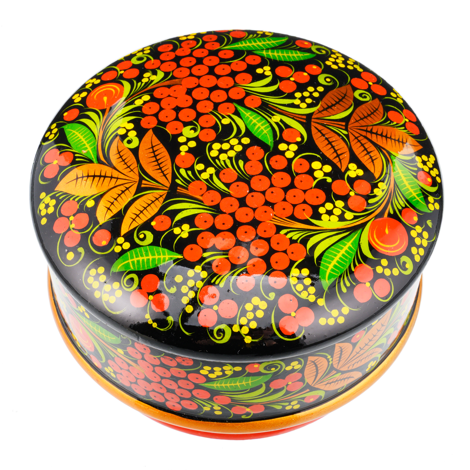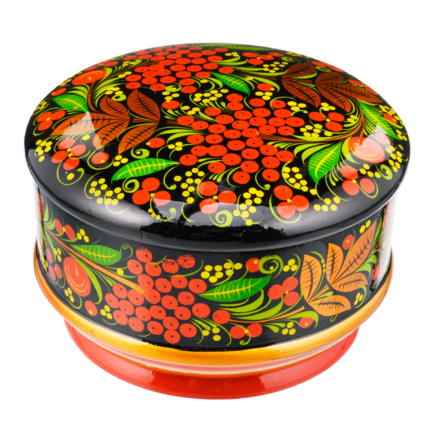 Русские подарки и сувениры → Хохлома → Шкатулки Хохлома → Деревянная круглая шкатулка с росписью "Рябина". Хохлома
