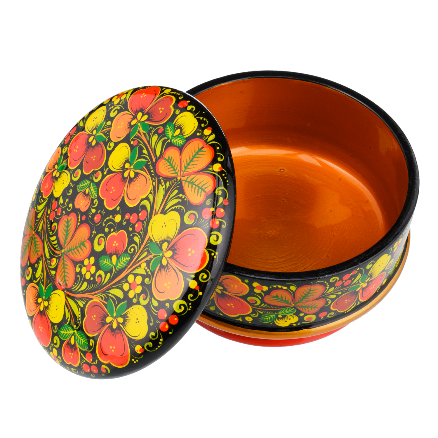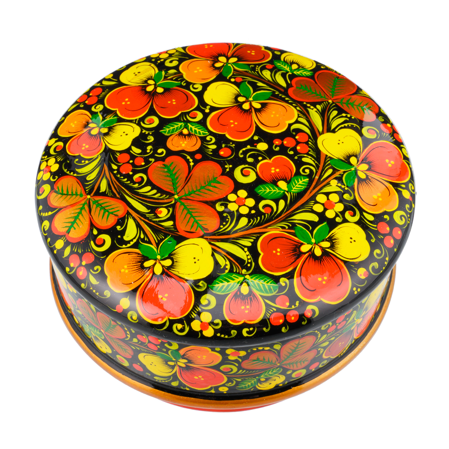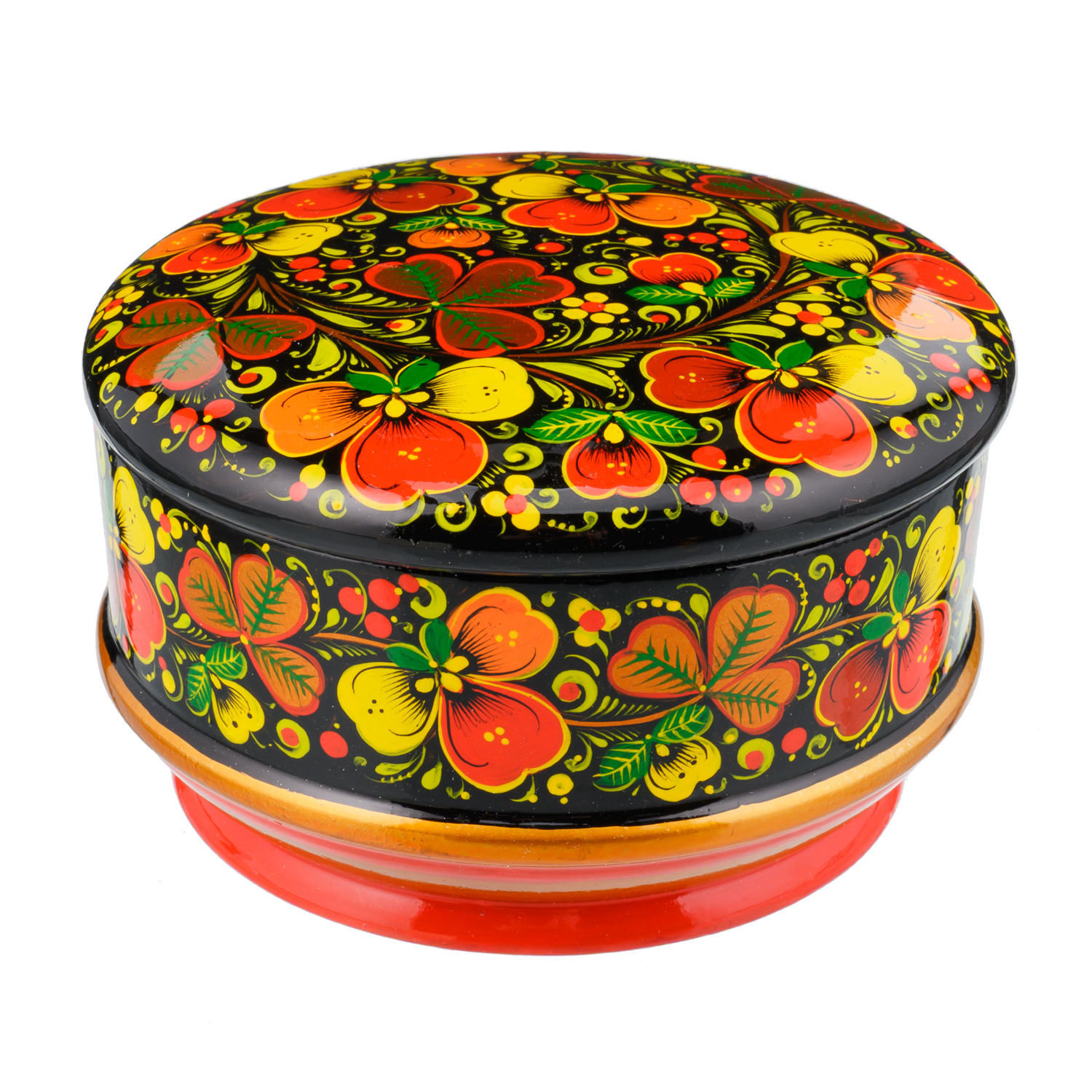 Русские подарки и сувениры → Хохлома → Шкатулки Хохлома → Деревянная круглая шкатулка с росписью "Цветы". Хохлома