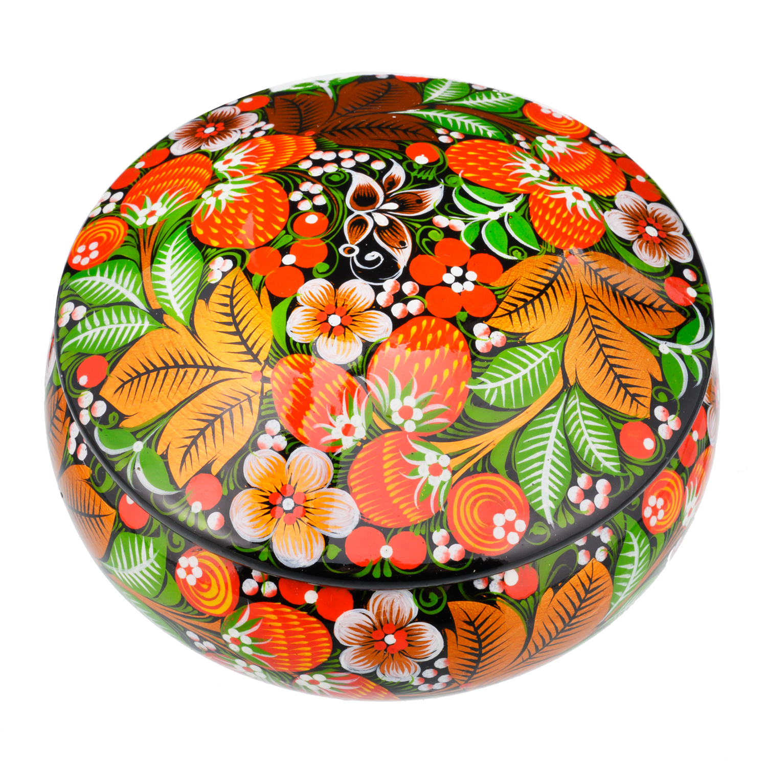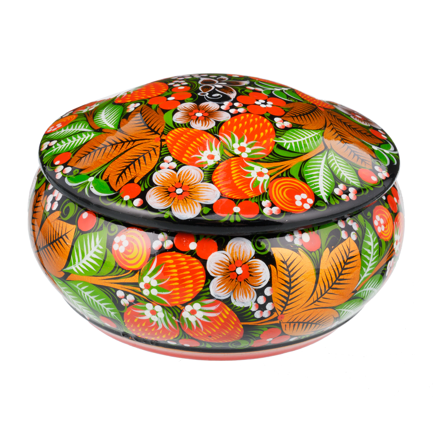 Русские подарки и сувениры → Хохлома → Шкатулки Хохлома → Деревянная круглая шкатулка с росписью "Клубника". Хохлома
