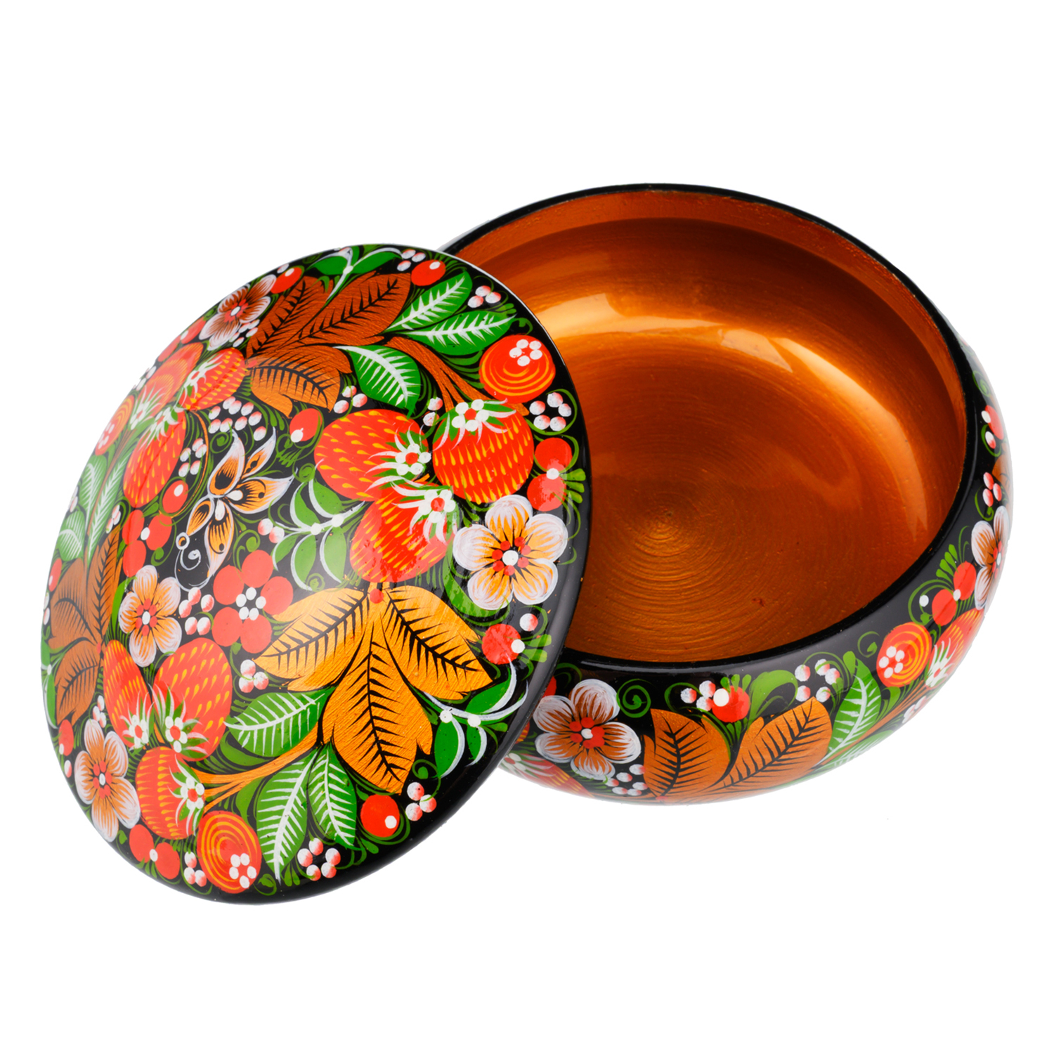 Деревянная круглая шкатулка с росписью "Клубника". Хохлома.Материалы: дерево, краски, лак.