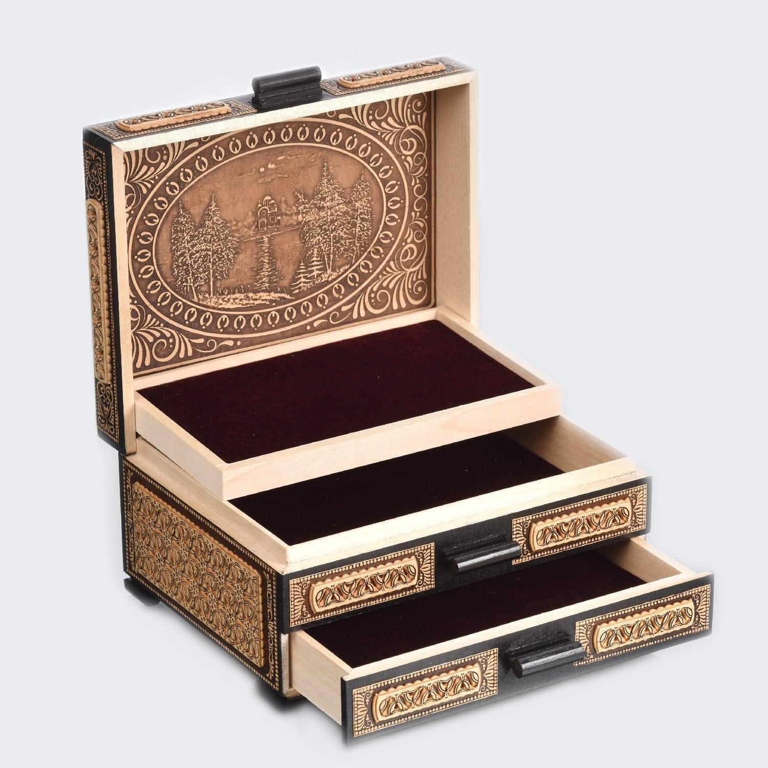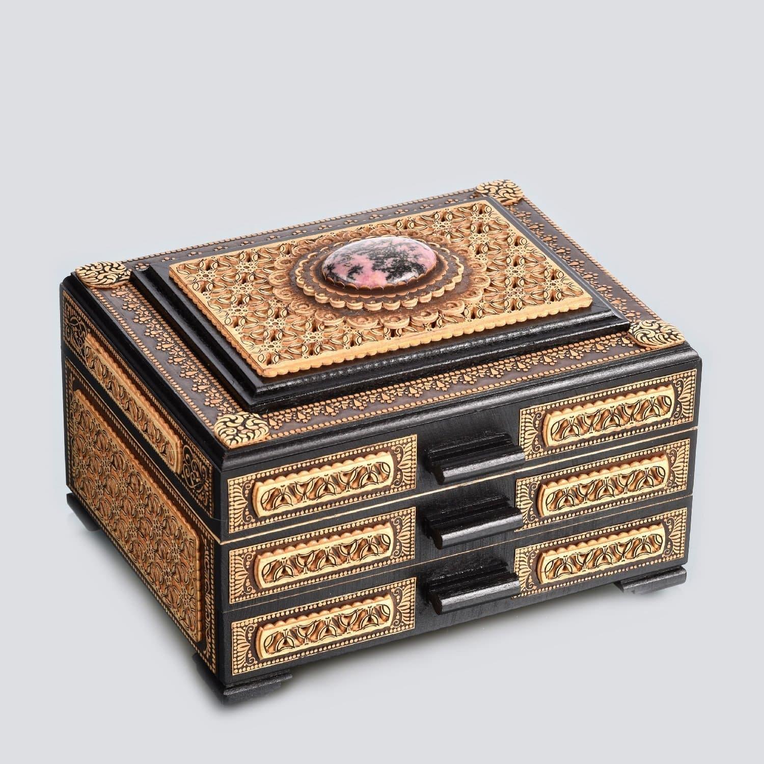Эта элегантная шкатулка-комод в русском стиле ручной выделки - прекрасный вариант подарка для мужчины, соотечественника или иностранца. Перед Вами - образец старинного русского народного берестяного промысла, который достоин восхищения. Вместительный комод из бересты с тремя отделениями станет находкой для любителя украшений. Его корпус оформлен детальным резным орнаментом и декорирован натуральным природным минералом в форме крупного кабошона - камнем-самоцветом родонитом...