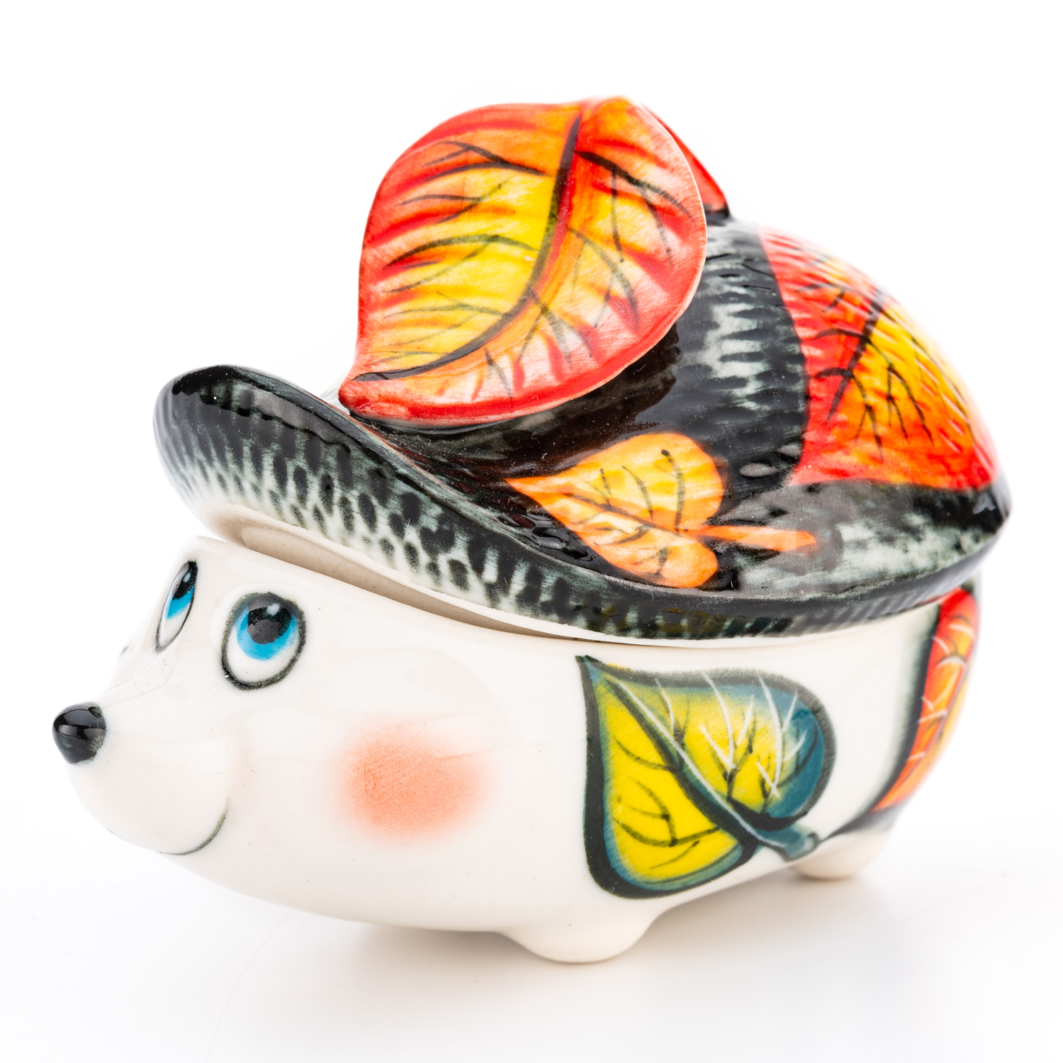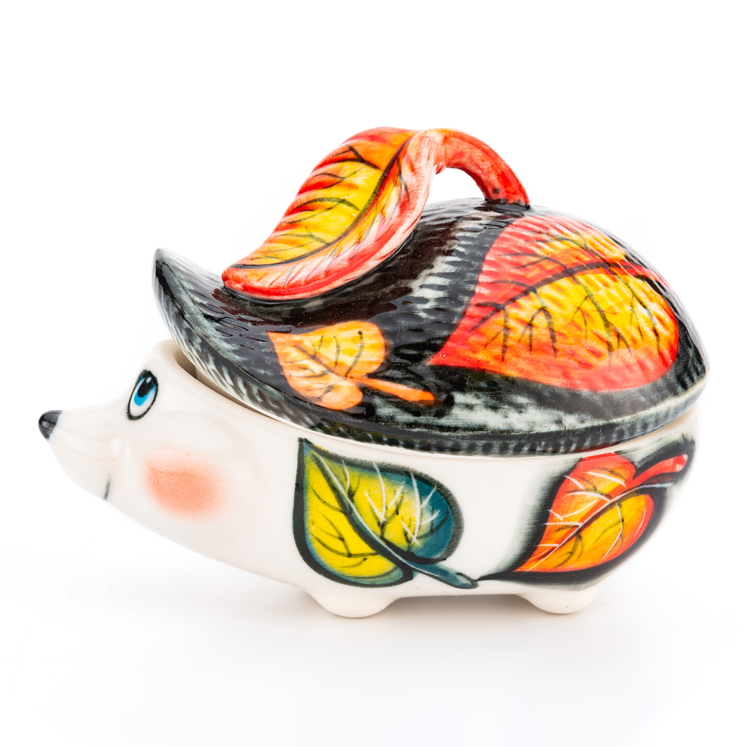 Очаровательная шкатулка «Ежик с листочком» выполнена из высококлассного фарфора и расписана вручную талантливыми мастерами. Она способна стать украшением любого интерьера, привнести в помещение ощущение уюта и тепла. Такую шкатулку можно использовать для хранения драгоценностей, памятных мелочей и других предметов. Яркая роспись и необычная форма делают её просто невероятным памятным подарком. Шкатулку можно преподнести близкому человеку или родственнику. Фарфоровый ёжик никого не оставит равнодушным.