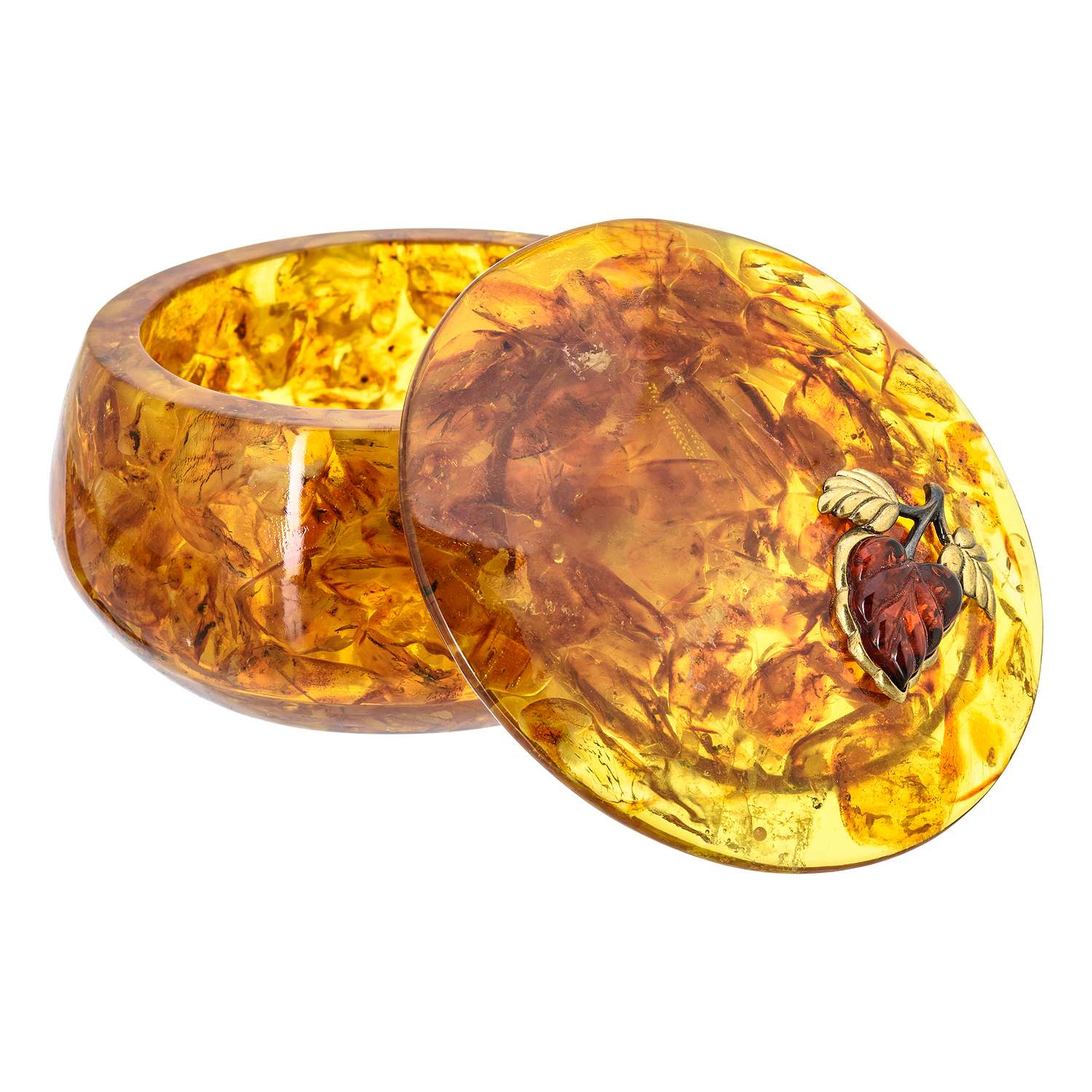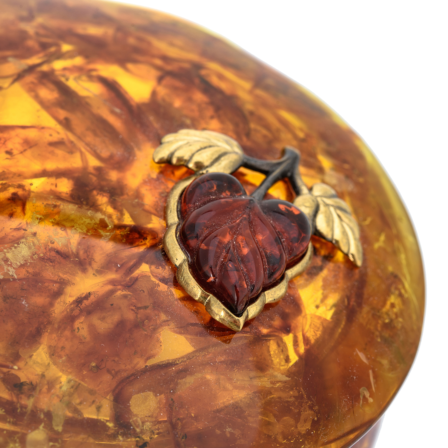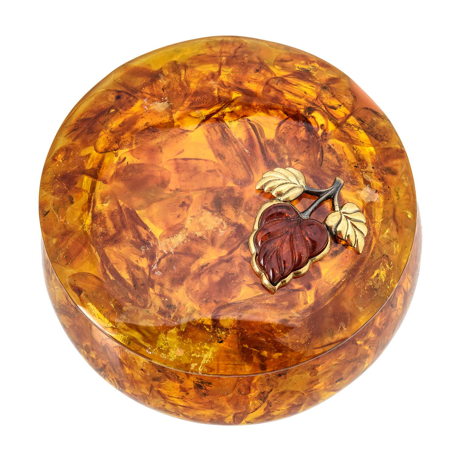 Круглая шкатулка из янтаря "Листик сирени"