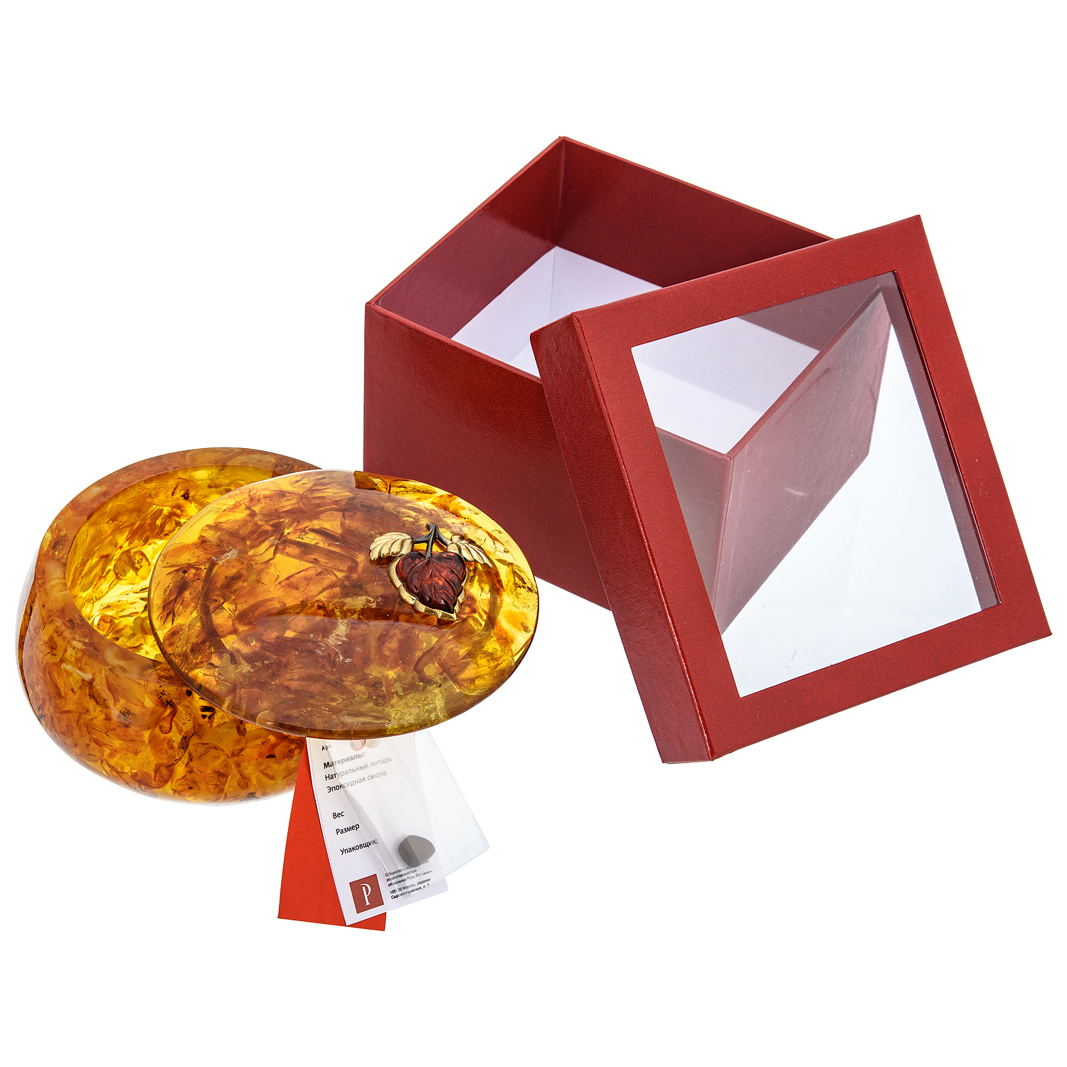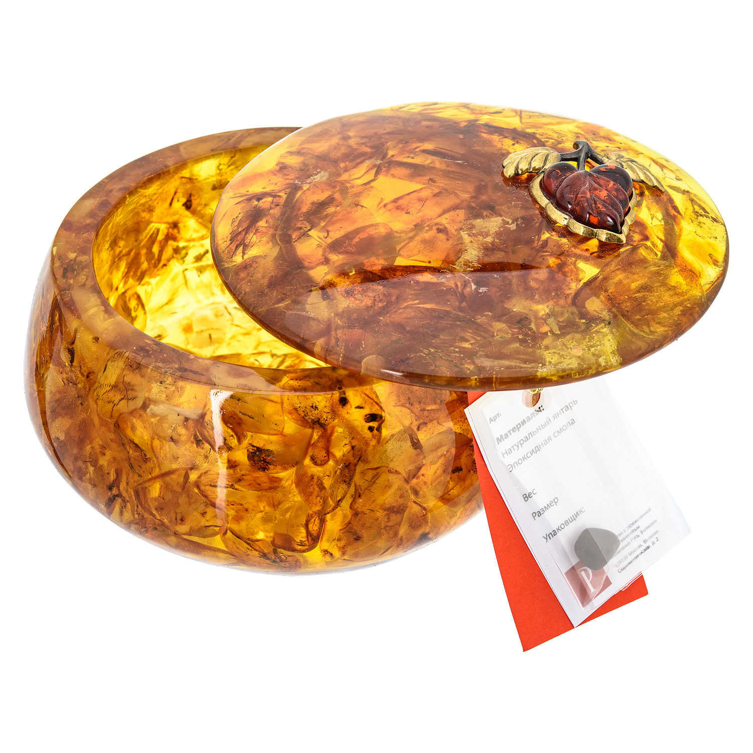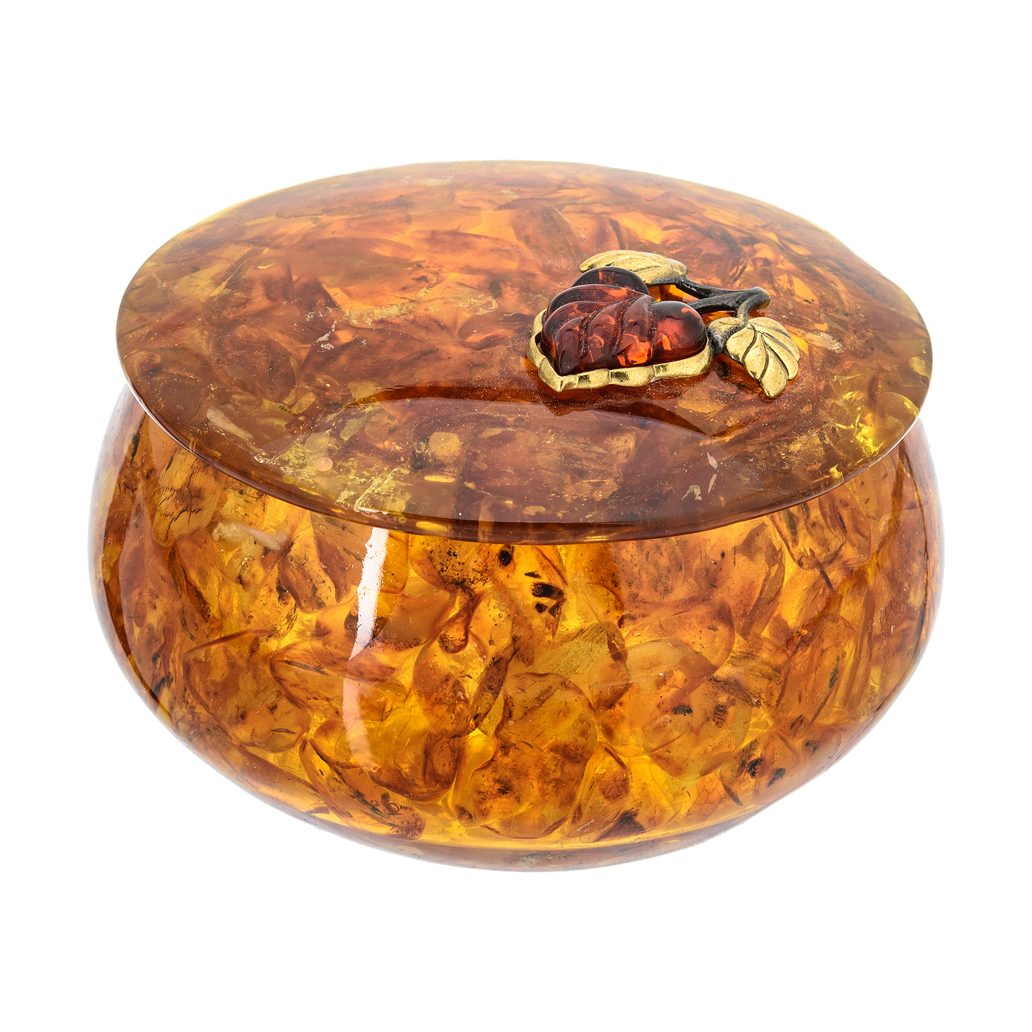Круглая шкатулка из янтаря "Листик сирени"