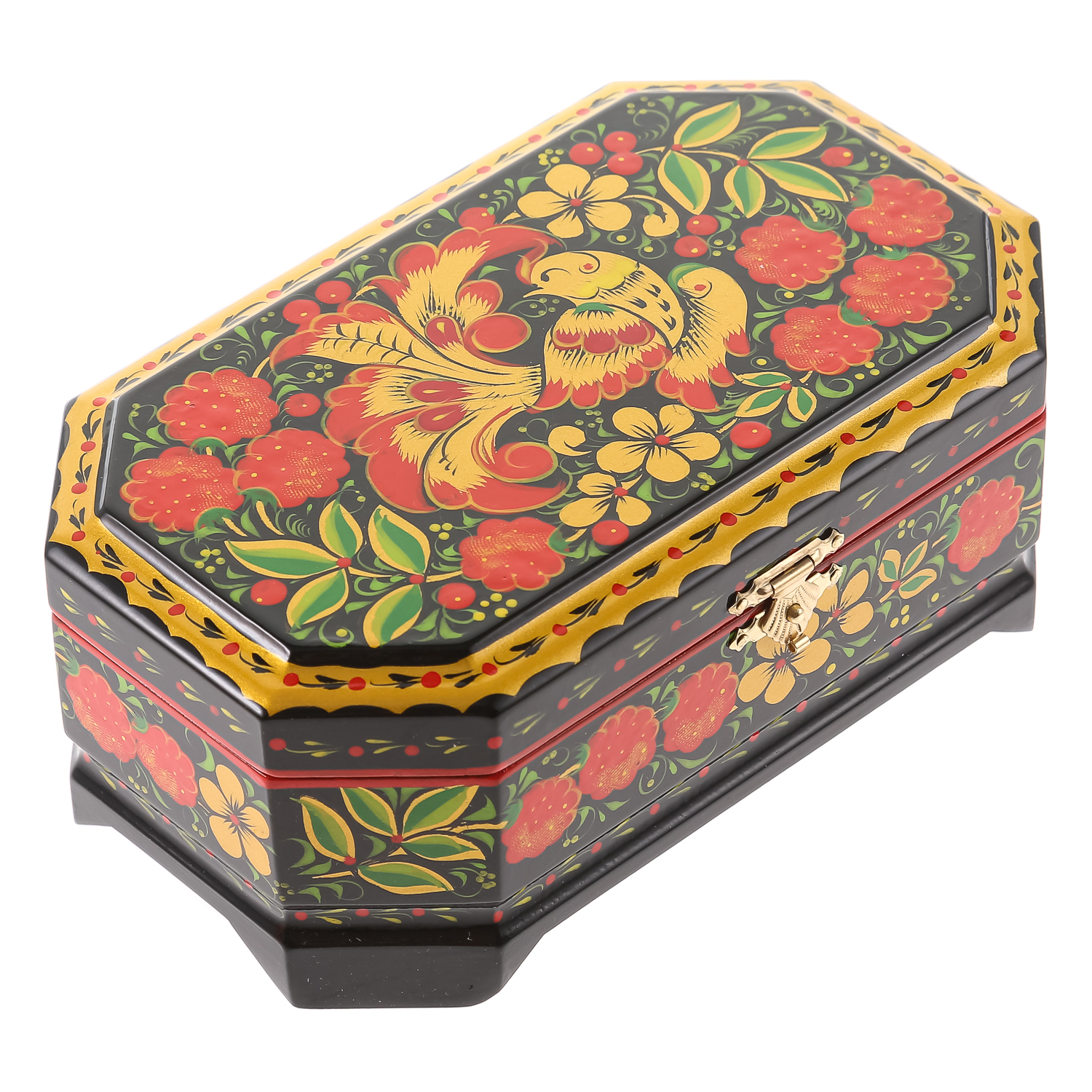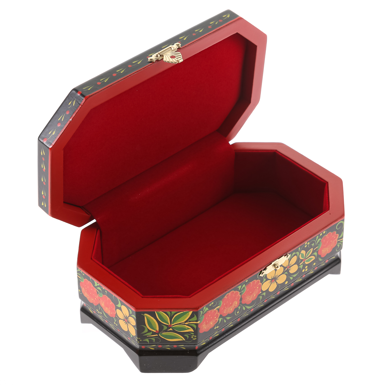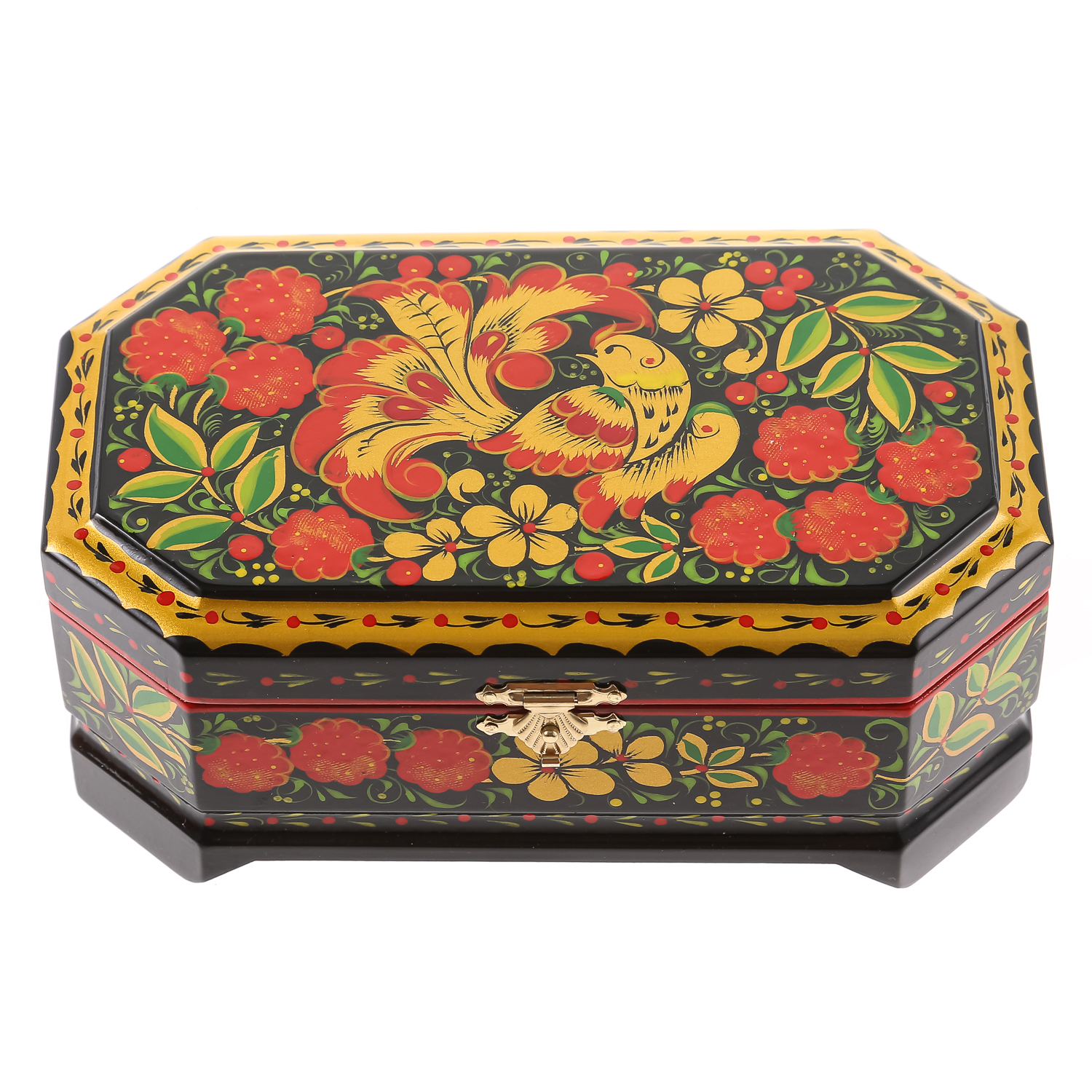 0074845/17*10см-углы Хохлома Шкатулка Сюжет "ПТИЦА.МАЛИНА" черный фон Р5
