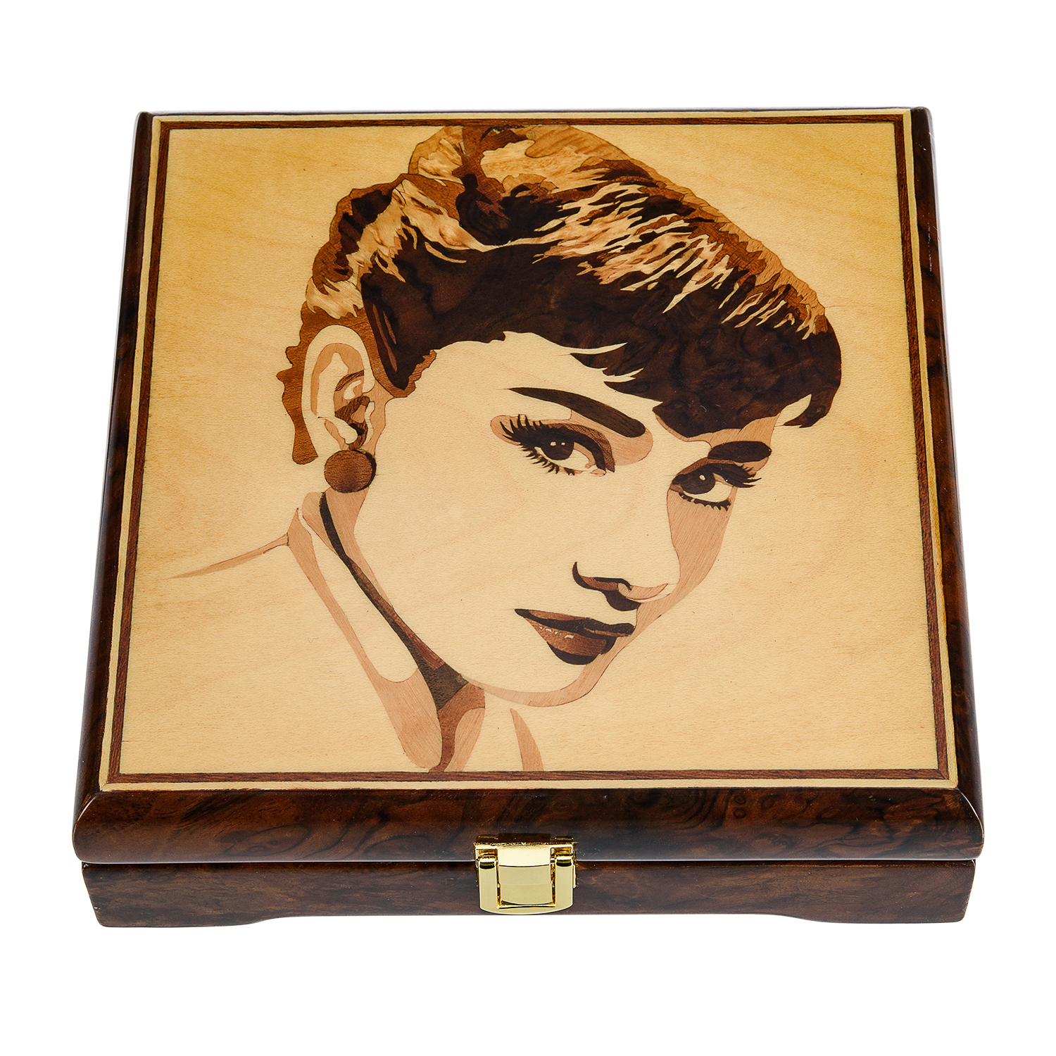 Деревянная шкатулка "Одри Хепберн".Материалы: корень ореха, клен, бук, красное дерево, карельская береза.