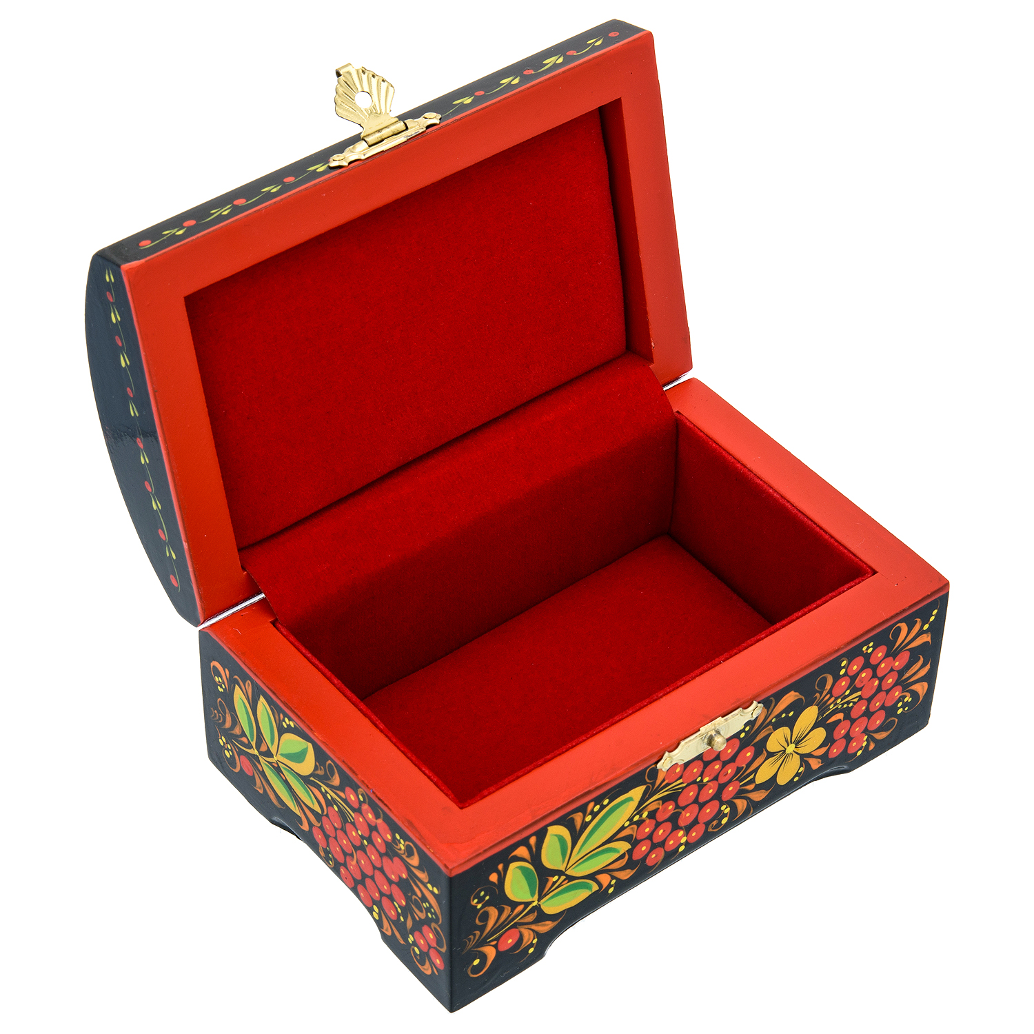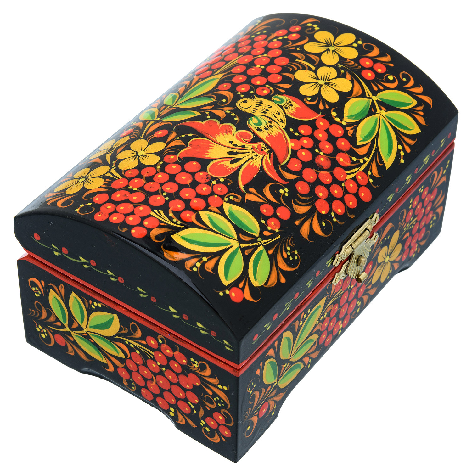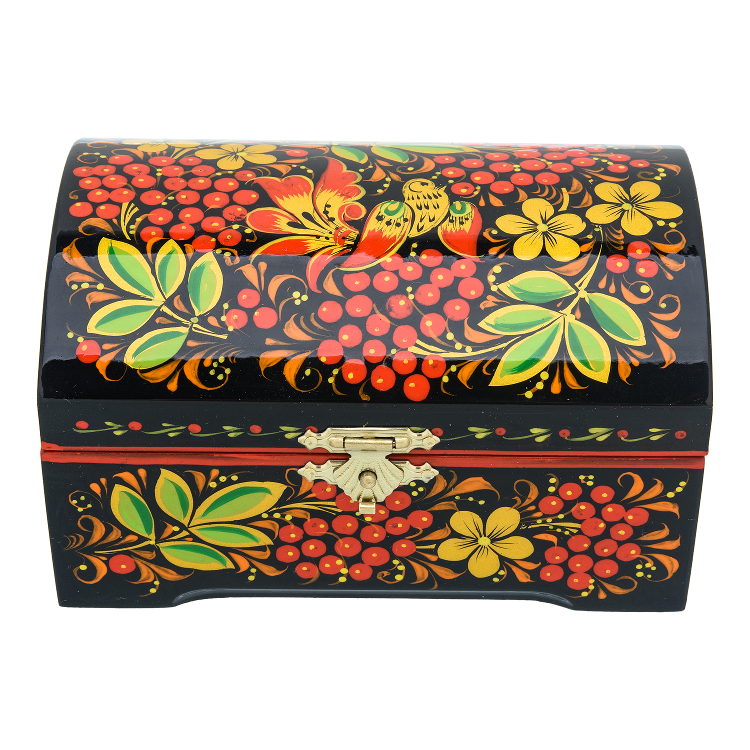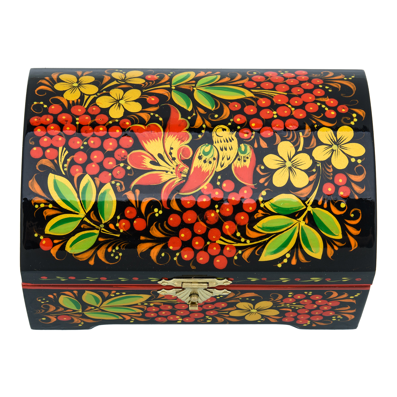 0073650-120*80мм Хохлома Шкатулка-Сундучок"ПТИЦА.РЯБИНА" черный фон Р2