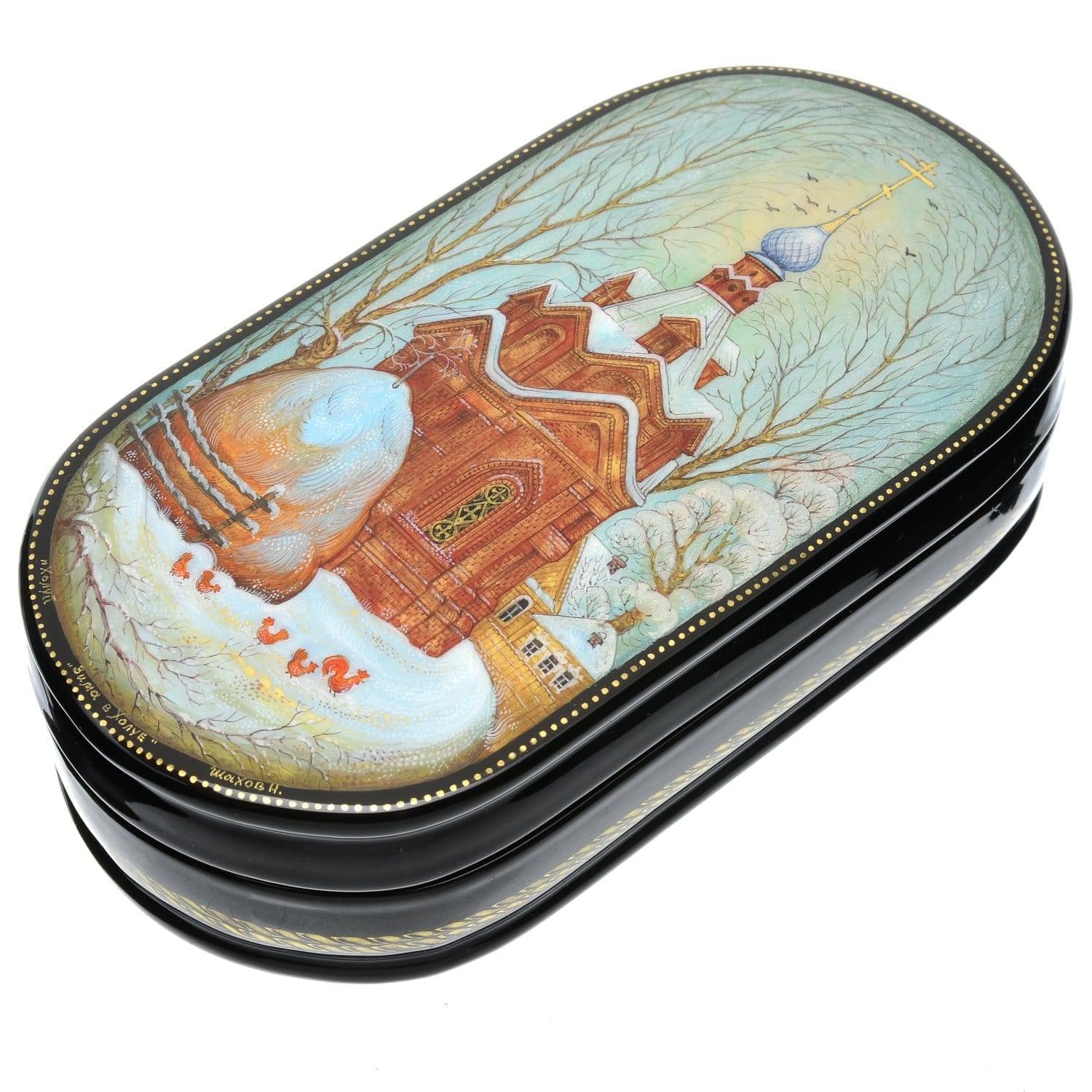 Лаковая миниатюра Шкатулка "Зима в Холуе. Часовня"