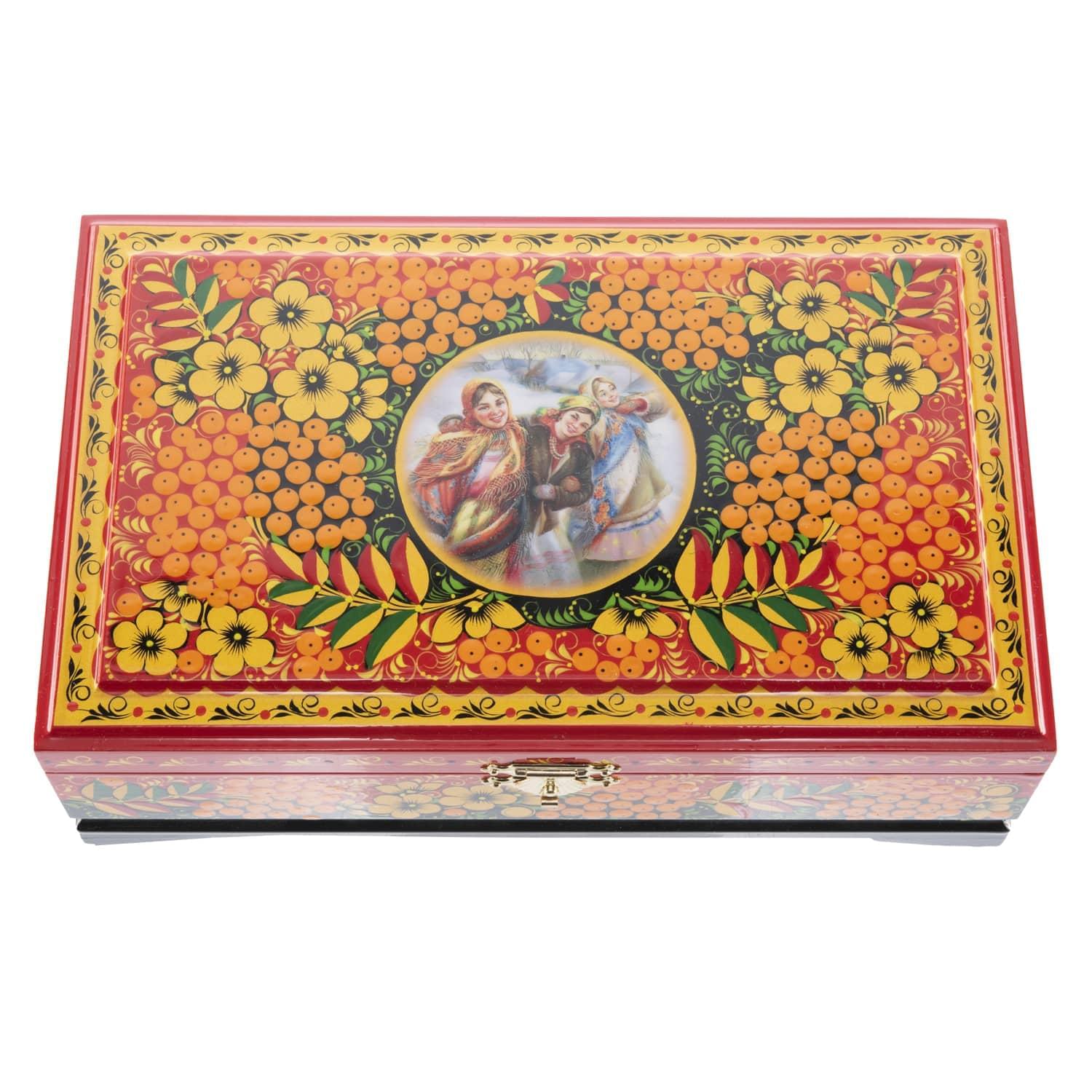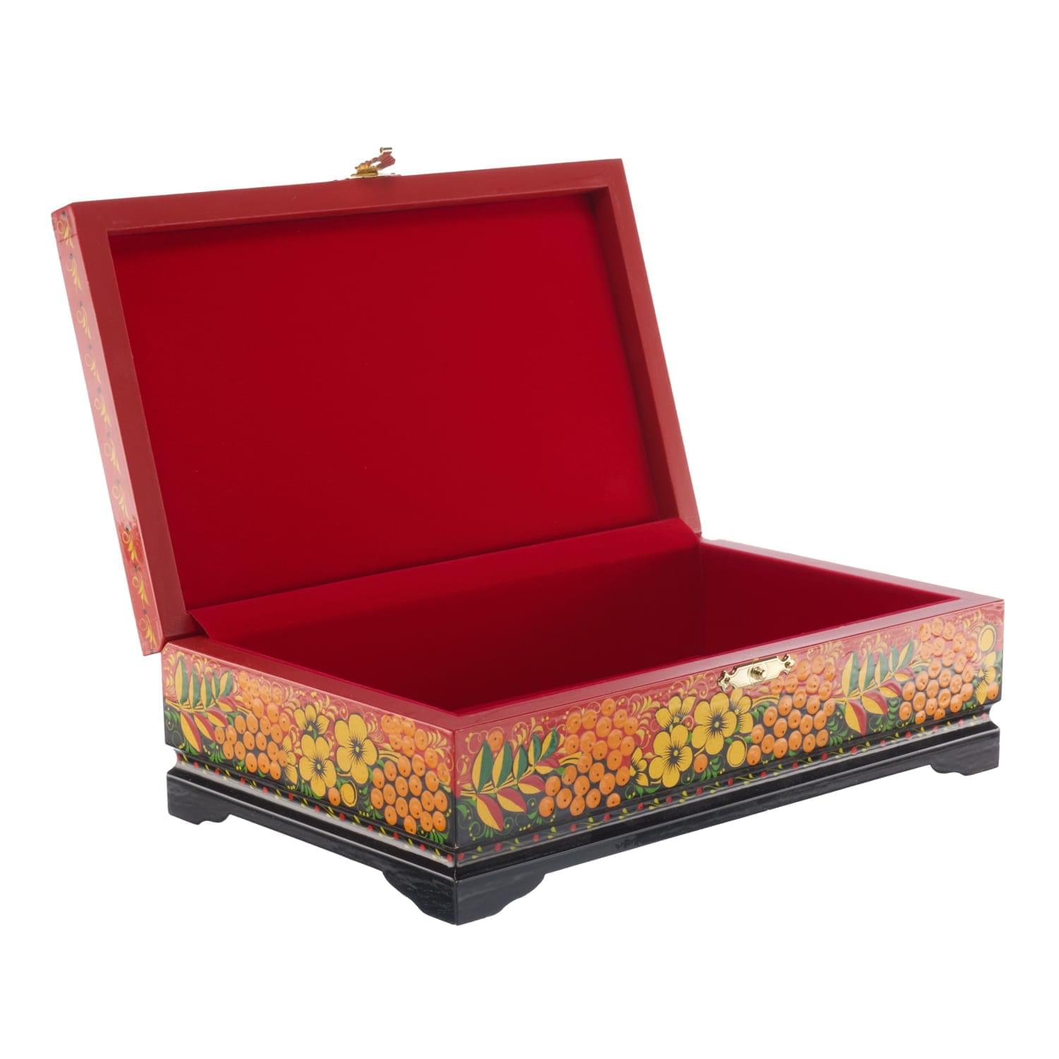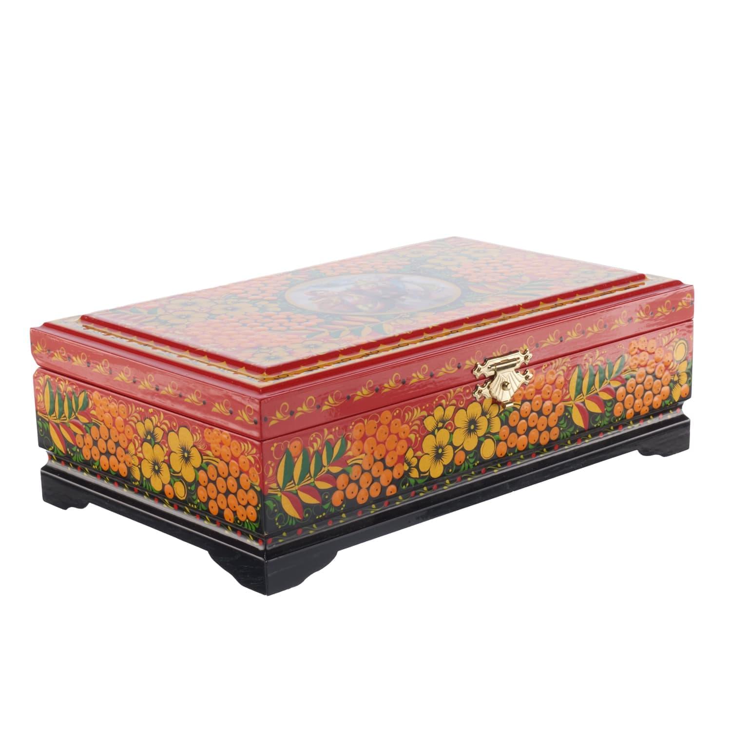 0064732/23*14см Хохлома Шкатулка 1 ОТДЕЛЕНИЕ "СЮЖЕТ.РЯБИНА"на красном Р7 .