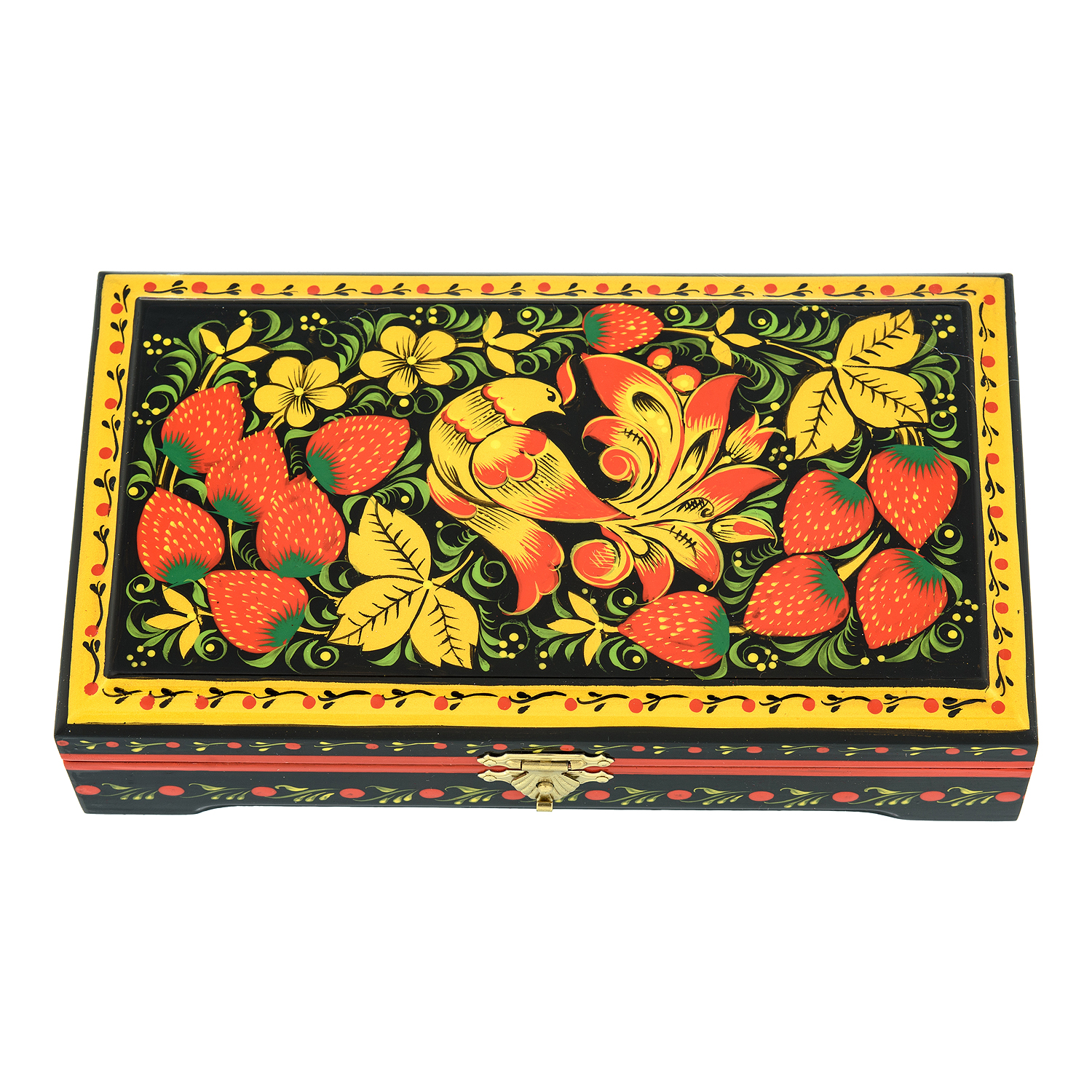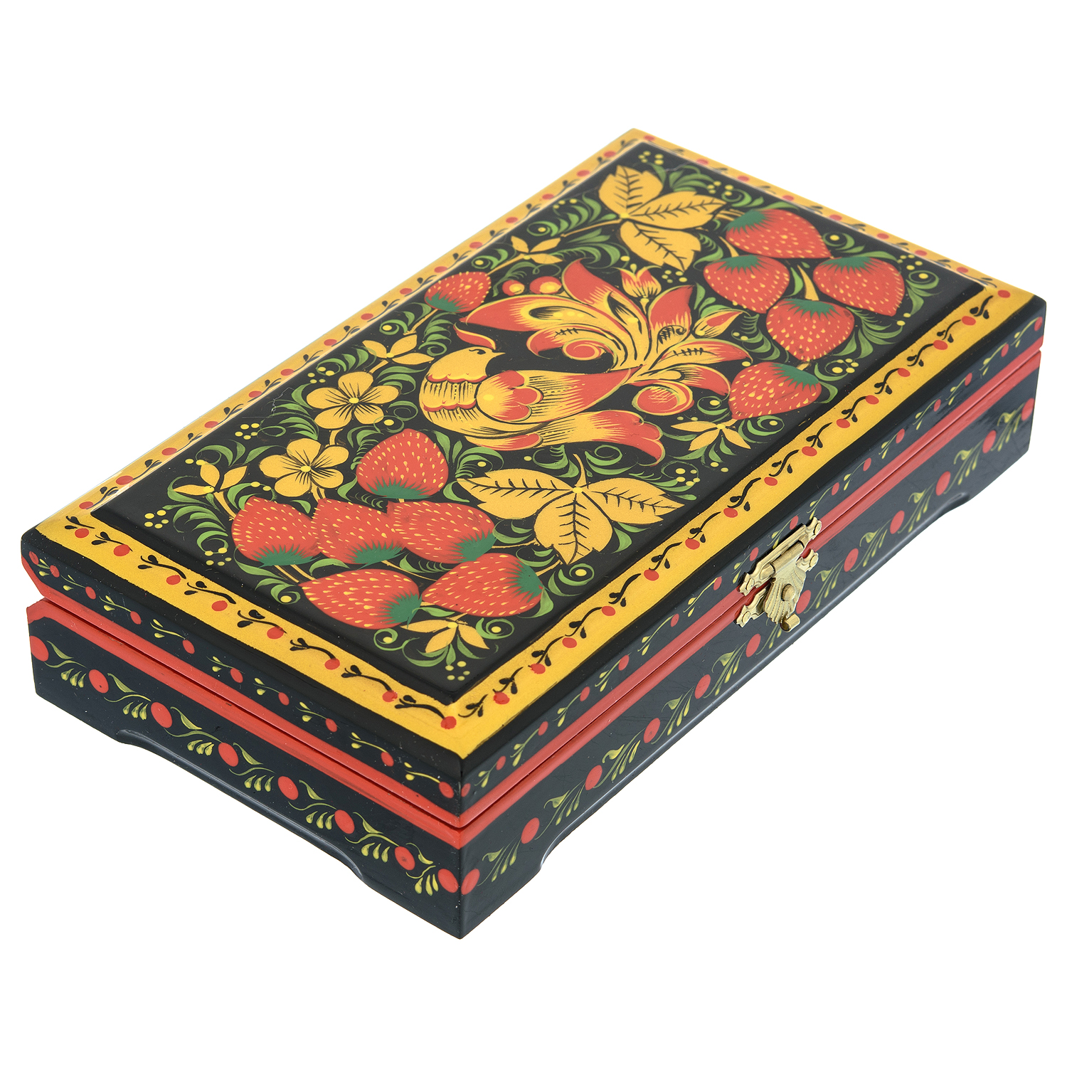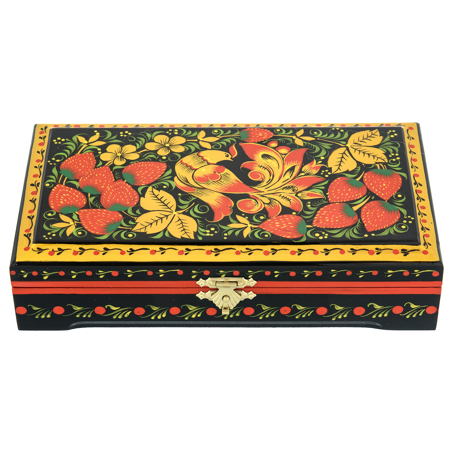 0078310 ХОХЛОМА ШКАТУЛКА "Клубника. Птичка" 18*10*4 (черный фон) Р11