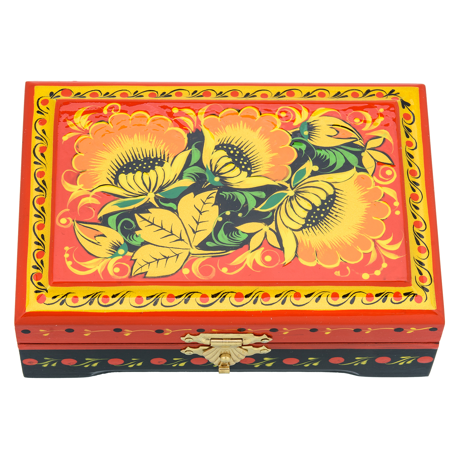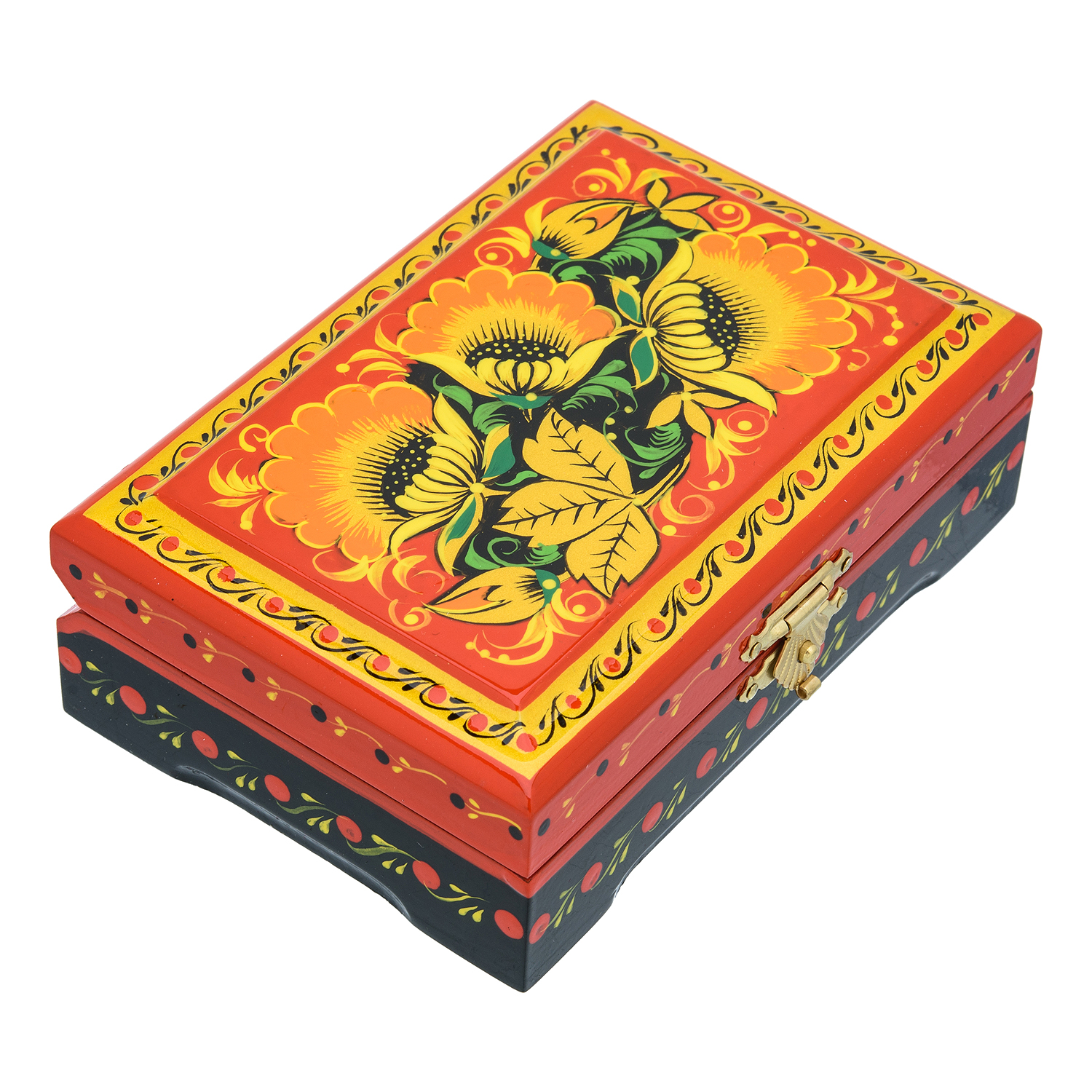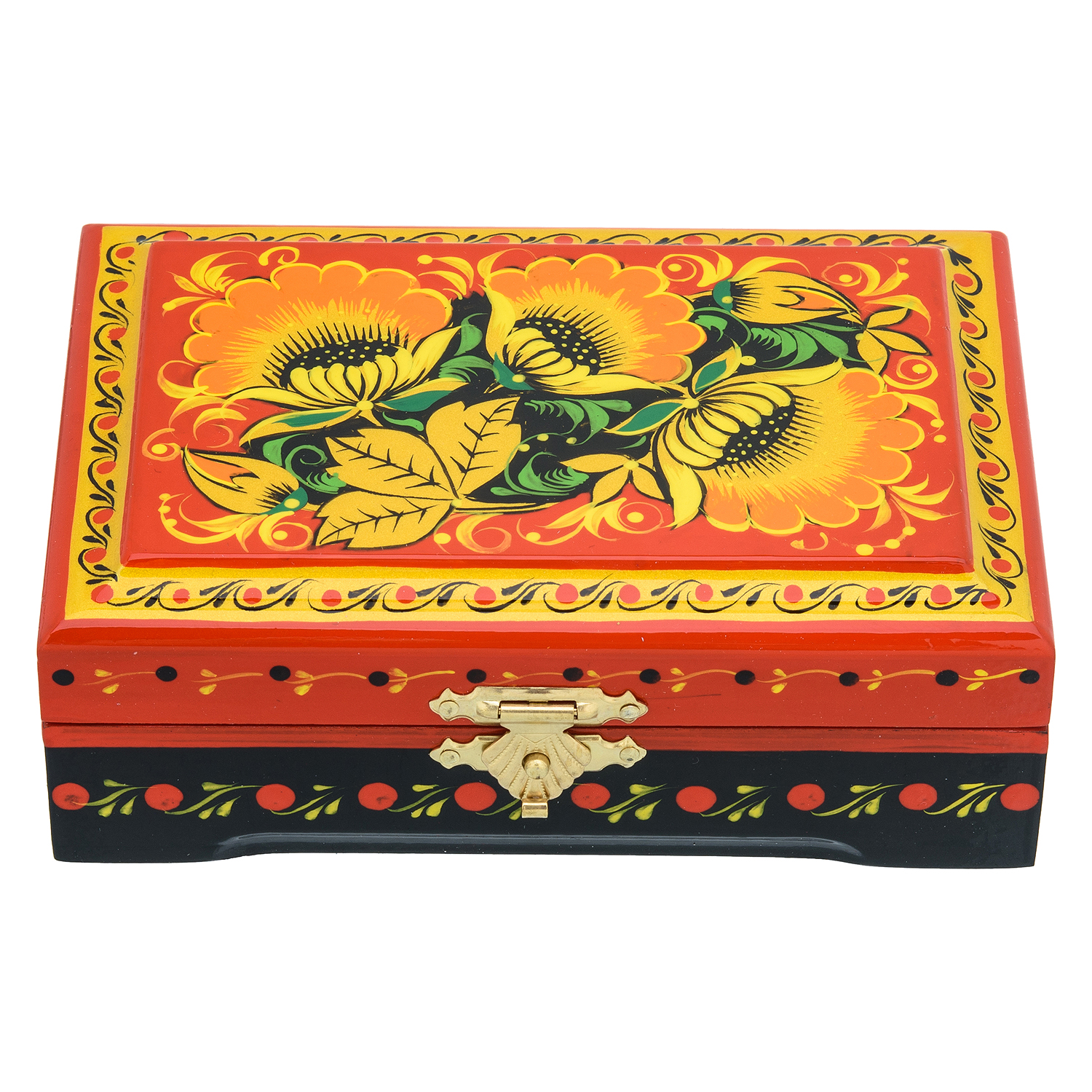 0073646-120*80мм Хохлома Шкатулка Р25 прямоугольная"ЗОЛОТЫЕ ЦВЕТЫ" красный фон