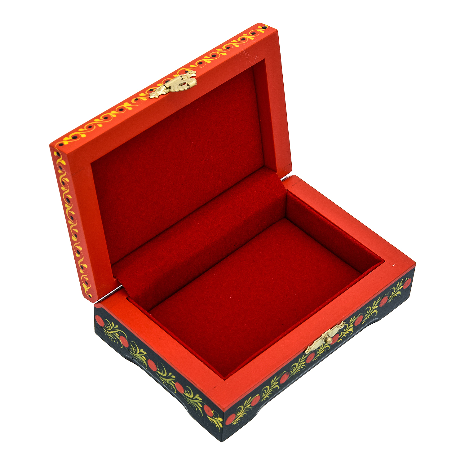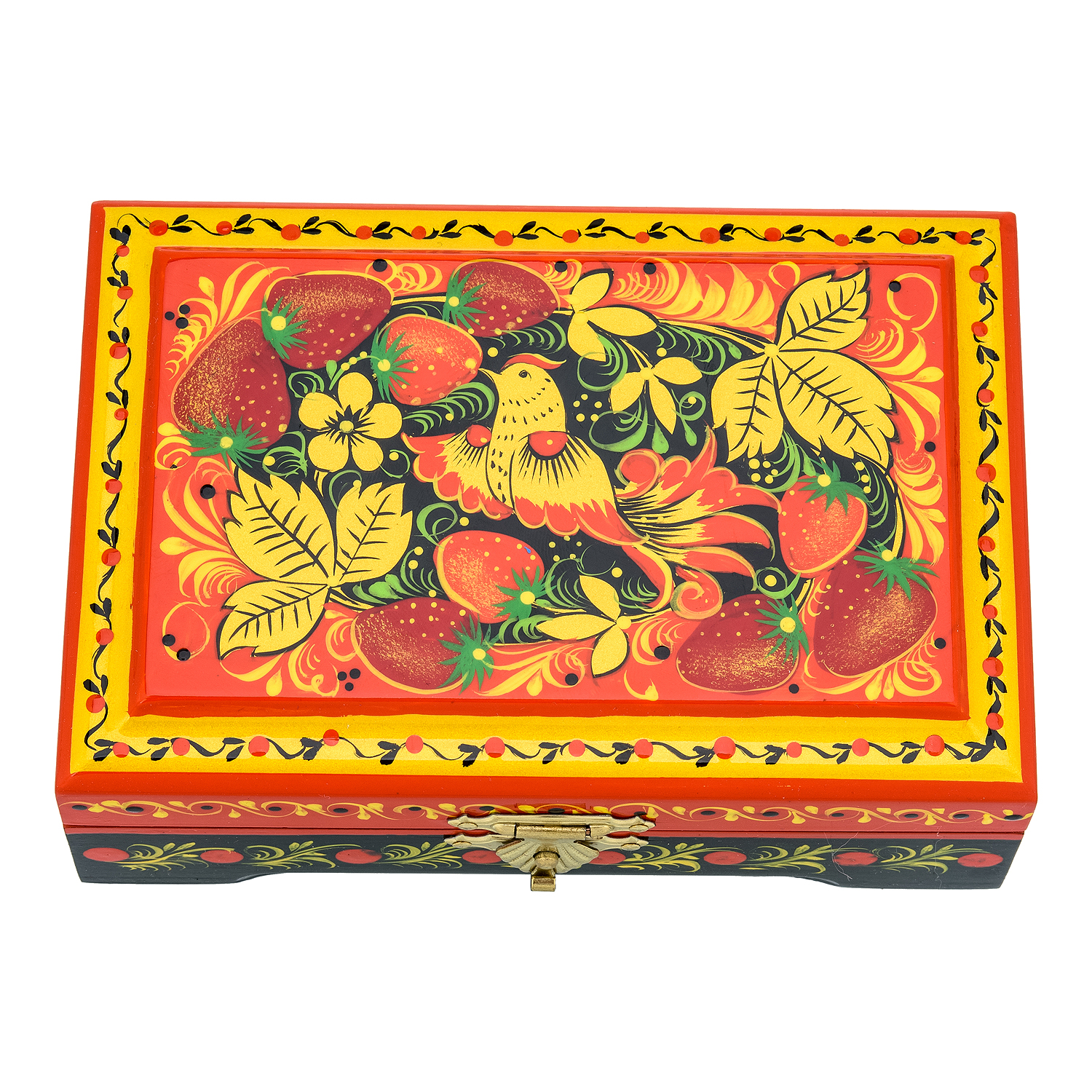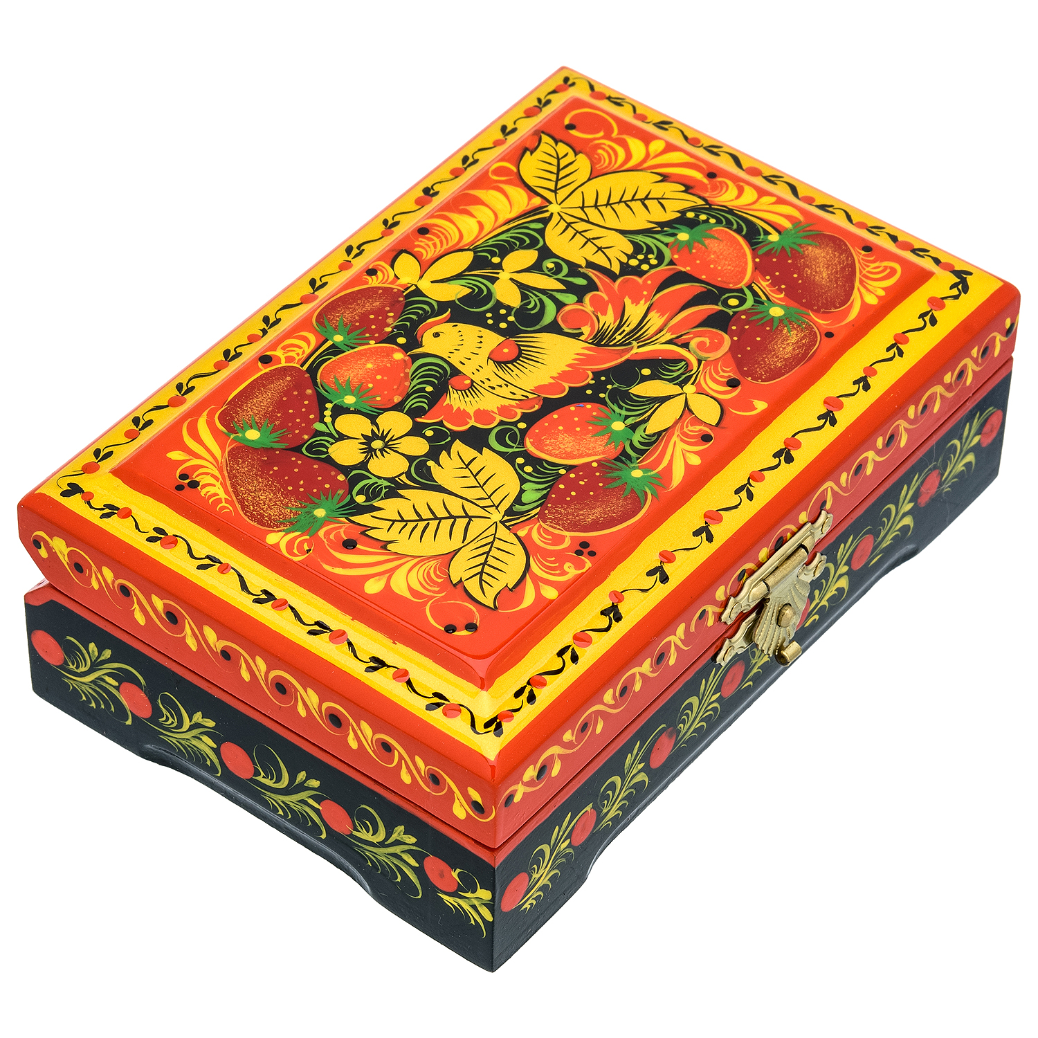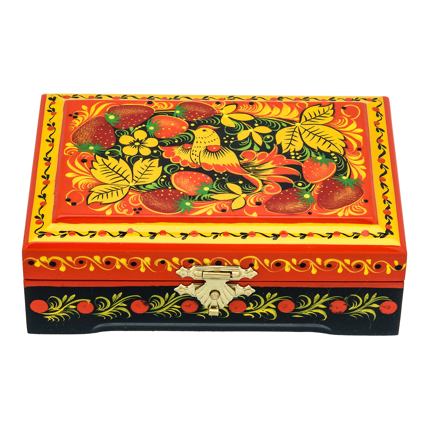 0073647-120*80мм Хохлома Шкатулка Р25 прямоугольная"ПТИЦА.КЛУБНИКА" красный фон