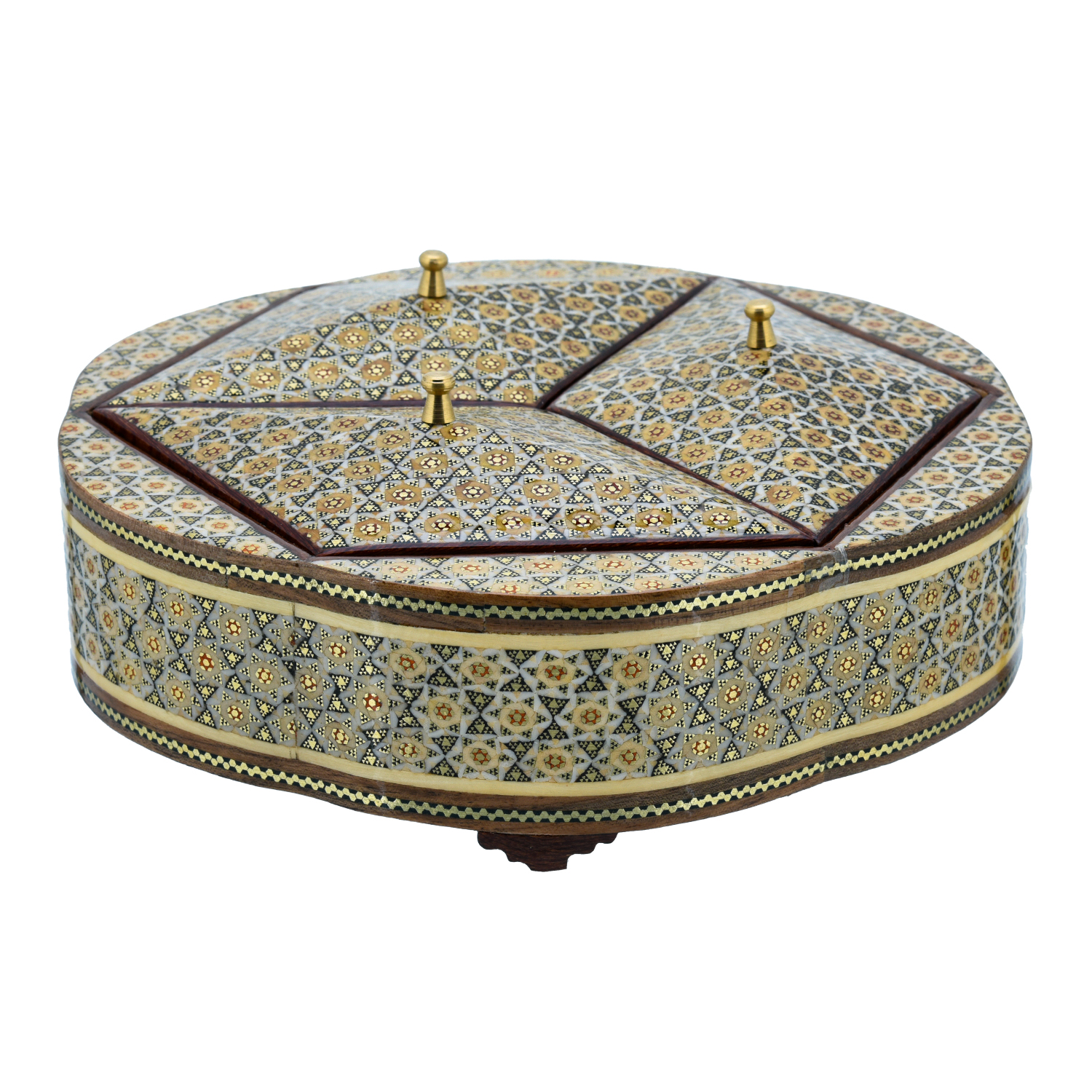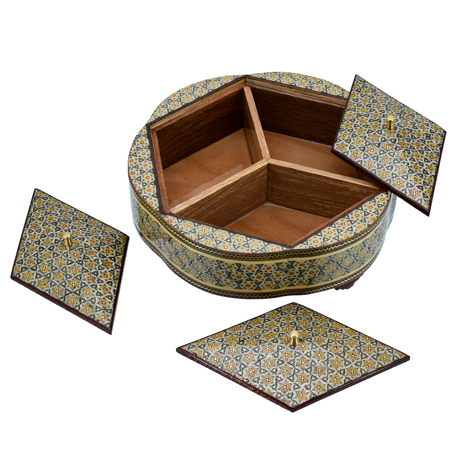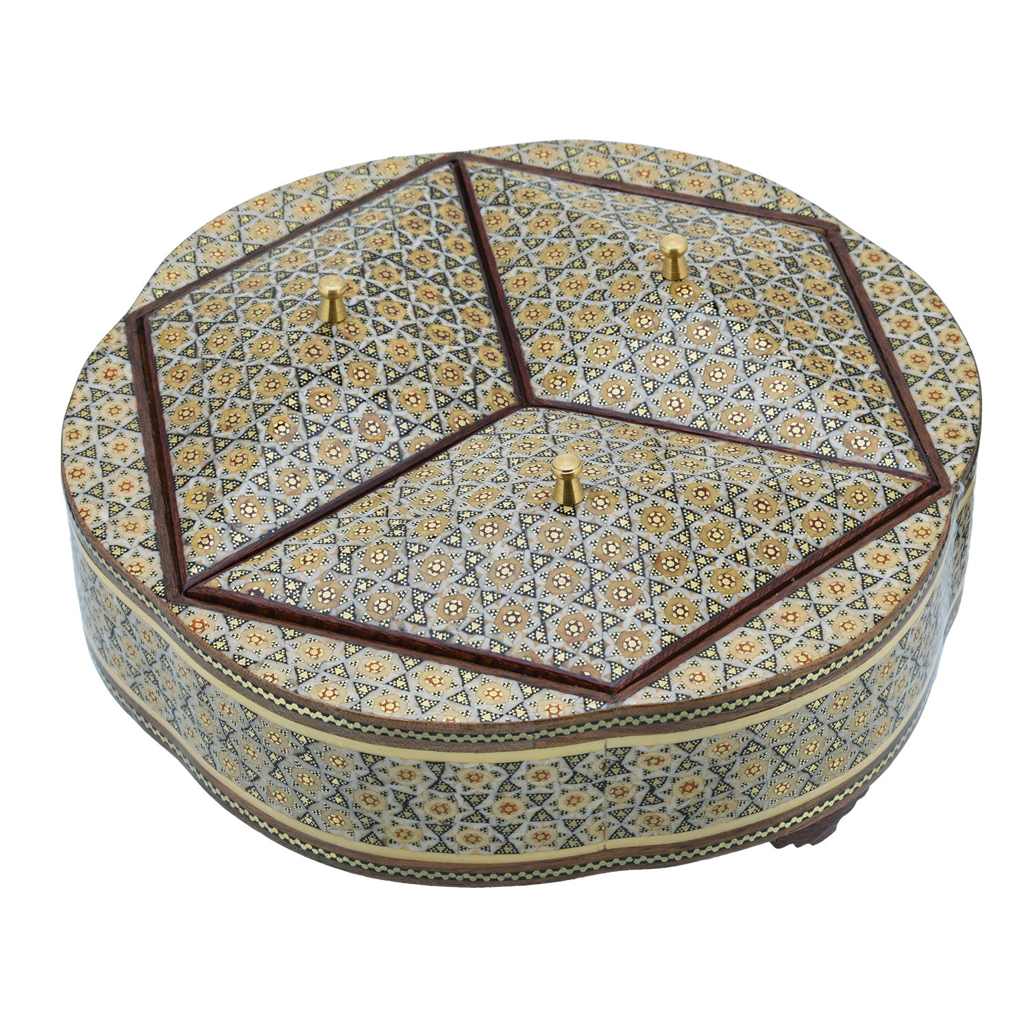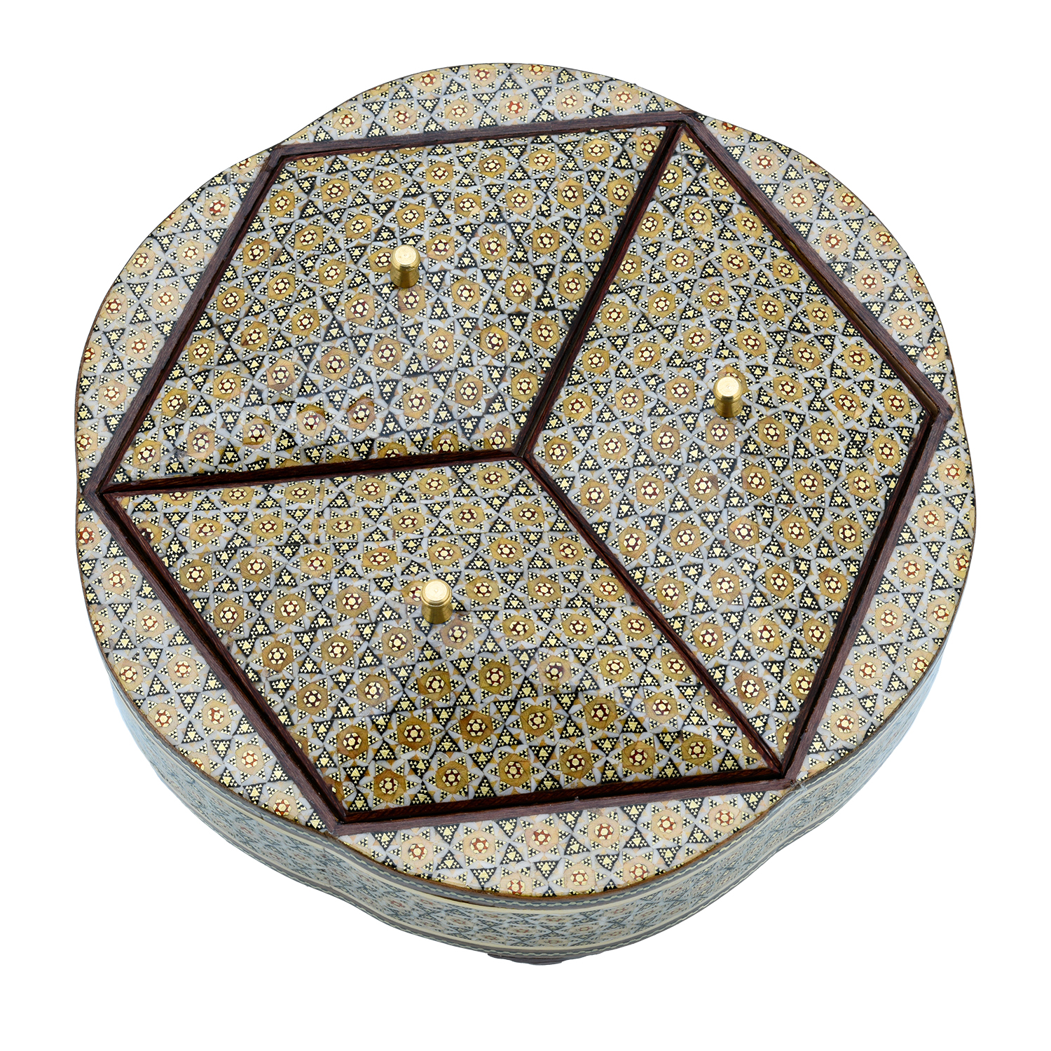Изысканная шкатулка, где функциональность встречает ювелирную метафору: три отдельных отсека, увенчанных резными деревянными крышками, складываются в совершенный гексагон — шестигранник, напоминающий огранку редкого бриллианта. Каждый отсек, словно грань драгоценного камня, украшен Хатам Кари — мозаикой из дерева, латуни и кости, где геометрические звёзды и цветочные мотивы переплетаются в ритме персидских миниатюр.Крышки, инкрустированные тем же узором, что и основа, создают иллюзию единого целого: лишь при ближайшем рассмотрении видно, как мастерски они вписаны в шестигранную форму. Внутри — три гладких отполированных «кармана» для колец, серёг и цепочек, будто ячейки сокровищницы, где каждая вещь обретает своё место.