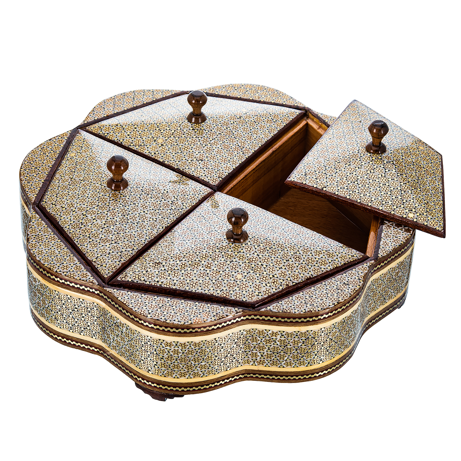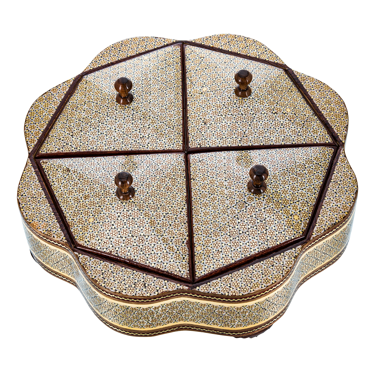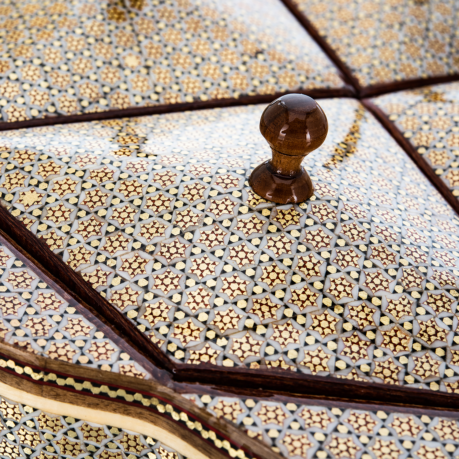 Изысканная шкатулка, где функциональность и искусство сливаются в сакральной геометрии восьмиугольника. Четыре отдельных отсека, увенчанных мозайчатыми крышками, образуют идеальный октагон — форму, символизирующую гармонию и бесконечность в восточной традиции. Каждая крышка, инкрустированная Хатам Кари, украшена мозаикой из дерева, латуни и кости: геометрические звёзды, арабески и цветочные мотивы переплетаются, как узоры на страницах древних персидских манускриптов.При взгляде сверху шкатулка напоминает цветок, а центральная часть - это строгий восьмиугольник, расчерченный на четыре сектора, словно огранка редкого камня, играет бликами под светом. Внутри — гладкие отсеки с бархатной подложкой, где кольца, серьги, браслеты и подвески хранятся с королевским достоинством.