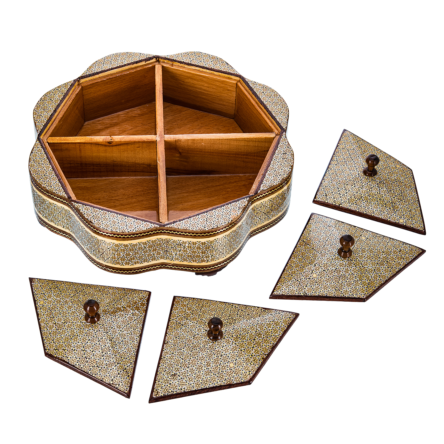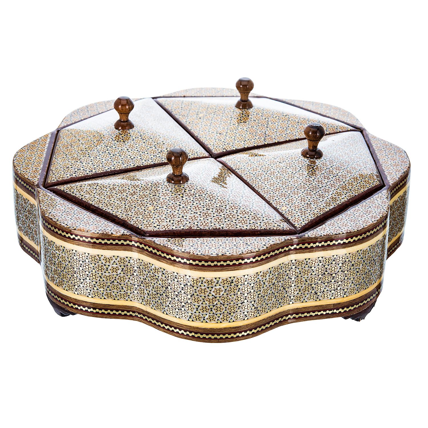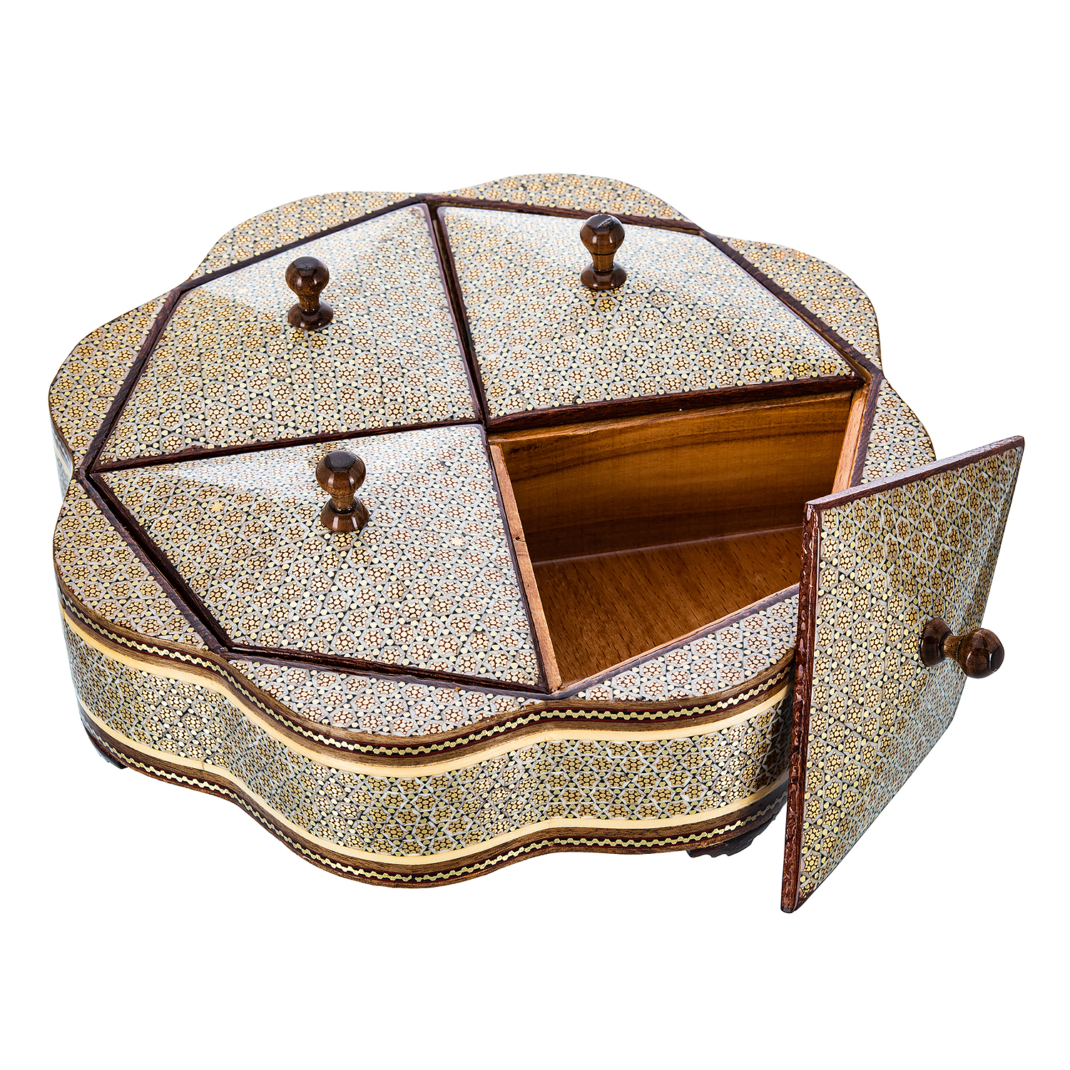 Изысканная шкатулка, где функциональность и искусство сливаются в сакральной геометрии восьмиугольника. Четыре отдельных отсека, увенчанных мозайчатыми крышками, образуют идеальный октагон — форму, символизирующую гармонию и бесконечность в восточной традиции. Каждая крышка, инкрустированная Хатам Кари, украшена мозаикой из дерева, латуни и кости: геометрические звёзды, арабески и цветочные мотивы переплетаются, как узоры на страницах древних персидских манускриптов.При взгляде сверху шкатулка напоминает цветок, а центральная часть - это строгий восьмиугольник, расчерченный на четыре сектора, словно огранка редкого камня, играет бликами под светом. Внутри — гладкие отсеки с бархатной подложкой, где кольца, серьги, браслеты и подвески хранятся с королевским достоинством.