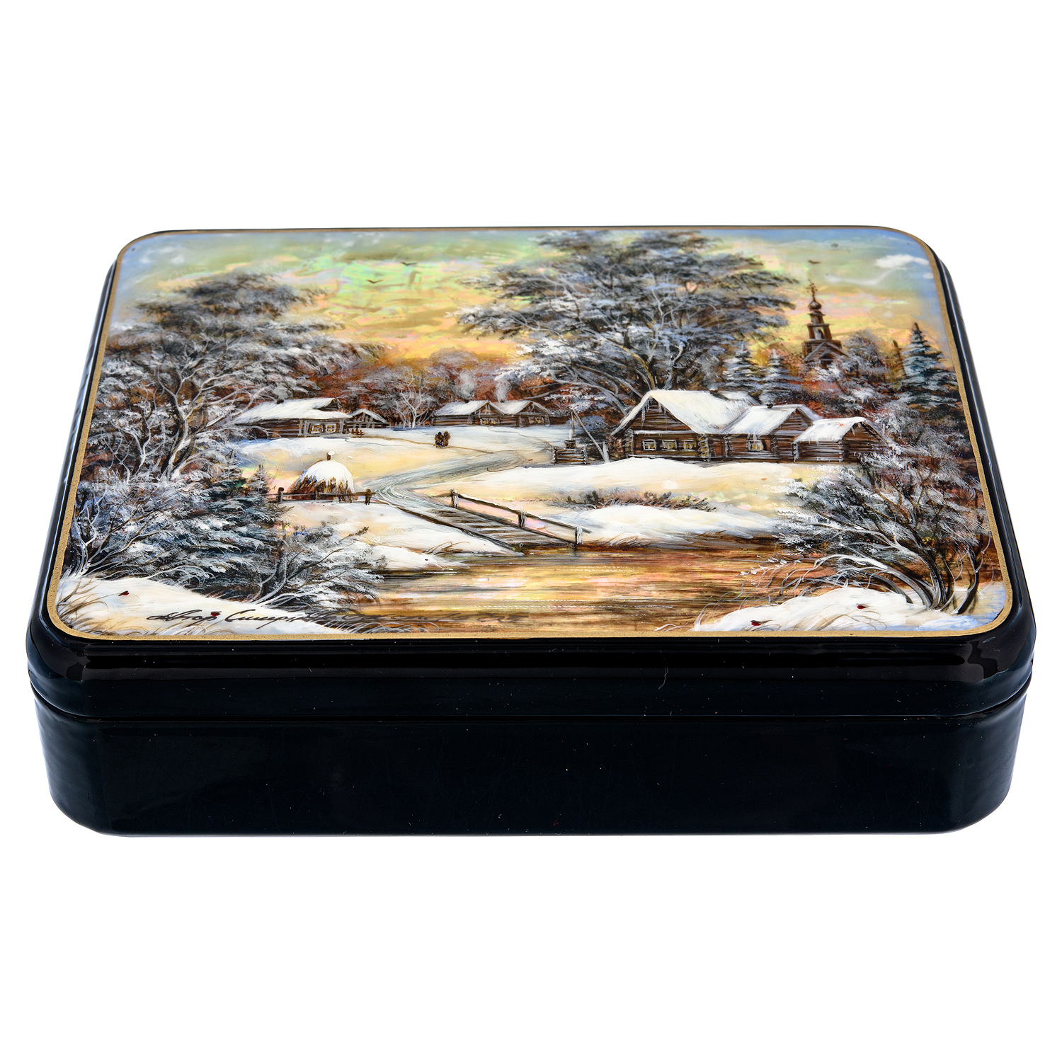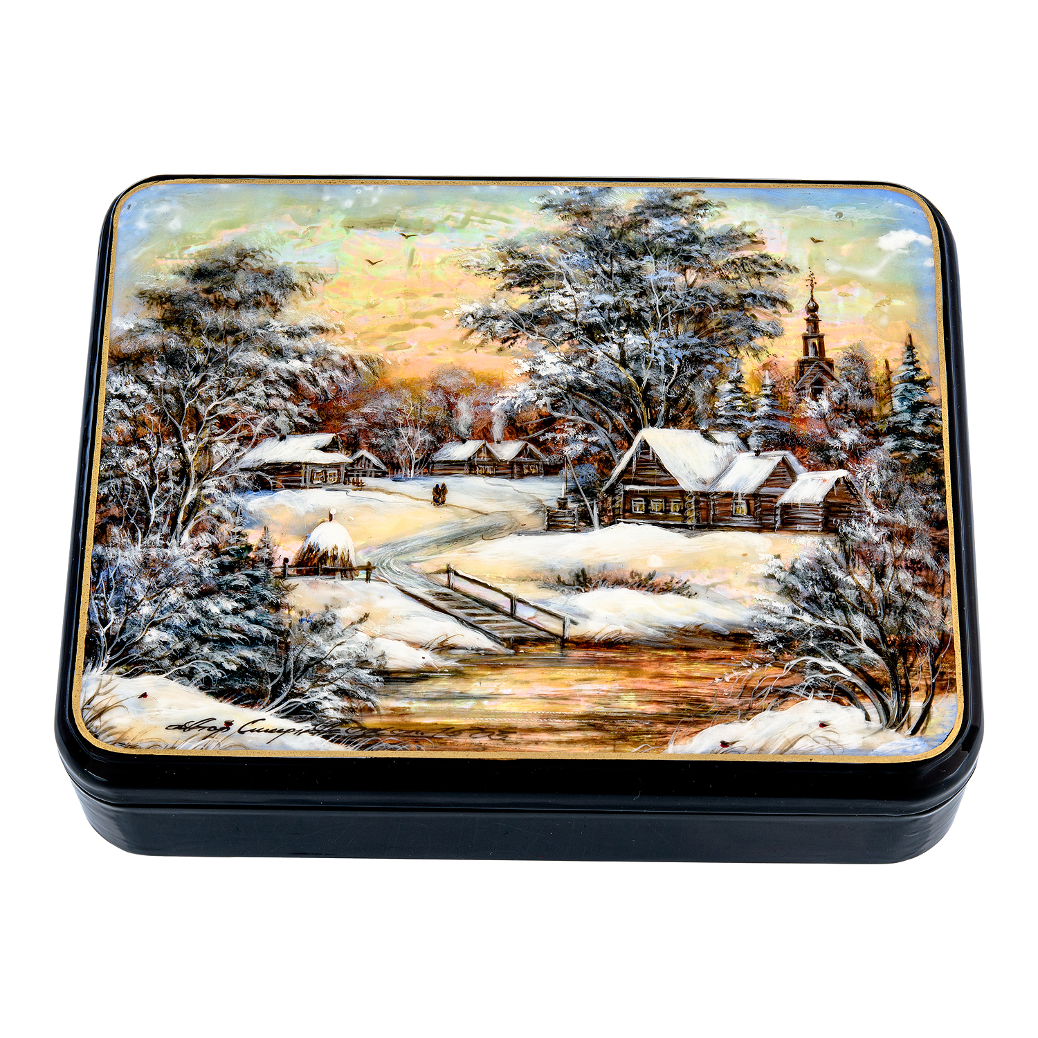 Шкатулка с художественной росписью "Зима в деревне".Материалы: папье-маше, краски, перламутр, лак.