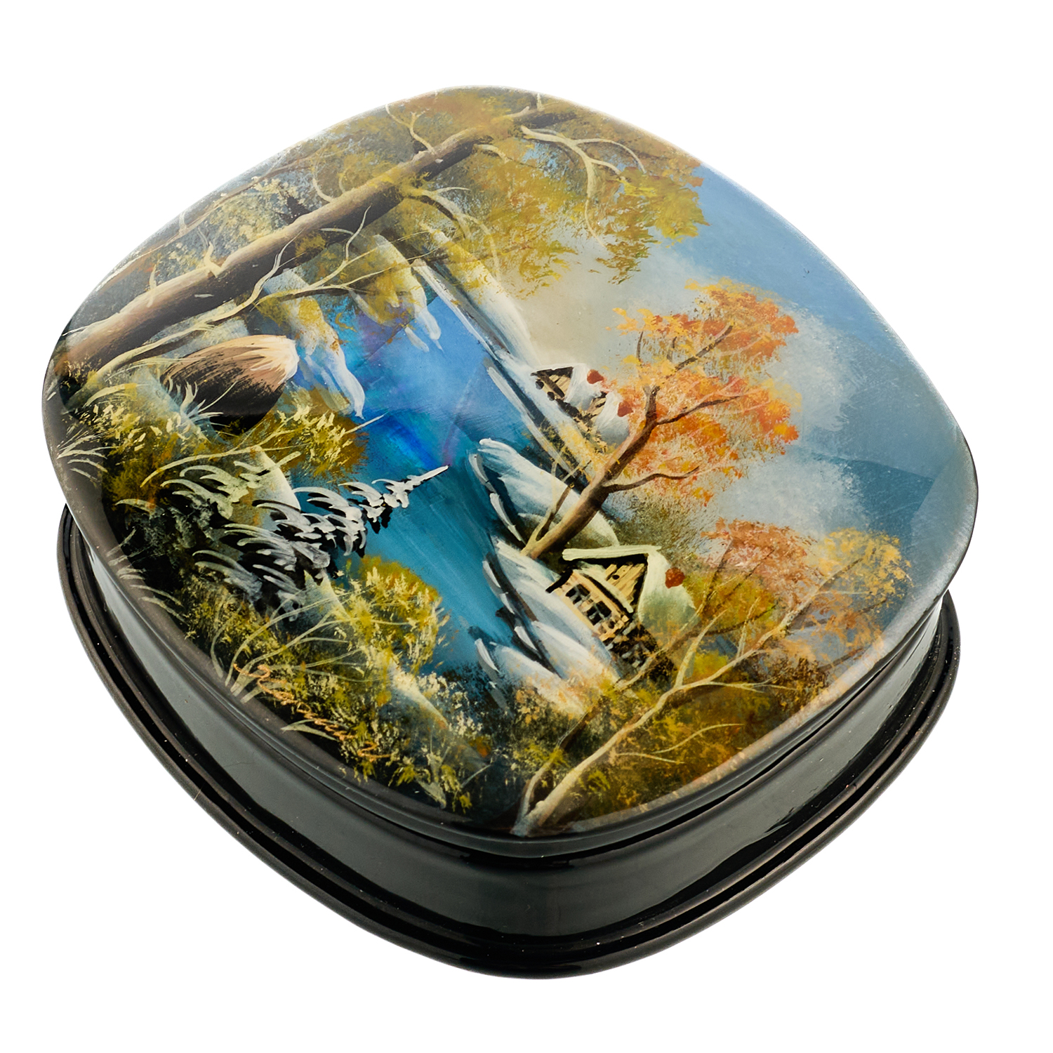 Шкатулка с художественной росписью "Зима в деревне".Материалы: папье-маше, краски, лак, перламутр.