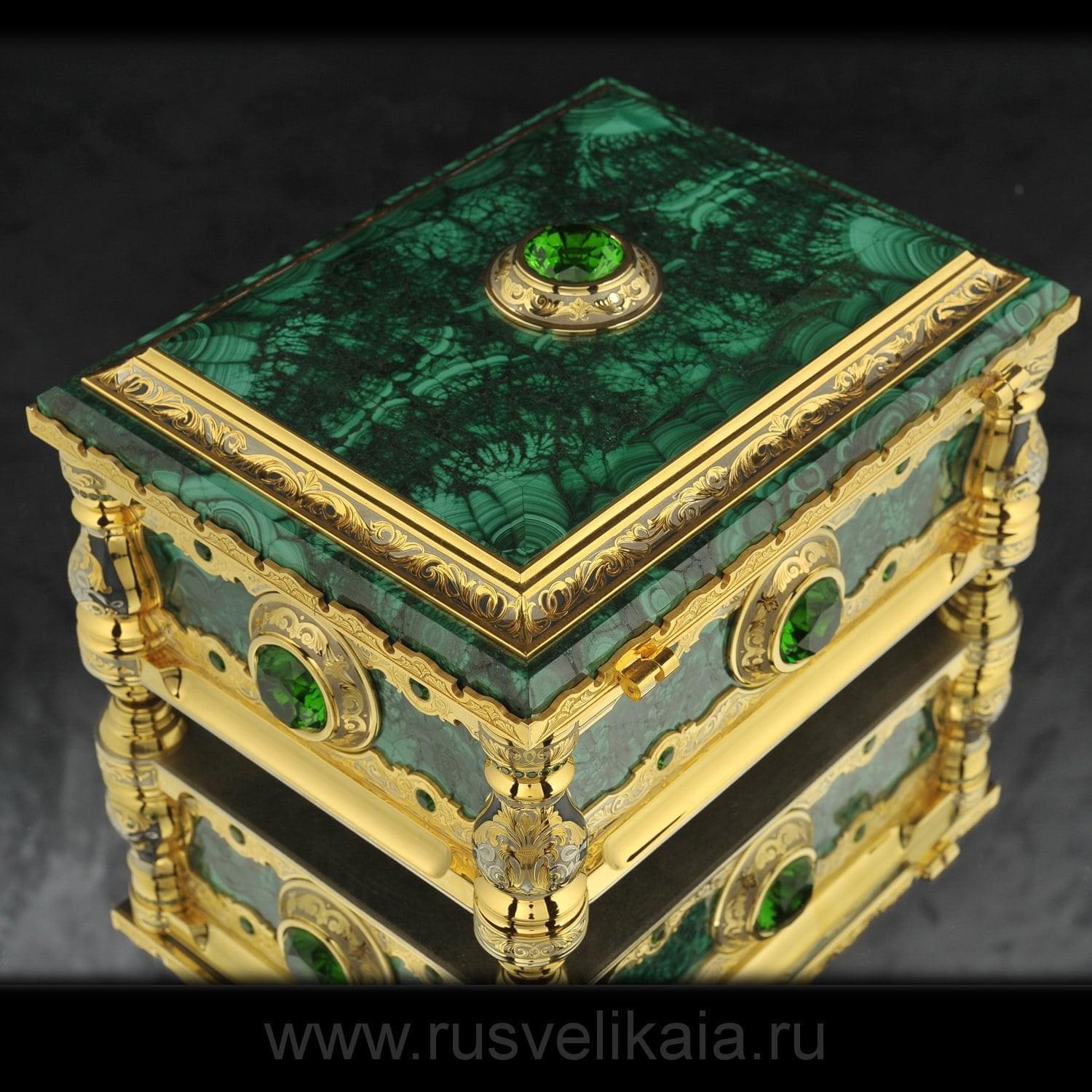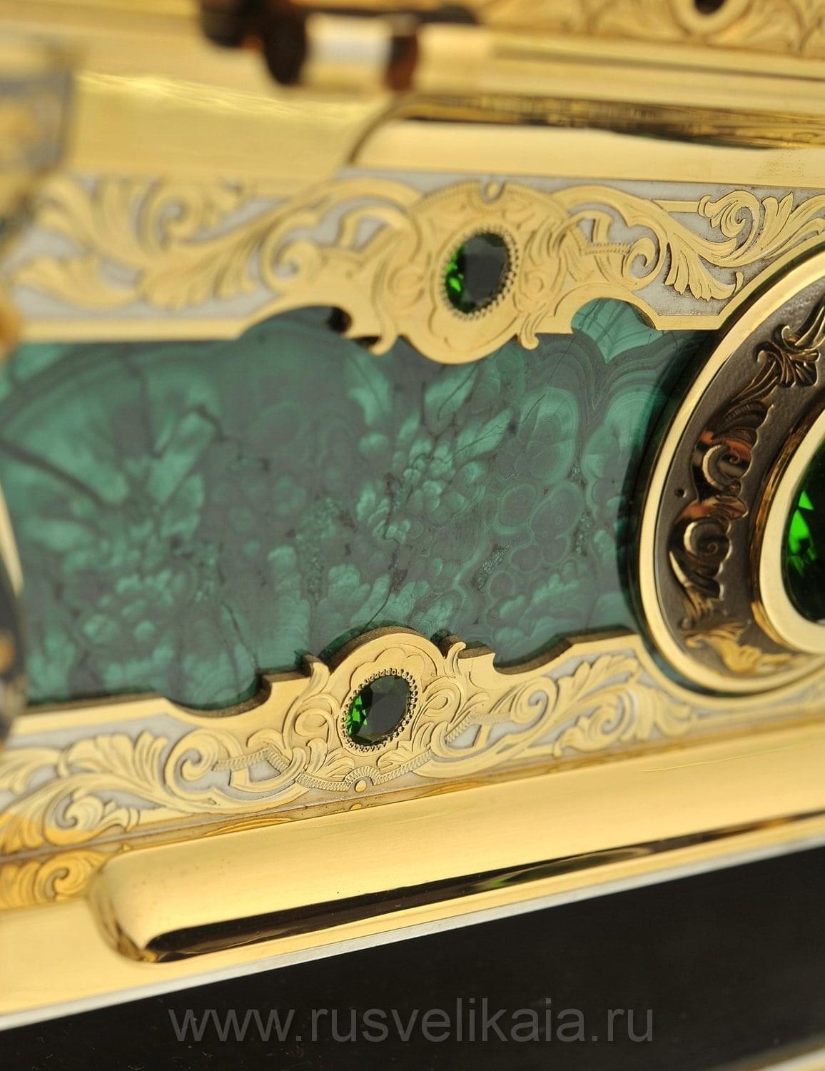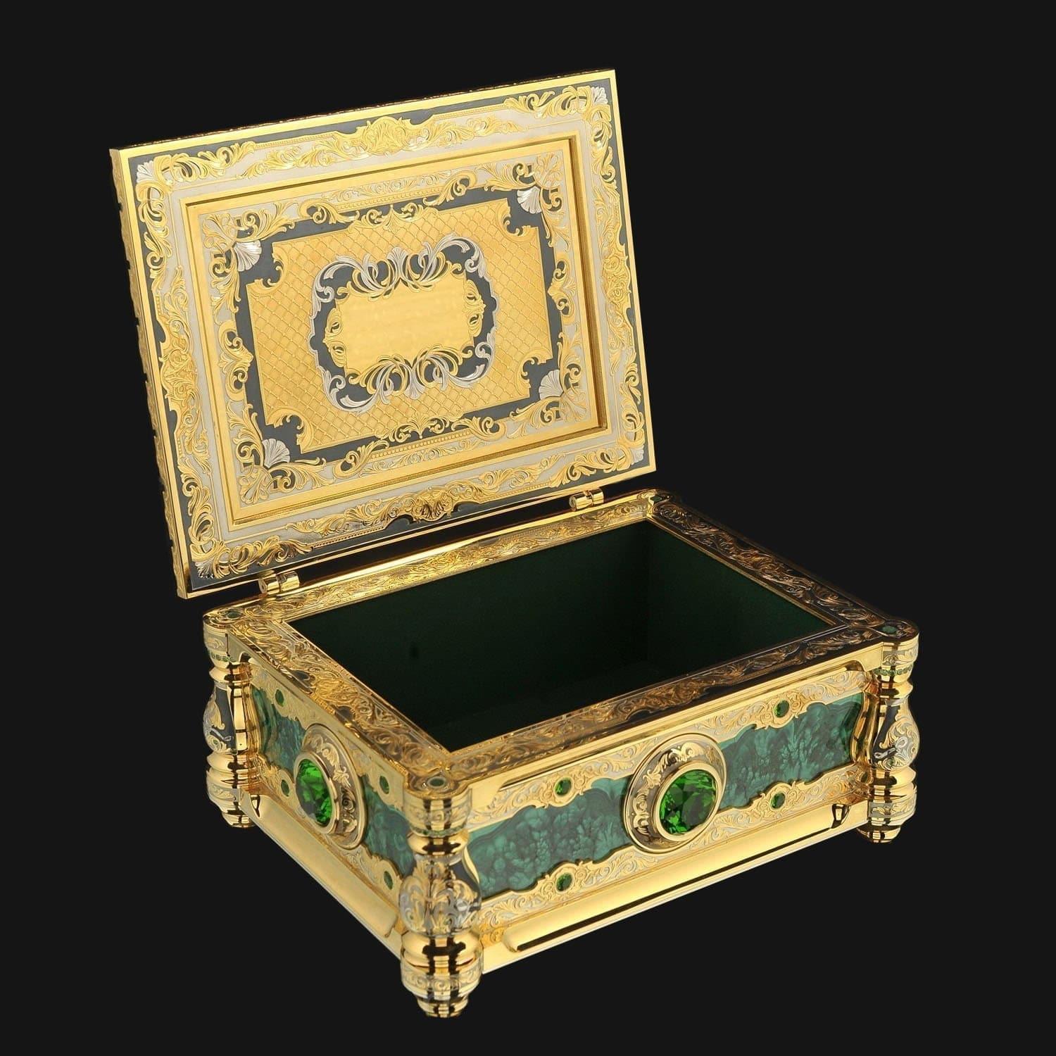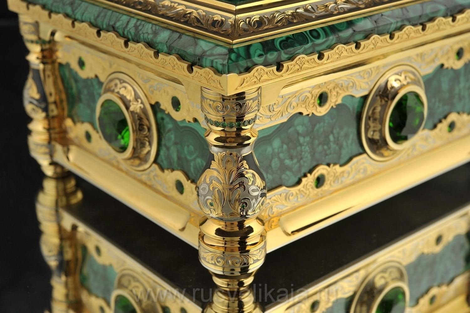 Команда мастеров из прославленного Златоуста не перестает радовать нас новыми идеями и фантастически красивыми работами. Практически каждый день уральские умельцы преподносят новый сюрприз, пополняя тем самым копилку эксклюзивных работ магазина «Русь Великая». Не верите? Убедитесь сами! Одно из самых ярких последних творений команды уральских специалистов прямо перед Вами — эксклюзивный ларец ручной работы из драгоценных металлов, полудрагоценных камней и золотистой бронзы.