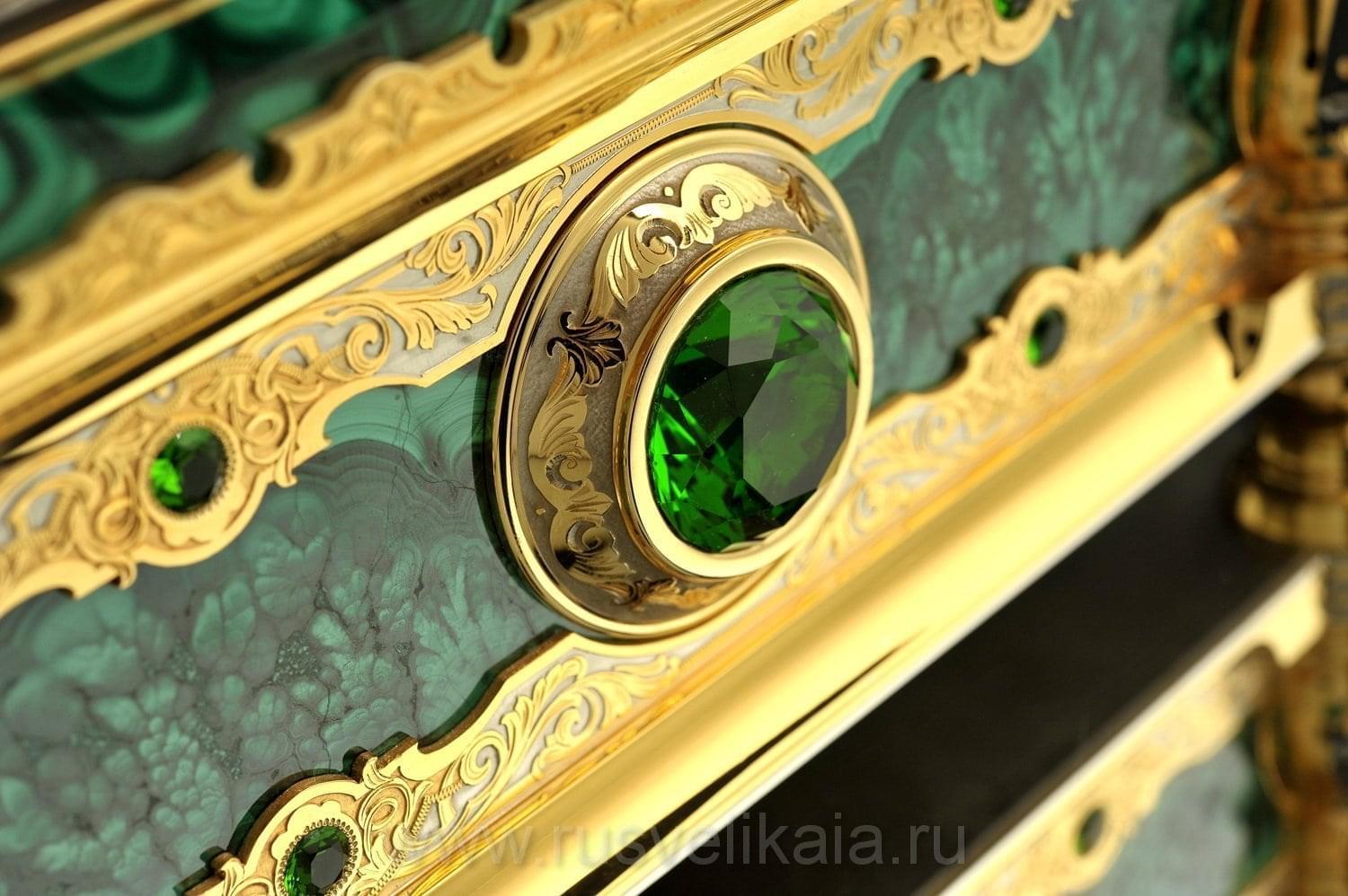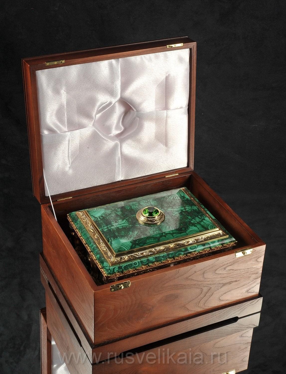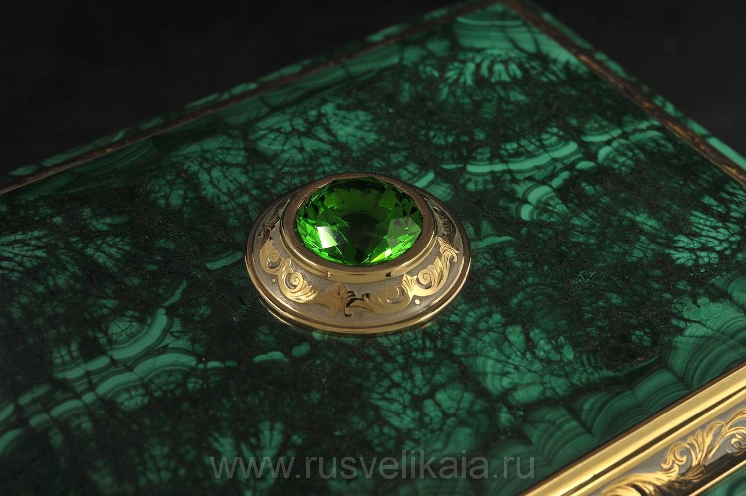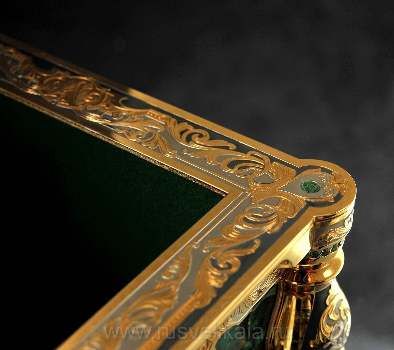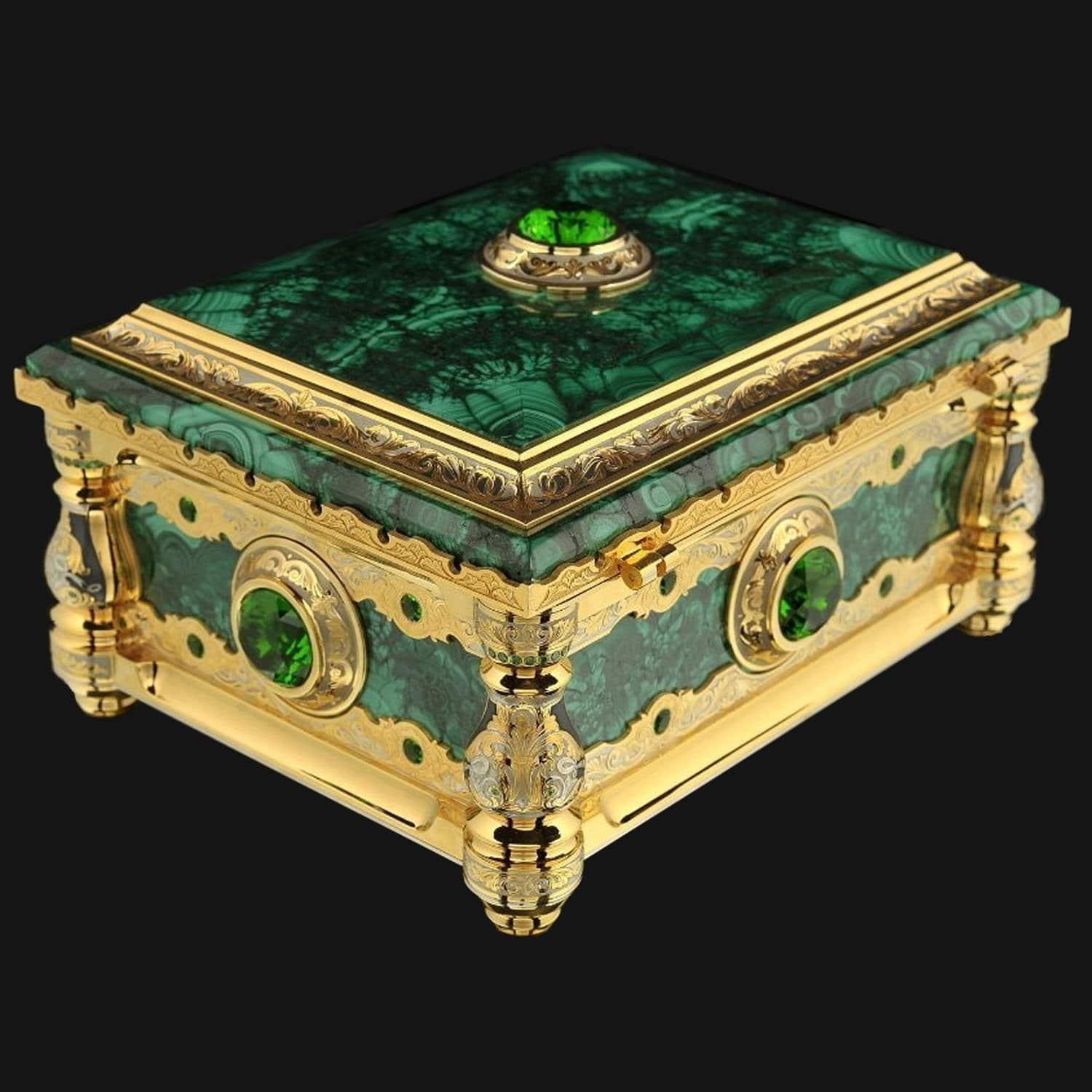 Команда мастеров из прославленного Златоуста не перестает радовать нас новыми идеями и фантастически красивыми работами. Практически каждый день уральские умельцы преподносят новый сюрприз, пополняя тем самым копилку эксклюзивных работ магазина «Русь Великая». Не верите? Убедитесь сами! Одно из самых ярких последних творений команды уральских специалистов прямо перед Вами — эксклюзивный ларец ручной работы из драгоценных металлов, полудрагоценных камней и золотистой бронзы.