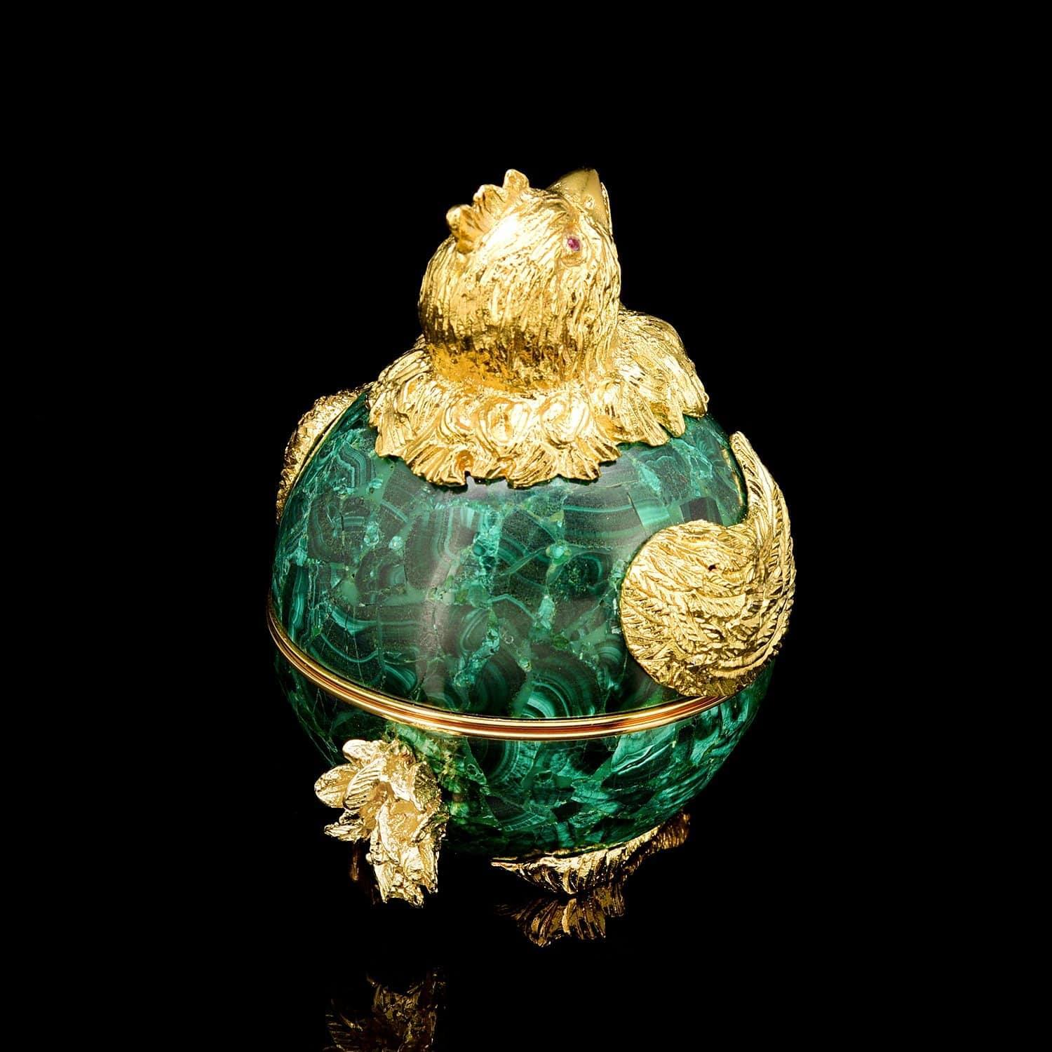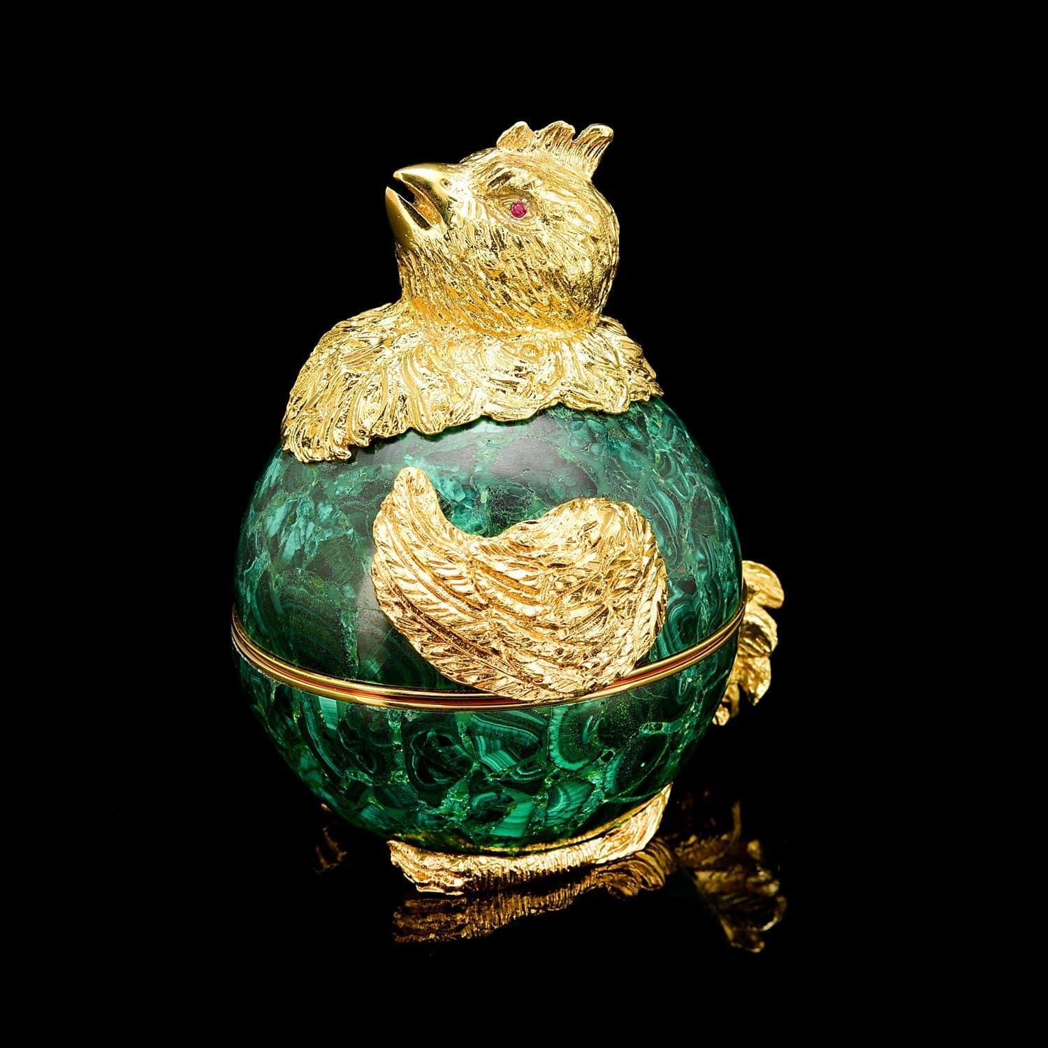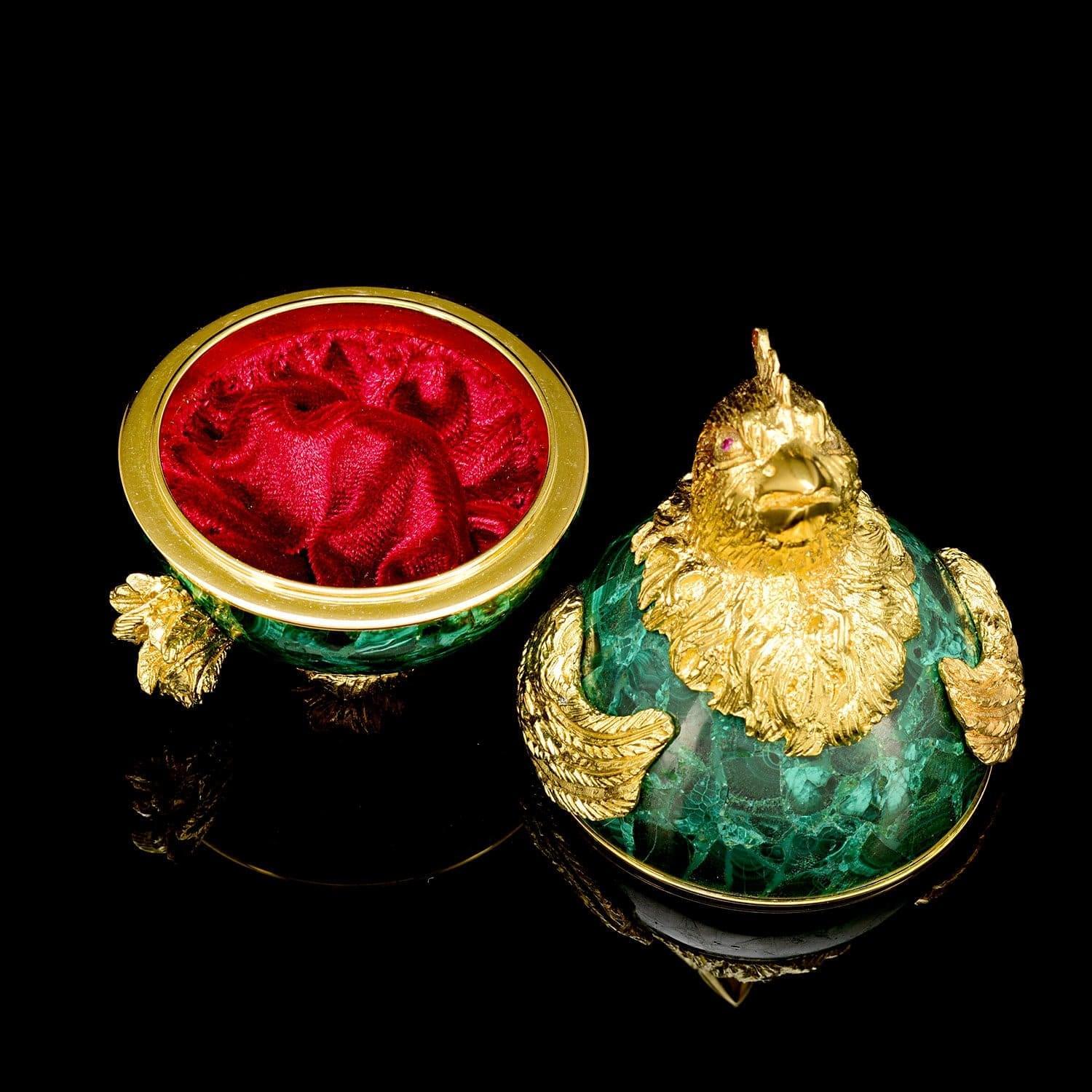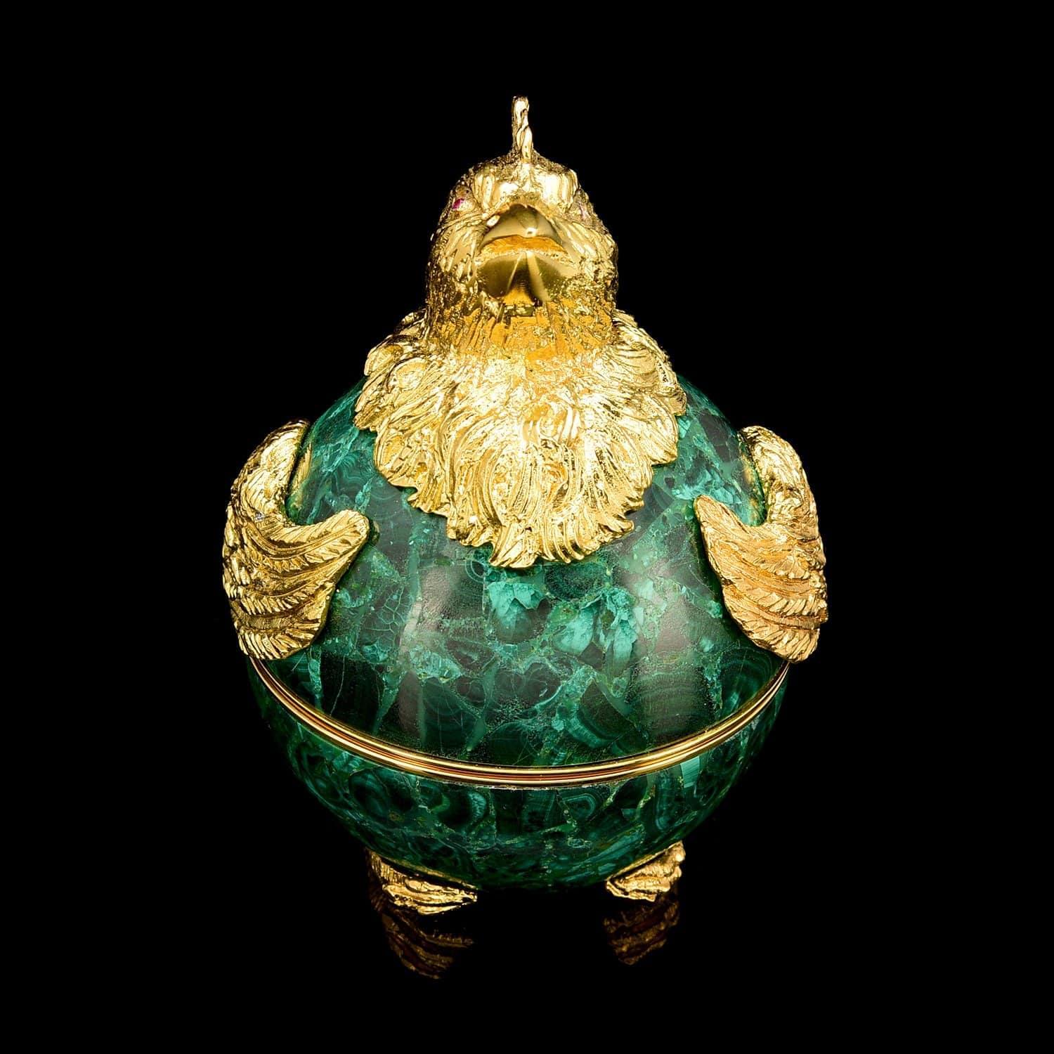 Шкатулка авторского дизайна в виде цыпленка - символа Солнца и духовного возрождения - привносит элегантный и затейливый акцент в убранство классического интерьера. Являясь воплощением авторской фантазии, классики, ее гармонии и изящества, эта маленькая вещь несет в себе эстетику минувших эпох. Яркая позолота в сочетании с насыщенным оттенком натурального камня производит неизгладимое впечатление, как музейный образец прошлой эпохи...