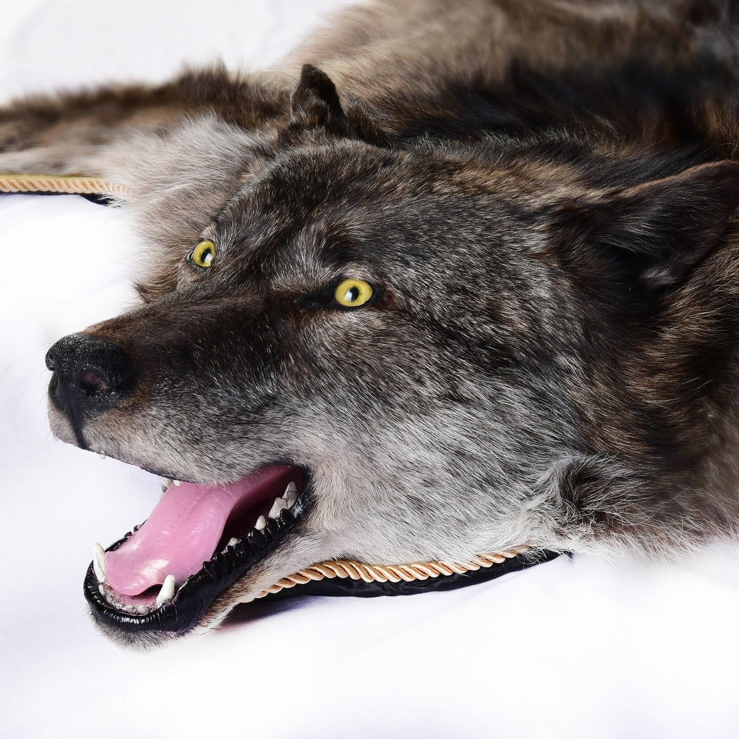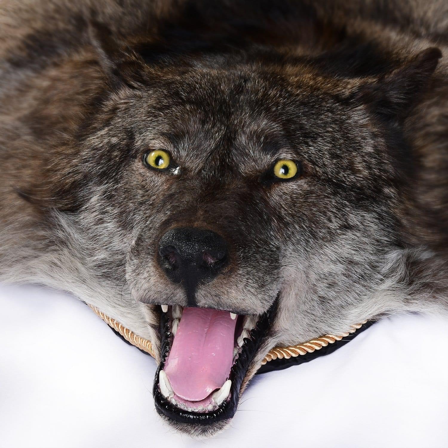 С охотничьего трофея снята шкура, которая впоследствии обработана в соответствии с экостандартами и канонами старинного декоративно-прикладного искусства, таксидермии. Мех сохранил красивый естественный окрас и качество. Для него характерно сочетание длинного жестковатого ворса с мягкой и густой подпушкой. Игра цвета и фактуры делает из шкуры волка стильный, долговечный и практичный интерьерный аксессуар, почитаемый во всем времена.Шкура волка позволяет подчеркнуть роскошное убранство интерьера, насладиться теплом натурального меха и тактильными ощущениями, получаемыми от соприкосновения с ворсом и подкладкой. Голова с распахнутой пастью демонстрирует грозный оскал и прекрасно сохранившуюся на долгие века верхнюю челюсть.