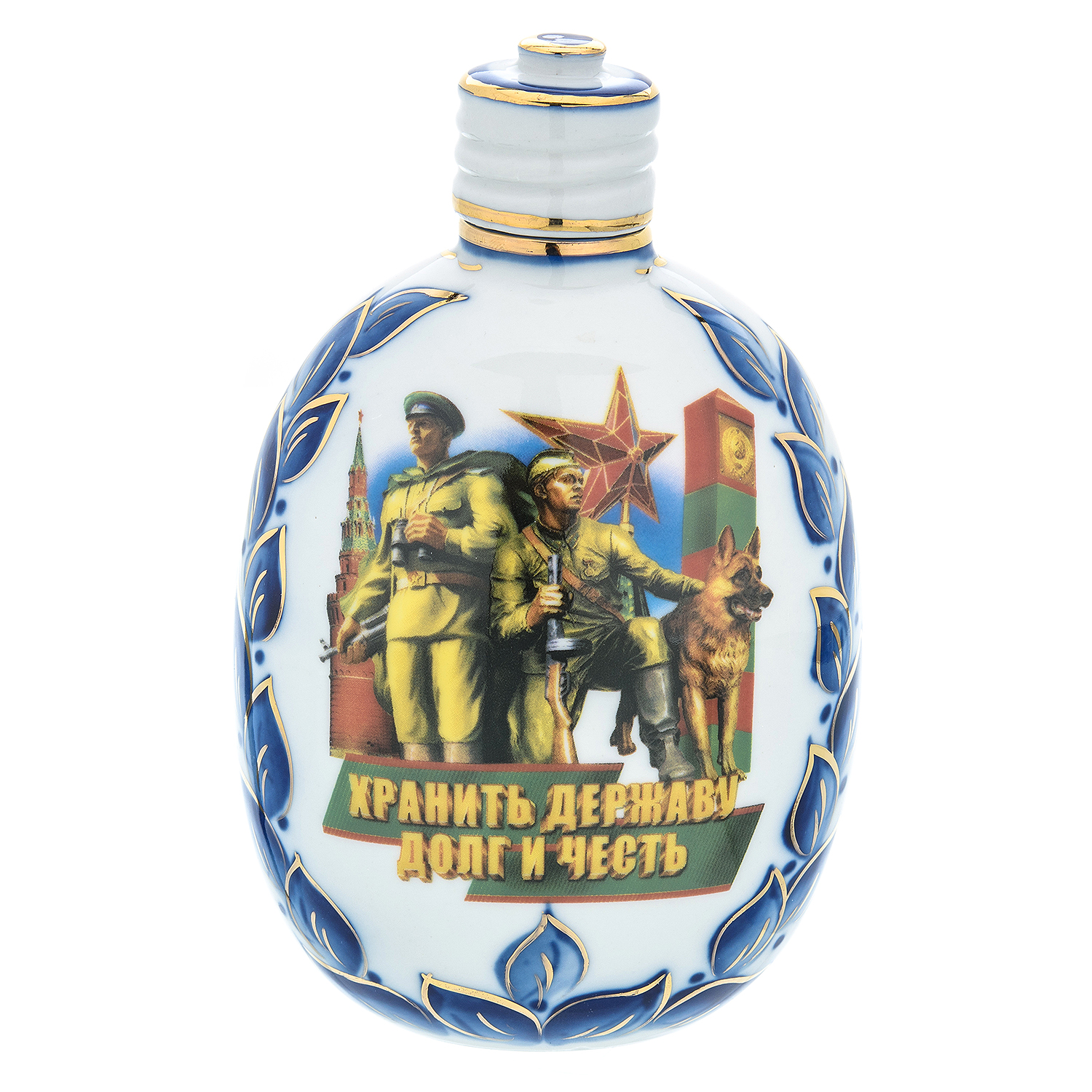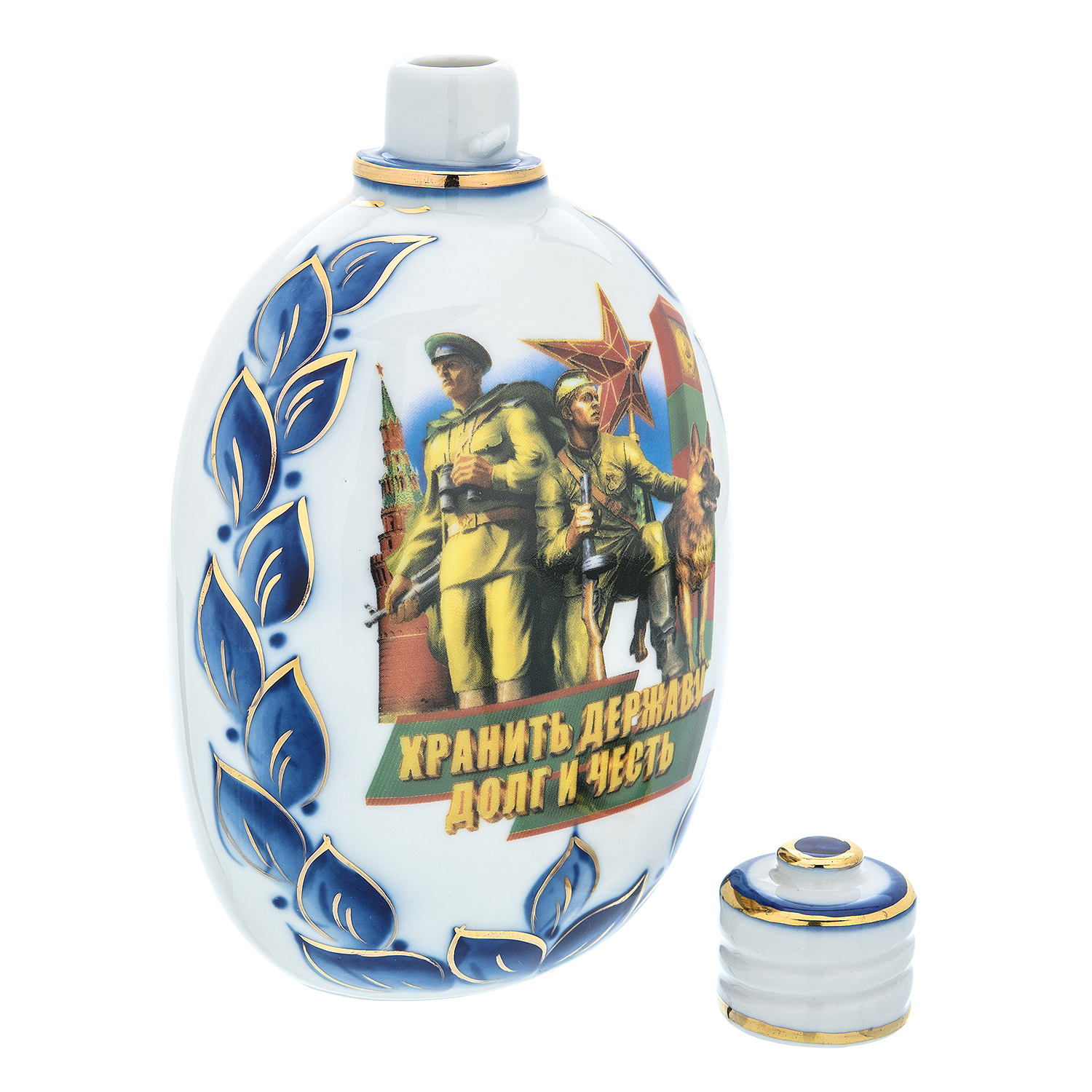 Русские подарки и сувениры → Посуда → Штофы → Фарфоровый штоф-фляжка 0,5 л "Пограничники". Гжель в цвете и золоте