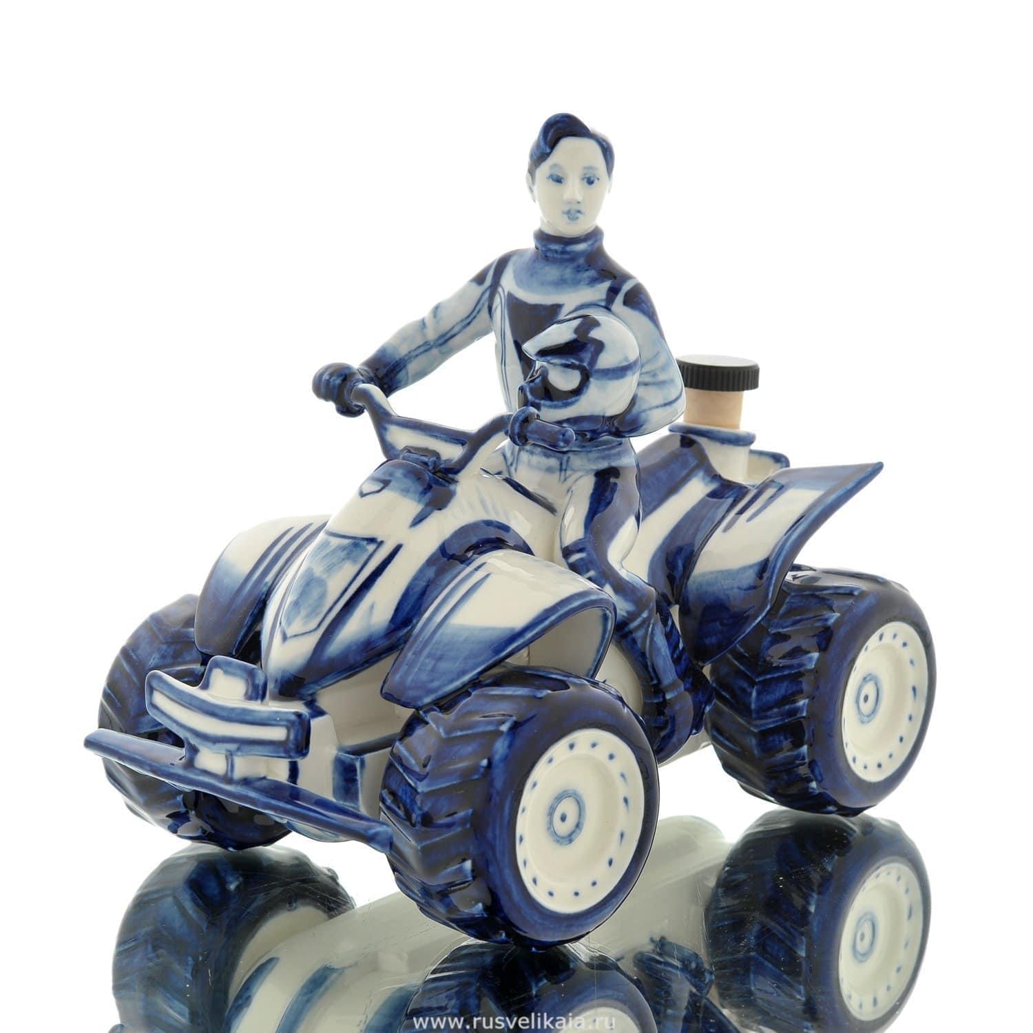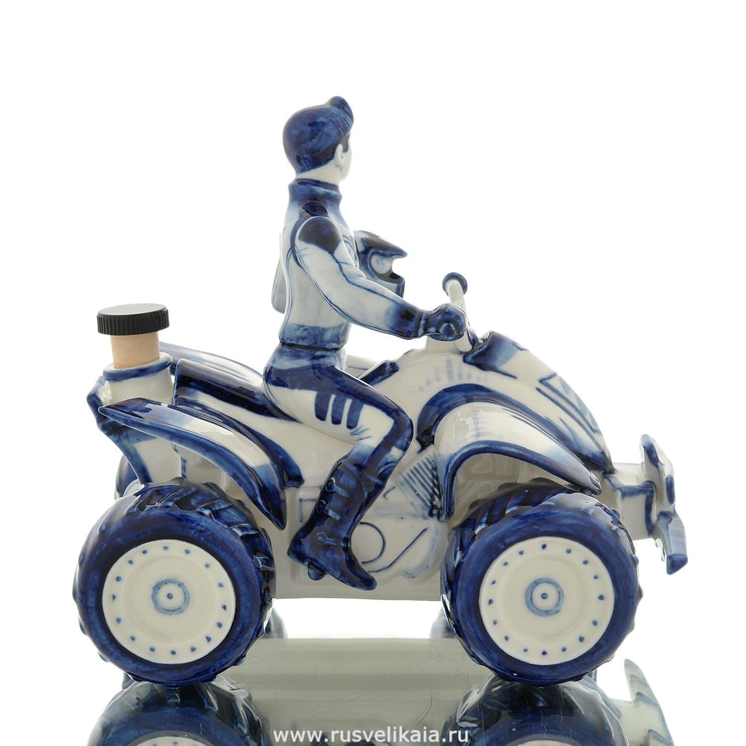 Прекрасным памятным подарком человеку, увлекающемуся экстремальными видами спорта и одновременно неравнодушному к оригинальным аксессуарам для дома, может стать красивый штоф, оформленный в виде квадроцикла. Работа создана из качественного фарфора и расписана вручную гжельским художником в лучших традициях этого старинного искусства.