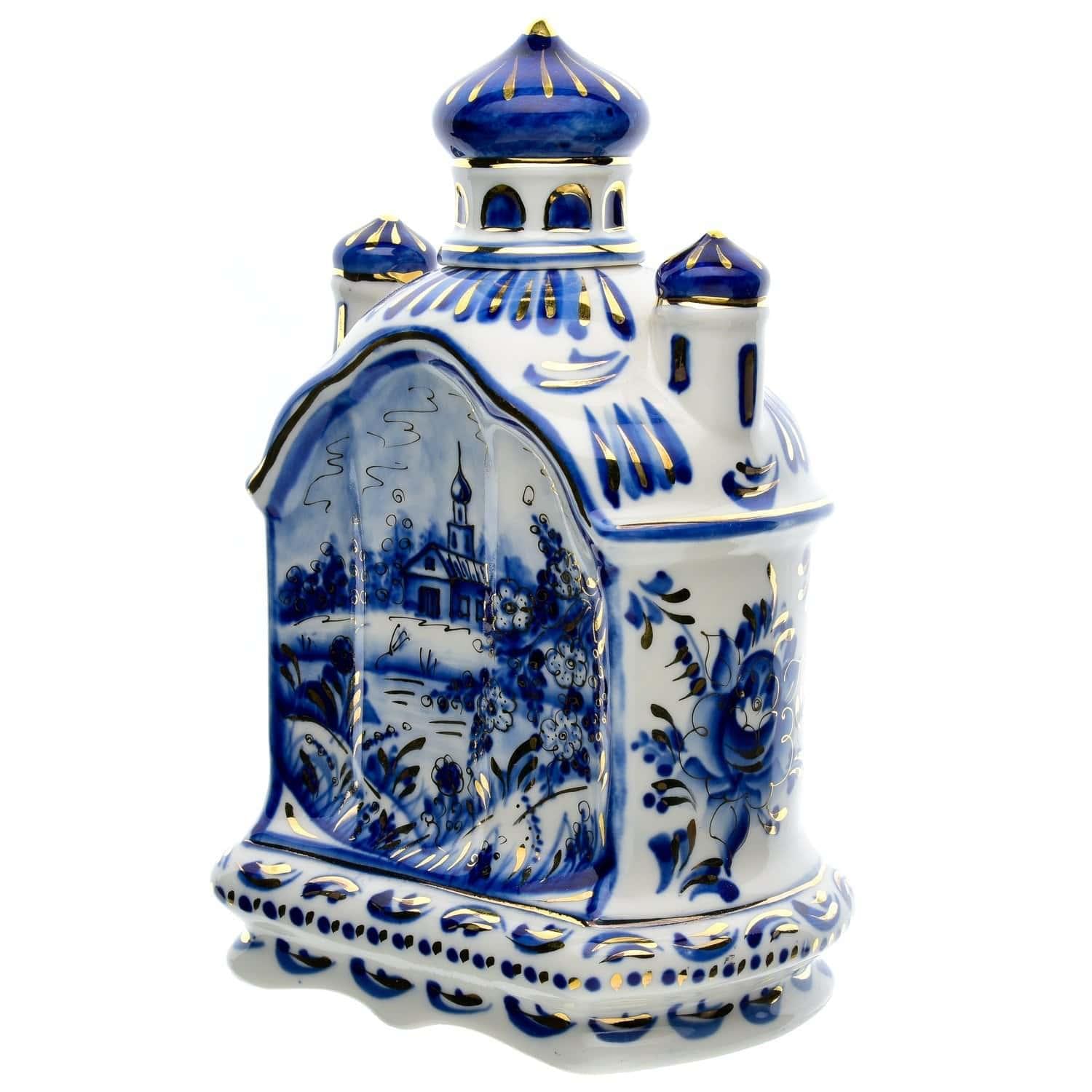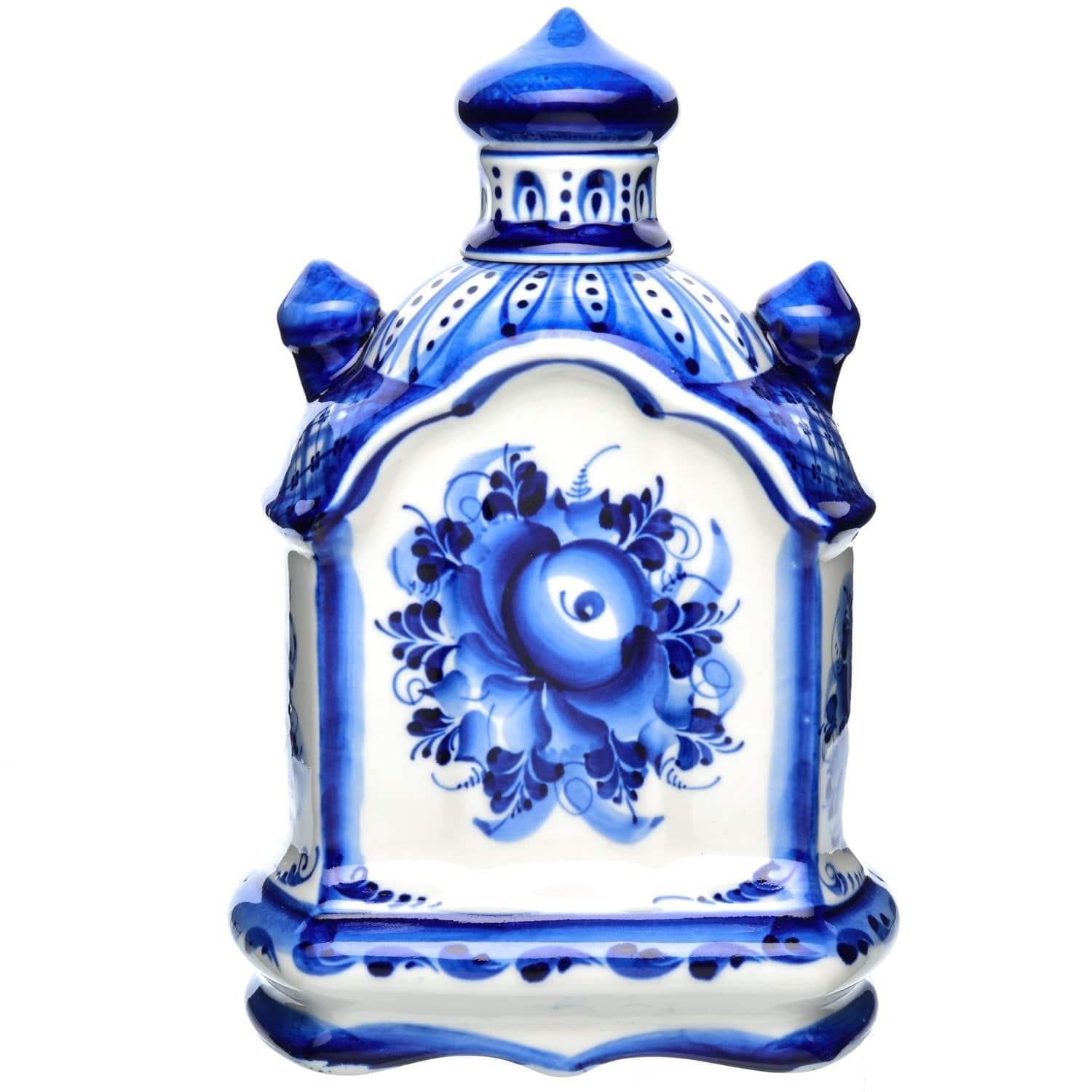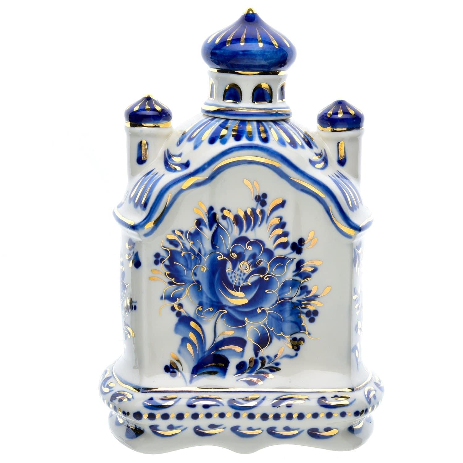 Дизайнерский штоф в форме образца русского зодчества - просто чудо и настоящий сюрприз! Это еще один авторский образец народного промысла, который уже несколько веков процветает на территории двух бывших губерний, Броннницкой и Богородской, богатых высококачественной глиной белого сорта.Фигурный корпус штофа с куполами изготовлен по авторскому эскизу гжельским гончаром из твердого фарфора, называемого "русским белым золотом", Изделие является оригинальными интерьерным аксессуаром. Оформление фарфоровой поверхности выполнено вручную в технике свободной кистевой росписи посредством окиси кобальта - главной краски гжельских художников, которая после обжигов в печи при сверхвысоких температурах приобретает синий цвет с более чем 40 его оттенками.