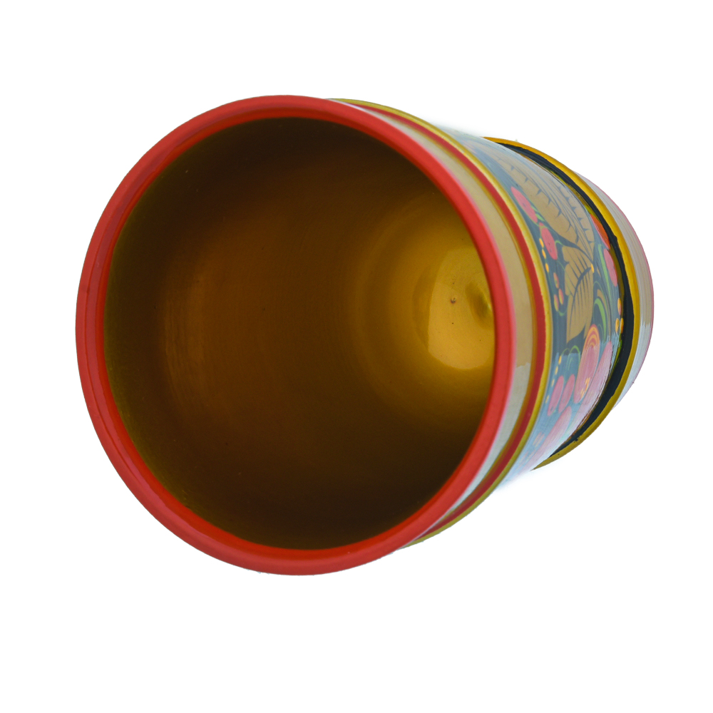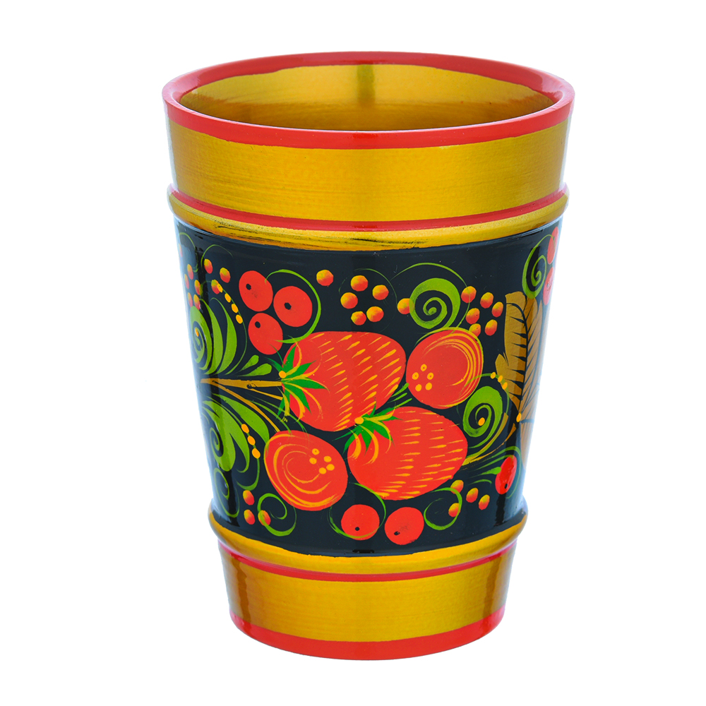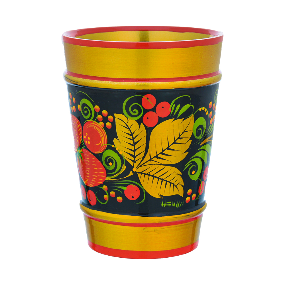 Из этого стакана можно пить даже горячий напиток. Его можно мыть. Краски, использованные для росписи, и лаковое покрытие гипоаллергенны. Типичное изделие - от хохломских мастеров, которые уже 4 век подряд создают посуду и предметы домашней утвари. Корпус стакана выточен из твердой и легкой древесины, липы и расписан в старинной технике свободно-кистевой росписи, берущей начало в русско-византийской иконописи. Роспись выполнена по черному фону в несколько этапов, с предварительной обработкой поверхности дерева посредством жидкой глины, серебристого порошка и олифы. Напомним, что истоки хохломской росписи - в русско-византийской иконописи, а первыми расписывать деревянную посуду в описанной технике стали русские монахи, жившие в монастыре на берегу реки Волга под Нижним Новгородом.