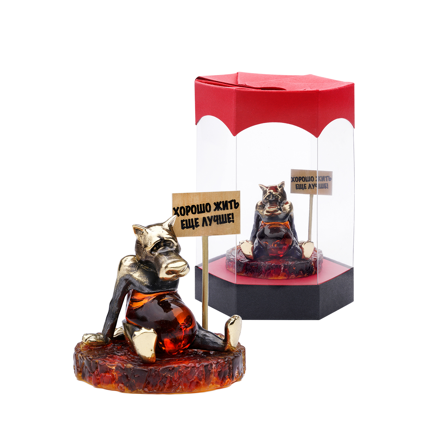 Русские подарки и сувениры → Интерьерные изделия → Статуэтки → Бронзовая статуэтка на янтарной подставке "Волк. Хорошо жить - еще лучше!"